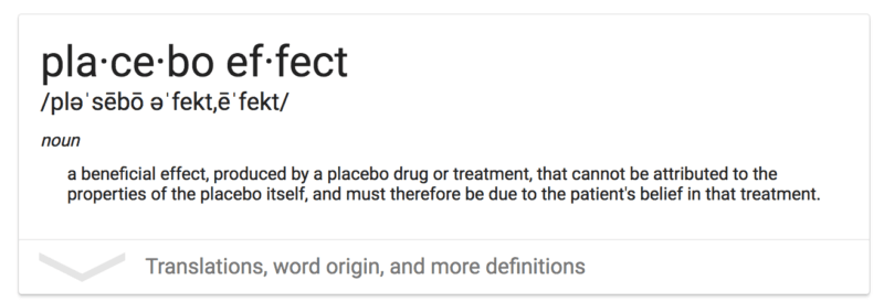 The “Placebo Effect” or outcome, is “a beneficial effect, produced by a placebo drug or treatment, that cannot be attributed to the properties of the placebo itself, and must therefore be due to the patient’s belief in that treatment.”