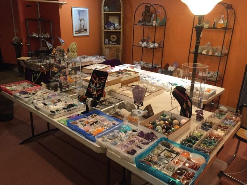 I have a history of shop owning – having had 2 stores in Boston’s primary retail districts – Harvard Square and Newbury Street. The last one I left in 1992, fully 25 years ago. It’s crazy that I should be going back into retail, I told myself I wouldn’t. That’s not entirely fair, because I’m certainly in retail, having gotten back into Crystals more full time since 2012 (5 years ago now). What was different this time around, was that I made my own hours – saw people when I wanted to – and could disappear on vacation for weeks on end (without guilt). What I dread is being trapped in one place all day – being subjected to whomever happens to walk in the door (not always a pleasant interaction) – and having my fortunes tied to the weather. Retail ain’t easy! I also learned a major life lesson when I started the magazine (Rhythm Music Magazine) – also 25 years ago, in 1992 – and that is that when you start a venture for some 3rd goal (you know: “the ends justify the means”), the vehicle end up becoming the destination (the be all, end all)…and the end may end up lost in the means. In other words, I thought I was gonna promote my music by having a publication, but publishing itself became the monster, and it took up all my time (which is why I let it go 5 years later). Last time (as you can see from the photo above, of which I have precious few from the time) – I was selling international clothing and jewelry (as well as music and art) – while my father, my parents really, had been diplomats…and were representing the U.S. to the rest of the world. You see I fancied myself (perhaps not consciously, at the time) representing the rest of the world back to the U.S. as a sort of reciprocal service to that my folks had provided. But the product itself did not have any intrinsic meaning (aside from being ethnically relevant and interesting). This time, the product is front and center – and very much has meaning – which I’ll convey by organizing it in a way that people can immediately understand. They should know, without too much research, “what stone stands for what.” My wife Nina Manolson, actually encouraged me to make the Crystals central to the venture. Even though our spot has additional functions – which include providing space for healers and artists – it’s primarily a Crystal Gallery.