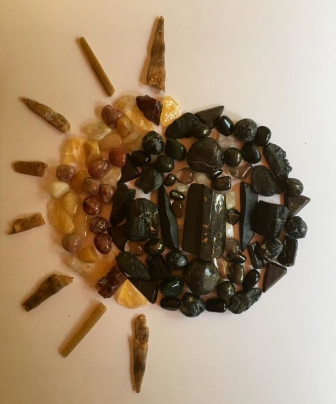 Array by friend and colleague Sara Cope: “…this is what manifested for me out of this New Moon Solar Eclipse. A vision of the Full Moon Dark overtaking the sun, the energy of the Divine Feminine and the Mirror.”