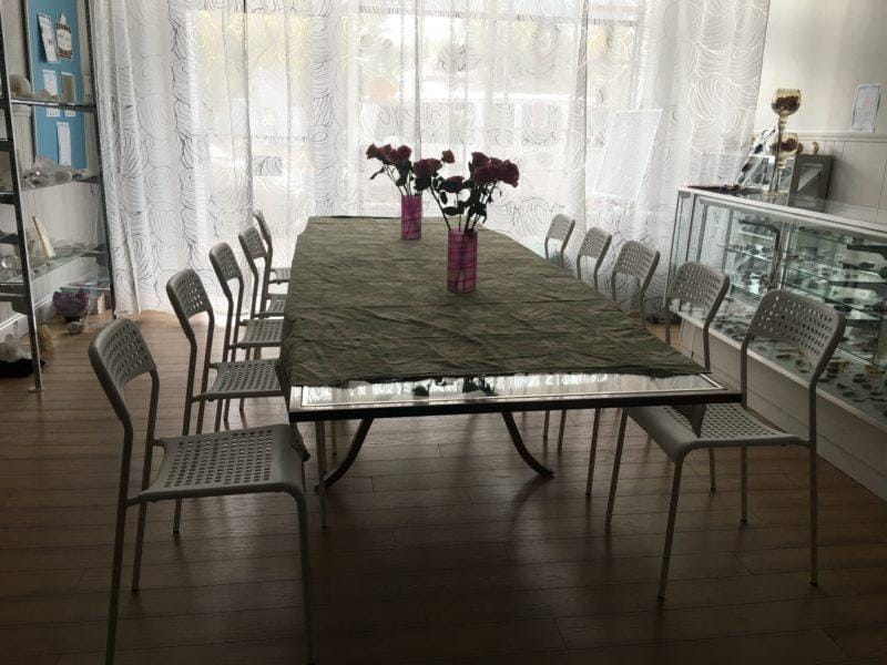 Preparing the store is not without its work – we have to clear the front table – chairs are set around it for our various banquets. Other fixtures are moved to the side, and the floors are cleaned thoroughly (so people can walk barefoot and feel good about lying down on their yoga mats).