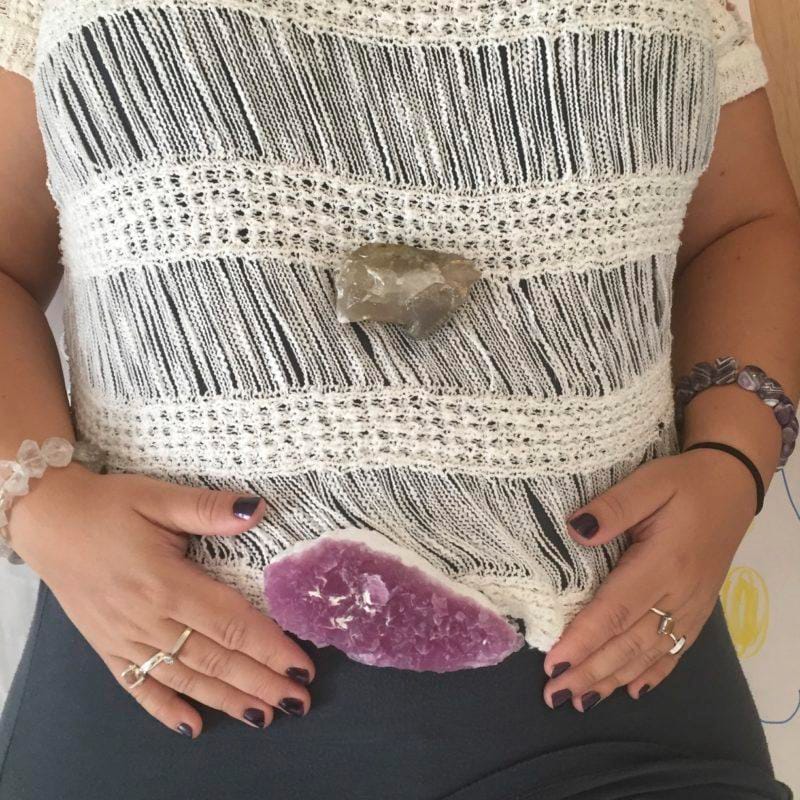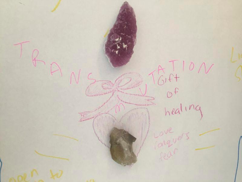 Stones were integrated (laid out on paper and person) – the very ones we had been working with – to appropriately deliver the right energy to the right parts of our new and improved bodies.