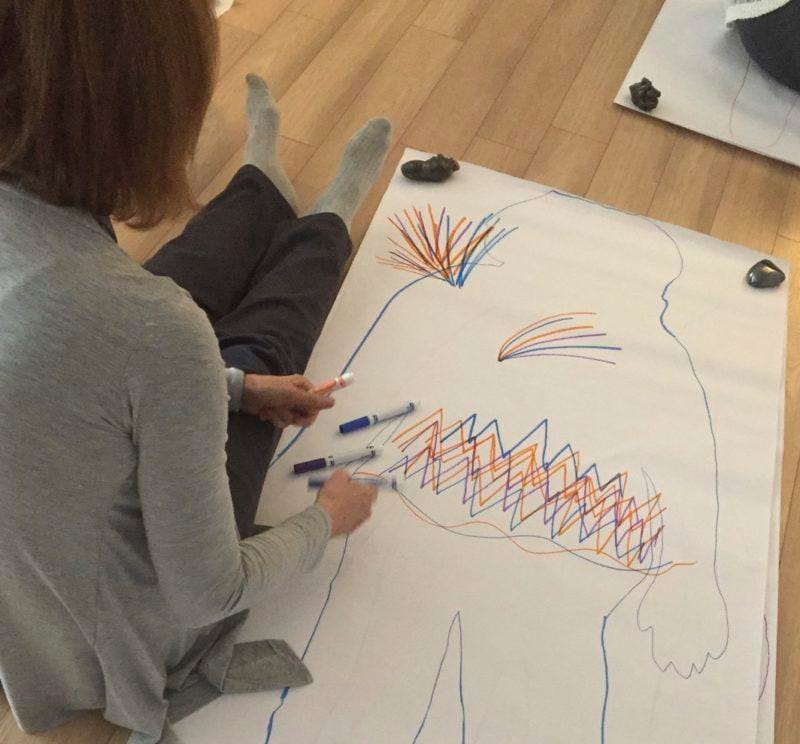 More meditation had us sink into what it was we wanted to project, to take out of our personal experience, and draw onto the surface of our own body outline.