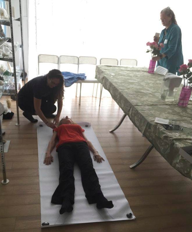 Yoga mats spread out in the main Gallery, with Nina Manolson explaining Body Current Movement to attendees.