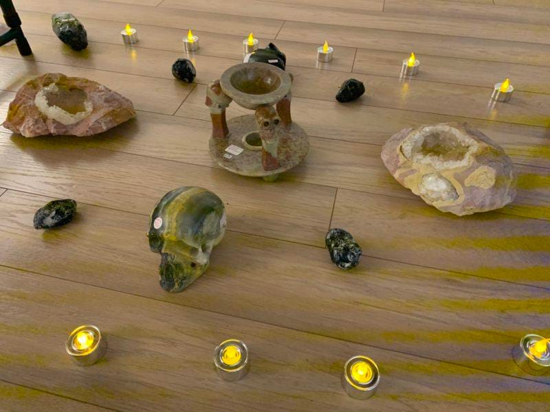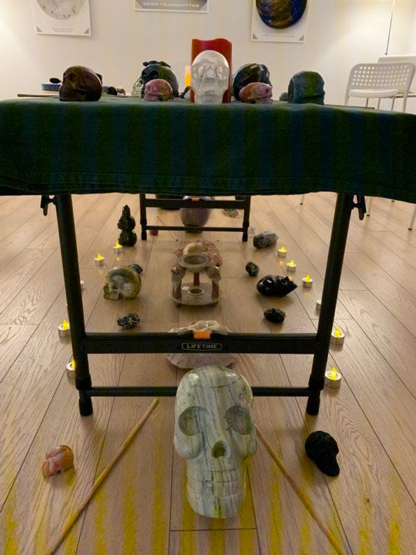 The evening began with 11 of us gathered in an elliptical circle, with me on one end, and the other end open, to ‘let the energy out.’ A reason I’d chosen to do the event upstairs was that it’s more open and continuous to the outside world. I didn’t want whatever energies which may have been released to be bouncing around in a more enclosed space that we use all the time. Most people associate skulls with spooky energy, and I didn’t want that to get the better of us.
