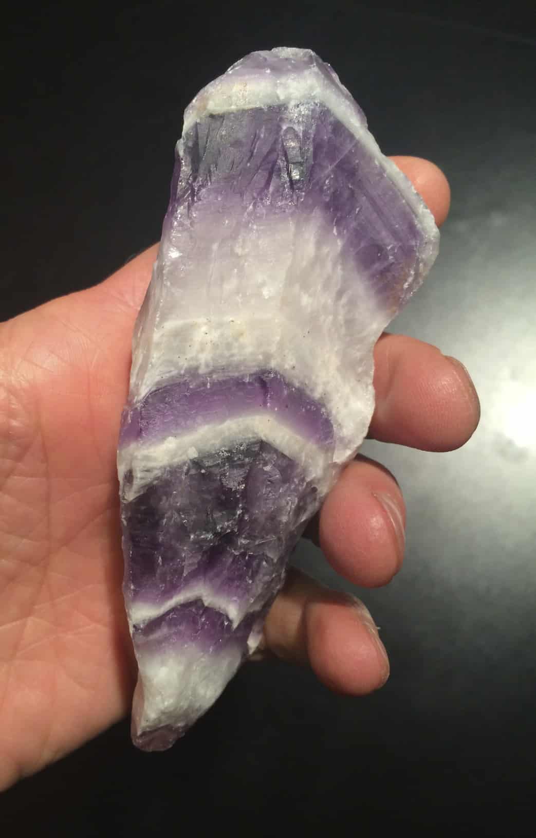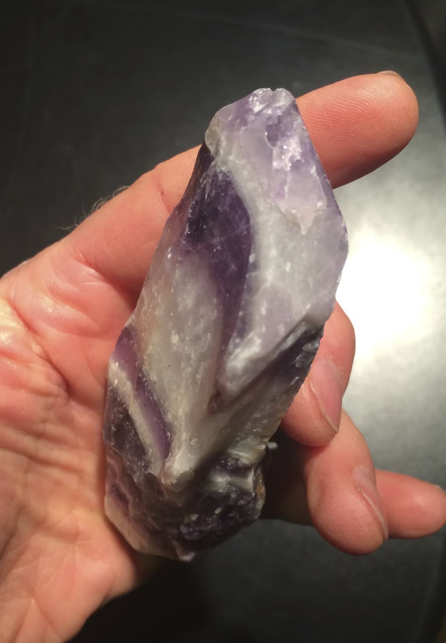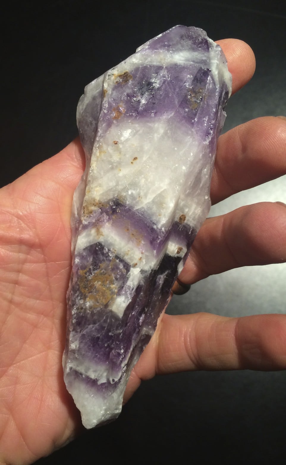Three point faces partially defined & two good purple zones, kind of wide’ish/flattish. I’ve characterized these stones as Milky (energetically important) because their white zones are indeed…slightly translucent…and very comforting energetically, in combination with the purple spirit energy of the dark Amethyst. Length: 12.2cm; Width: 4.2cm; Depth: 3.2cm Origin: Latin America, Brazil (Rio Grande do Sul)