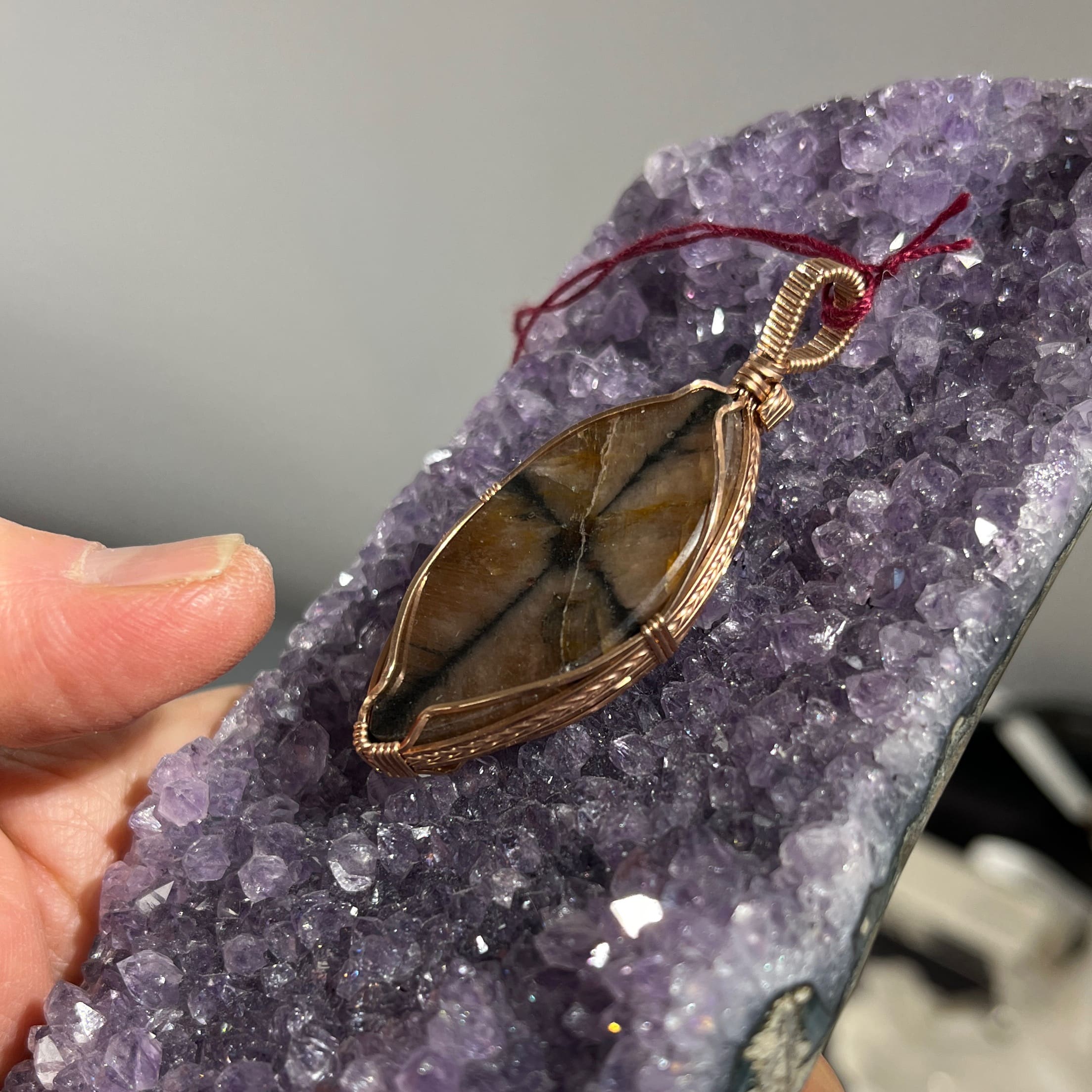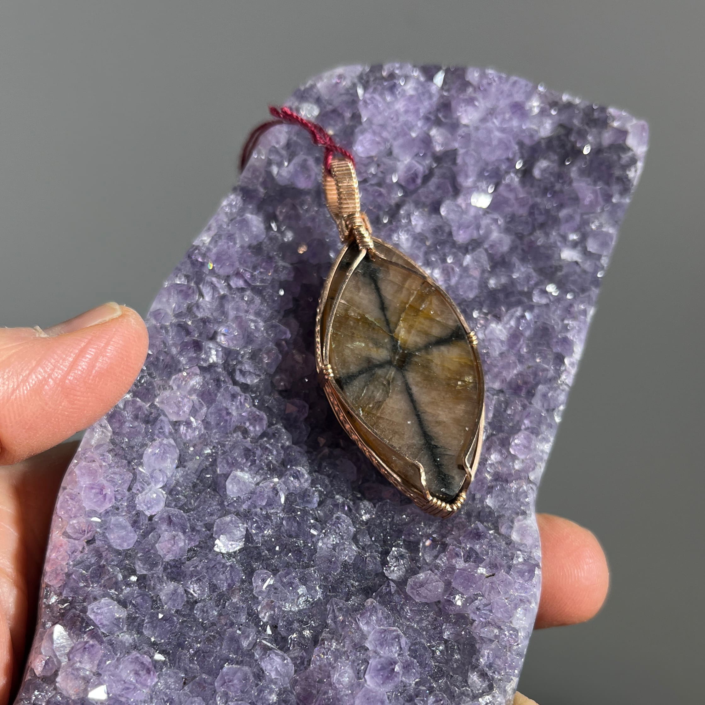 Chiastolite aka Andalusite crystallizes in a way that – if cut in cross section – reveals a cross or X with a black or red dot in the middle. Makes for a dramatic pendant. This one is a very cool pointed oblong oval, expertly wrapped with pink Gold Filled wire. Length: 5.7cm; Width: 2.3cm; Depth: .9cm Weight: 68.5ct
