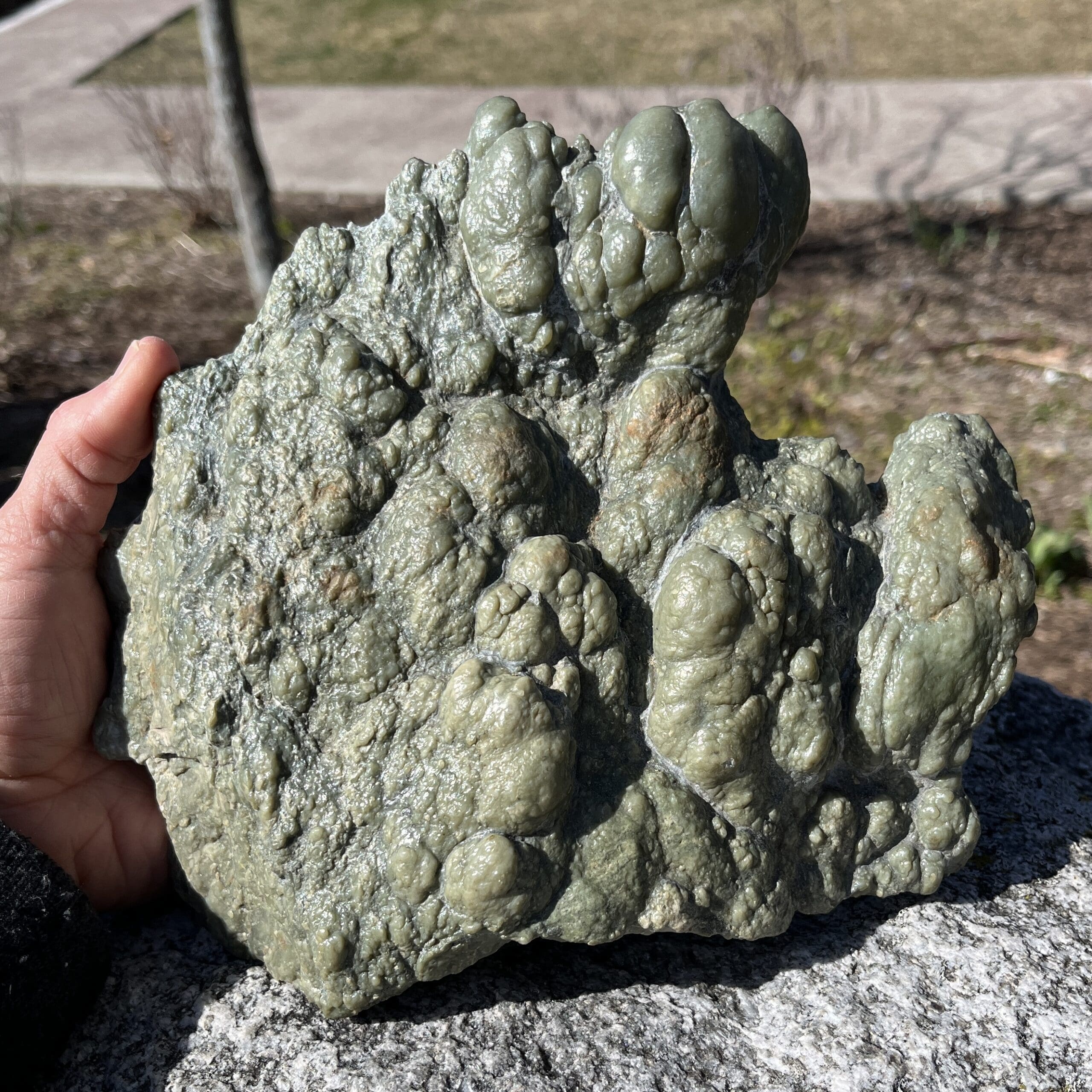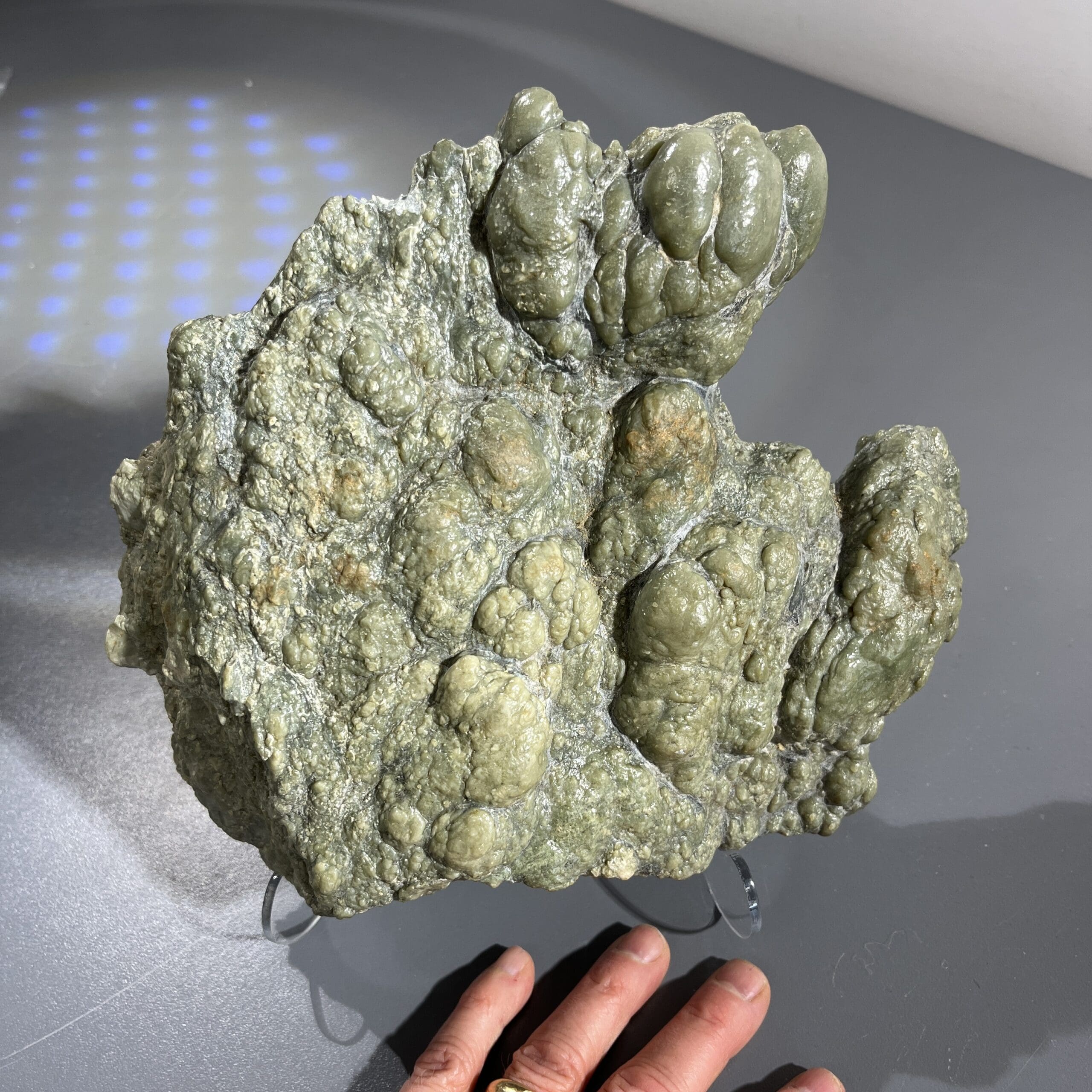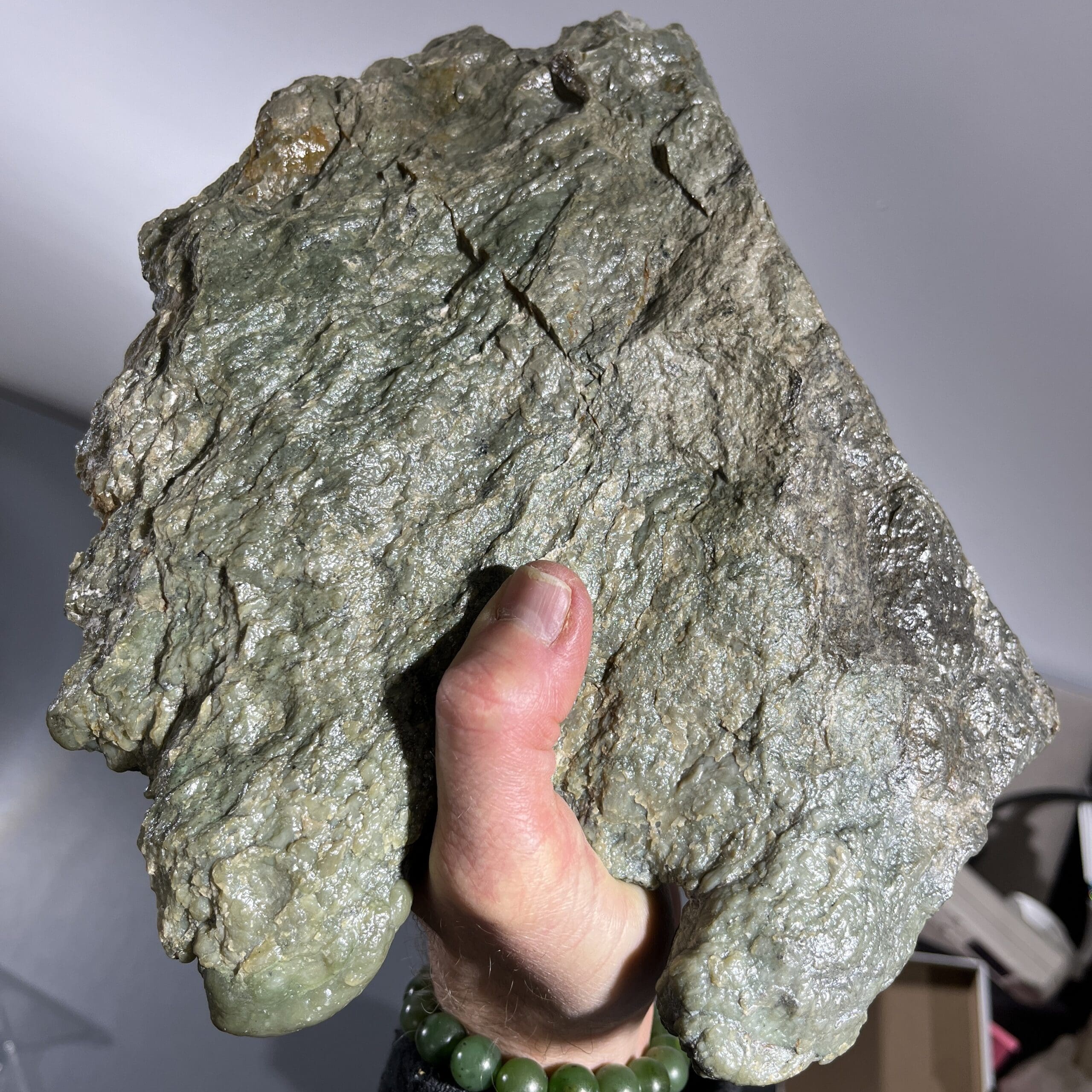 Exceptionally large and well-formed rare Canadian Botryoidal Jade display piece of nearly 7 pounds. We consider this type of authentic Jade to be the Mama Earth Heart Stone, providing soothing calm, and categorized as a Heart-oriented stone. Length: 20.3cm; Width: 21.6cm; Depth: 7.6cm Weight: 3030g (106.88oz) Origin: North America, Canada