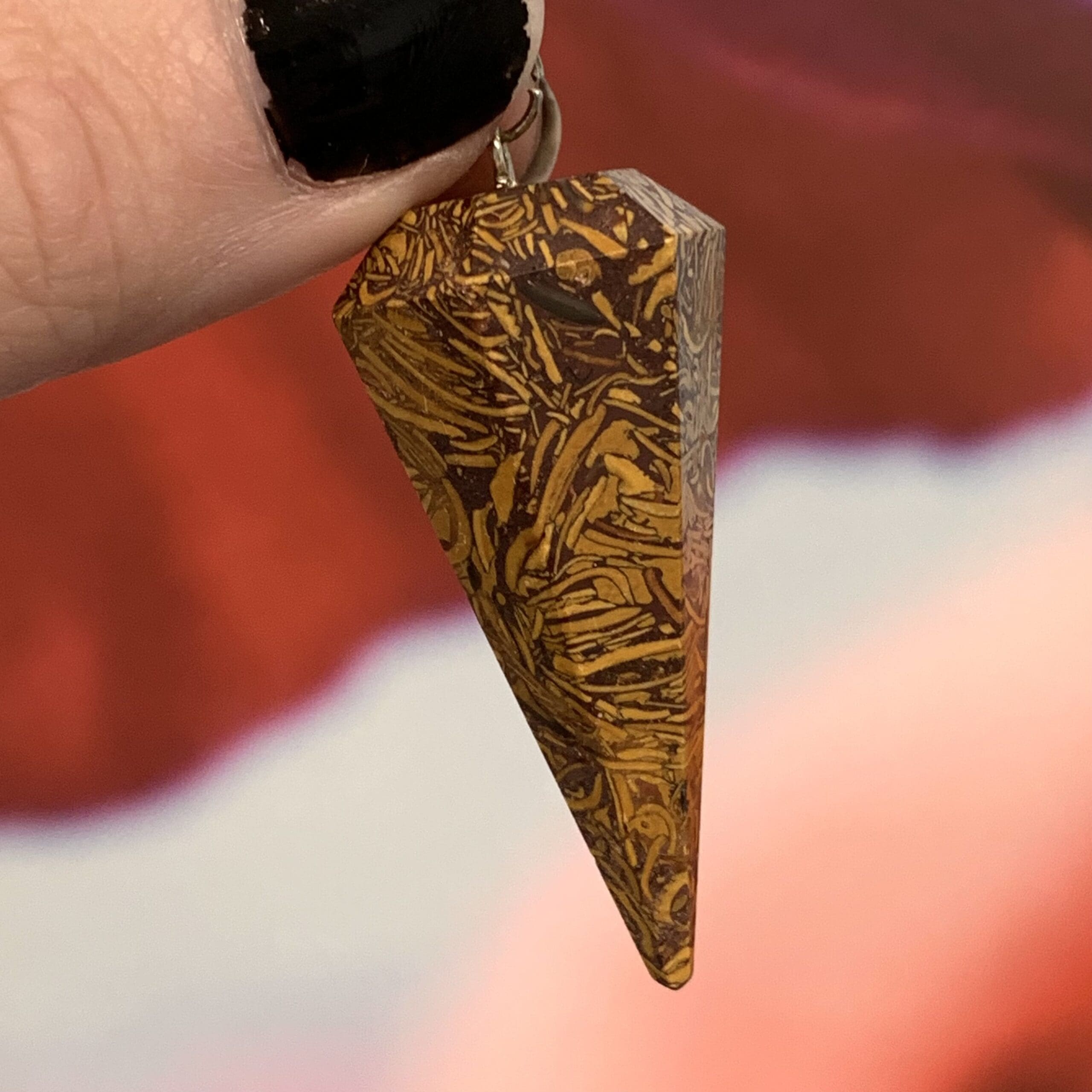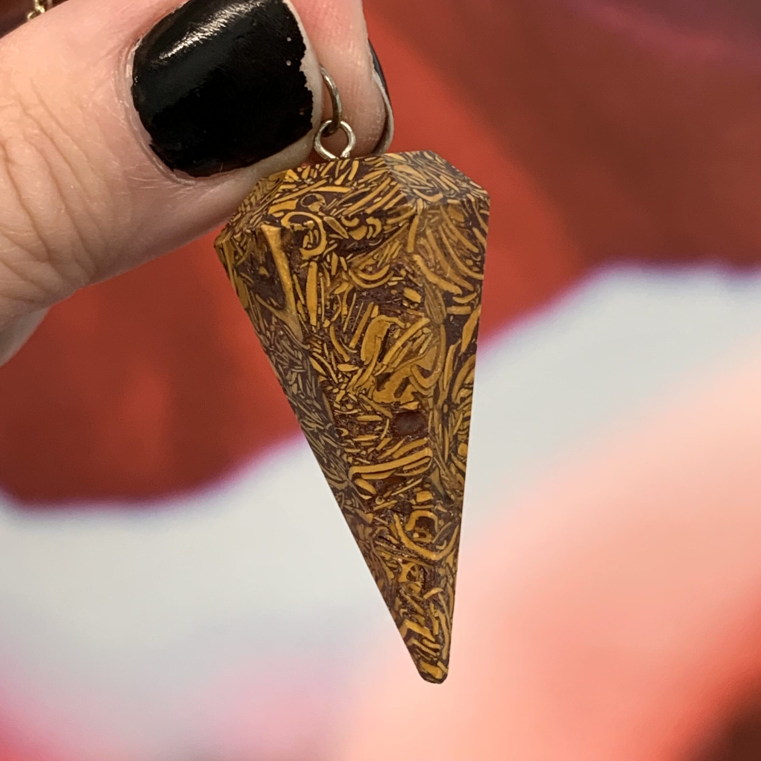 Beautiful and naturally intricate jasper aka Script Stone, Meriam Stone, and Elephant Jasper (in addition to Coquina Jasper). Seems to be a fossil composite. Has a 7 inch chain. Length: 4.6cm; Width: 2.3cm; Depth: 2.3cm Weight: 84ct Origin: Central Asia, India