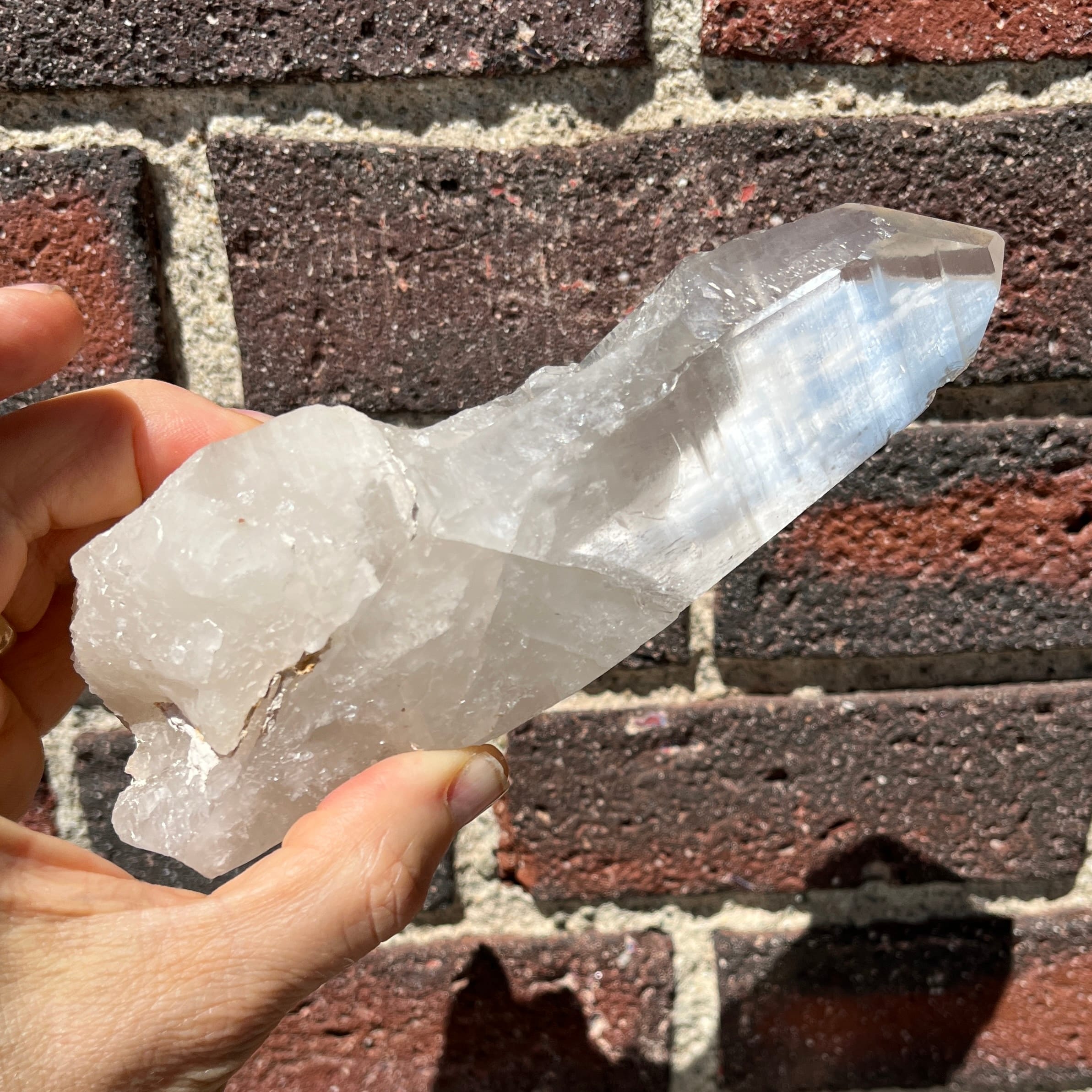 Although it’s got a pretty milky base, this Lemurian is clear on its top 60%. It has a very distinctive ‘slicing’ scalpel shape, for psychic surgery or sealing/healing specific spots. It’s 6.3″ long and fits perfectly in the hand. Termination facets have all been polished, as is the custom on these Brazilian Lemurians. Lemurian Quartzes can be identified by these key factors: the point, ridges and alternating siding (both in form and frostiness vs clarity), and extra faces. Some we call 3-sided, 4-sided, stylus points, etc. A qualifying piece – unlike most on the market – must have more than one of these qualities. See our popular blog on Lemurians on our website. Lemurian Quartz is among a very few clear Quartzes that are not simply considered Channel stones, but rather they are Source Energy Zone stones, because they represent higher roles, the mantle, or responsibility of elevated beings. They are not those beings – or stand-ins for those beings – they are literally the position or stature embodied. As such, they are particularly elevated wands or lasers, and are prized highly among the many many Quartz varieties. Length: 16cm; Width: 5.6cm; Depth: 4.1cm Weight: 402.1g (14.18oz) Origin: Latin America, Brazil