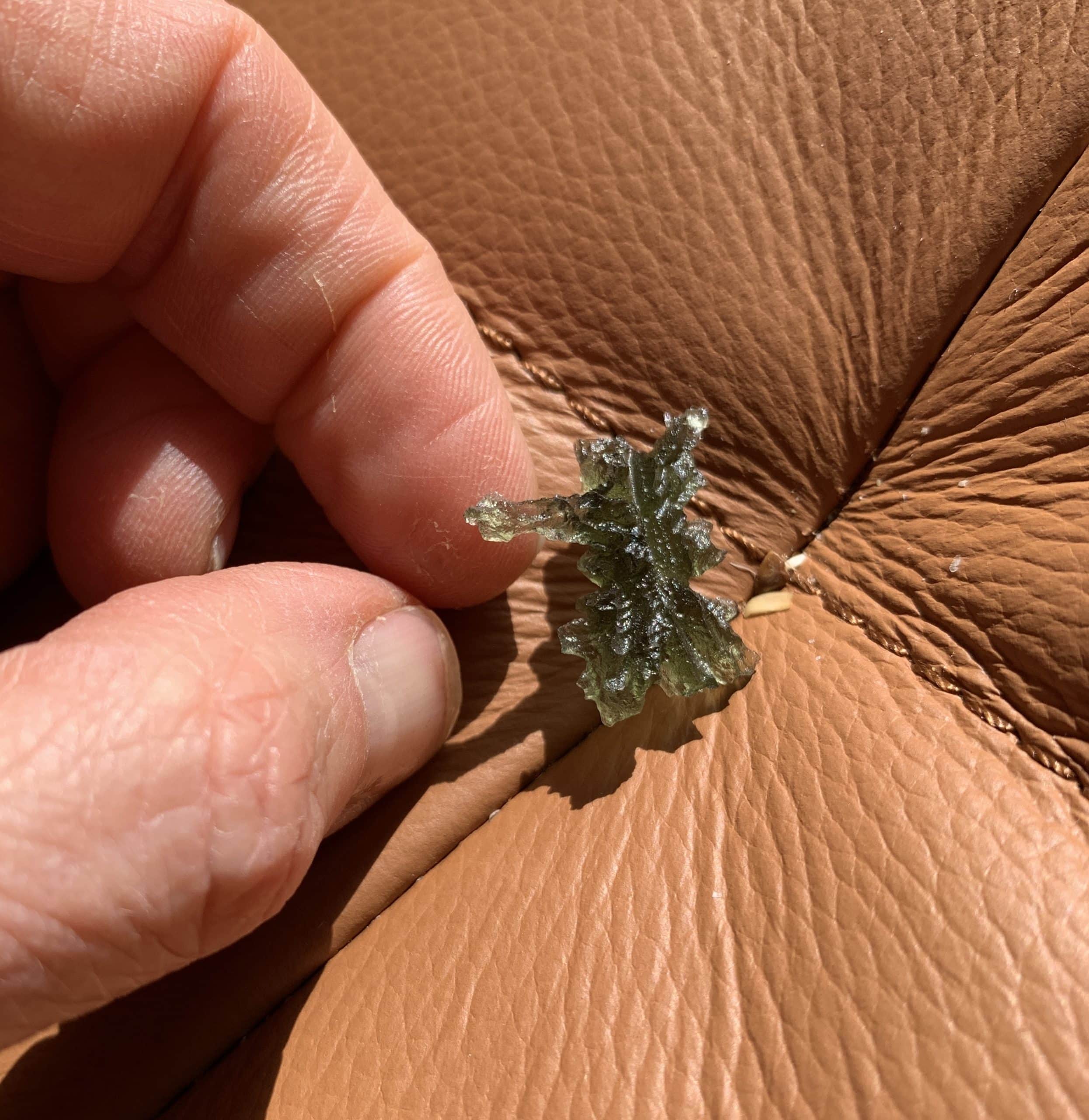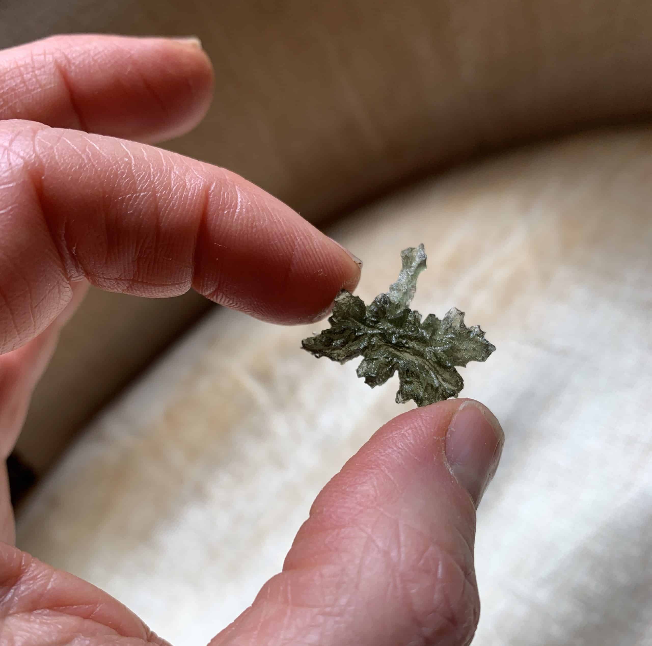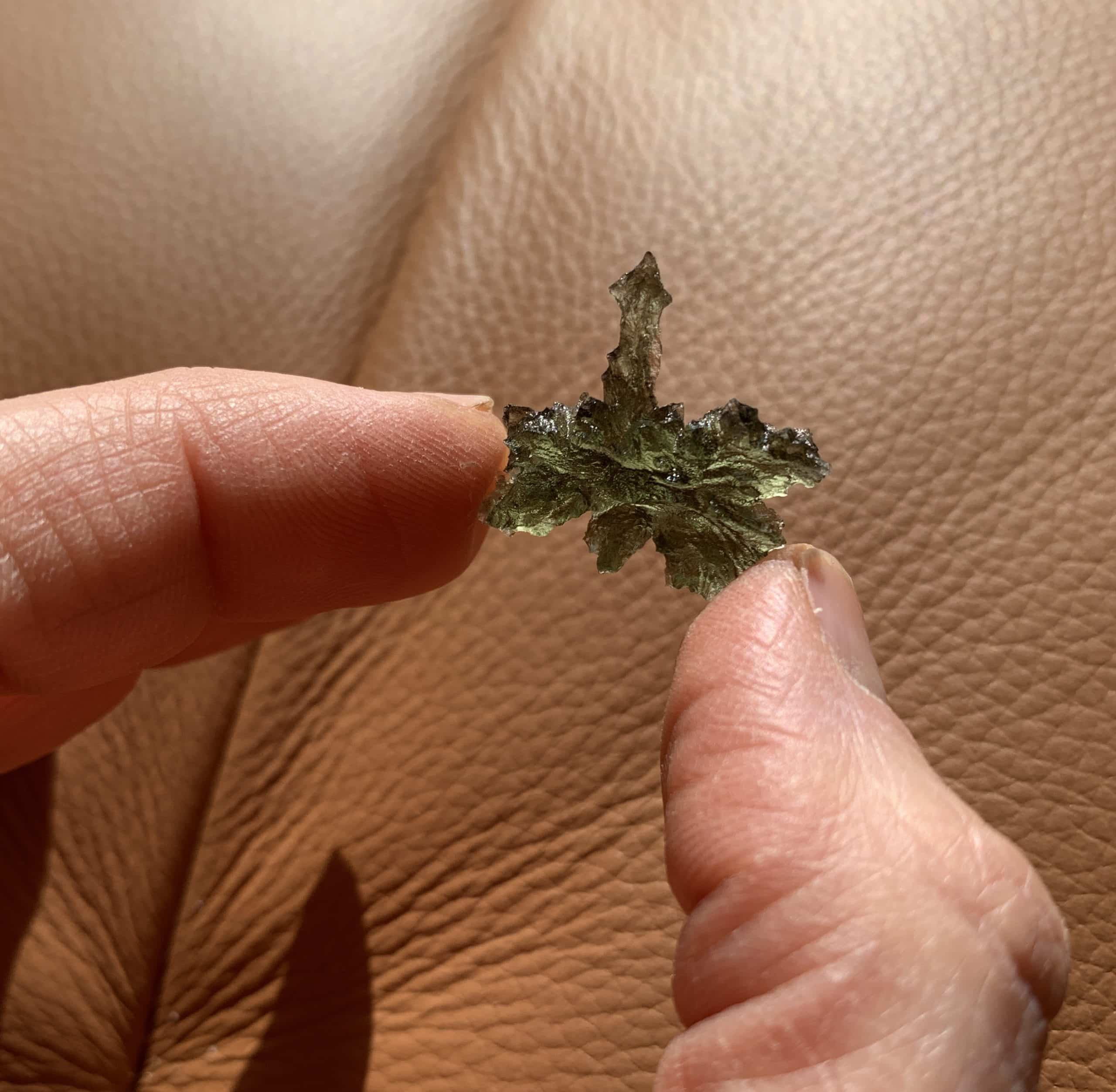 This one actually stands! And is nicknamed “pointer” as it reached up to the sky/heavens. It’s a spiky hedgehog (or Jezkovna) variety of the coveted Besednice (prounounced Besednitza) locality Moldavite. Moldavite is the Alien Messenger Stone – facilitating communications from on high – and may also be called the Cosmic Aura stone, due to it’s highly ascendant energy. It’s the only gem quality – and green – Tektite on the planet, formed from a meteoric impact in the Czech Republic 15 million years ago. All of ours are genuine, and we do mail out a Statements of Authenticity with each purchase (.85″ L by .8″ W by .25″ D by .85″ T). Length: 2.2cm; Width: 2cm; Depth: .6cm Weight: 8ct Origin: Europe (Czech Republic)