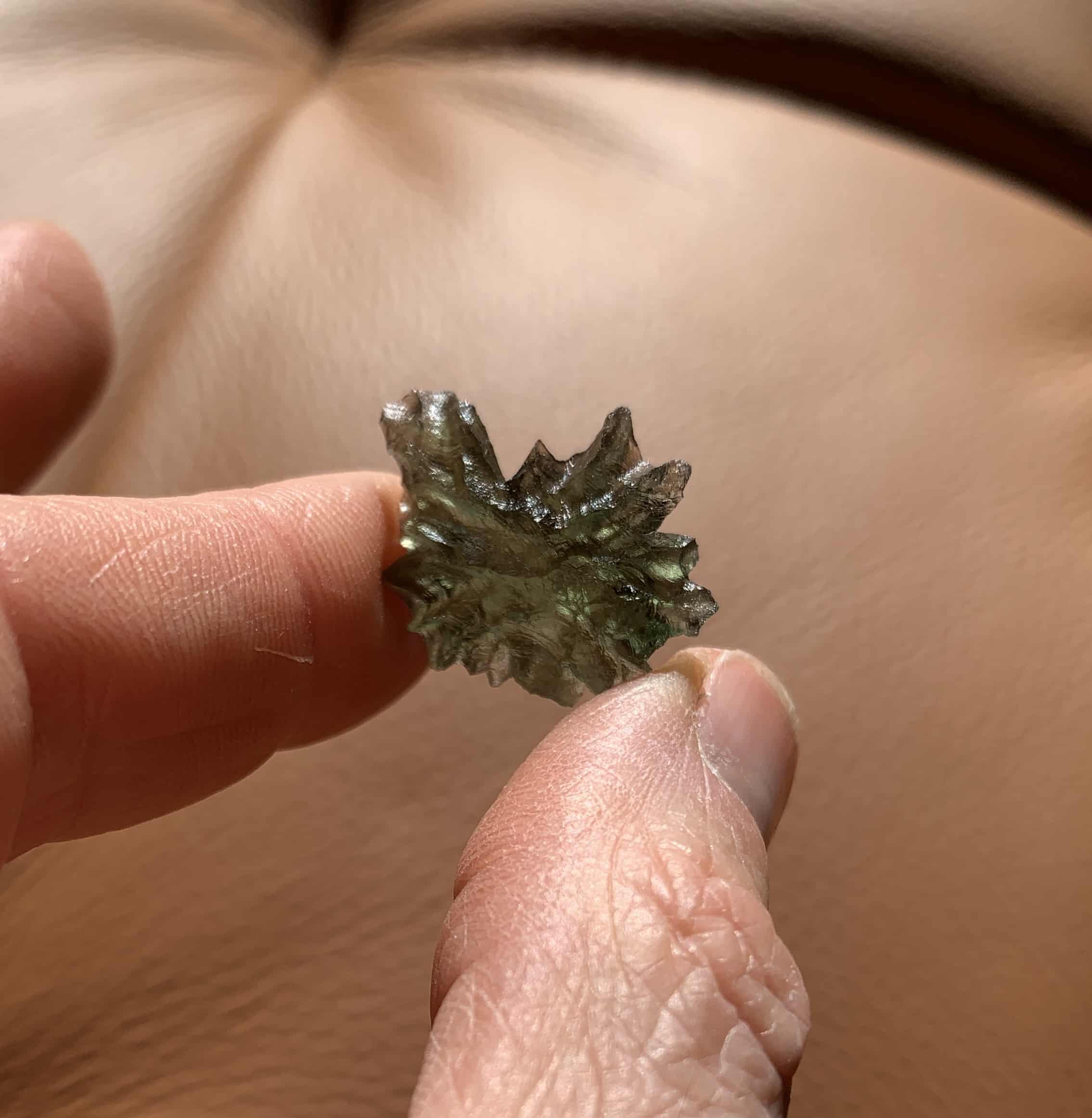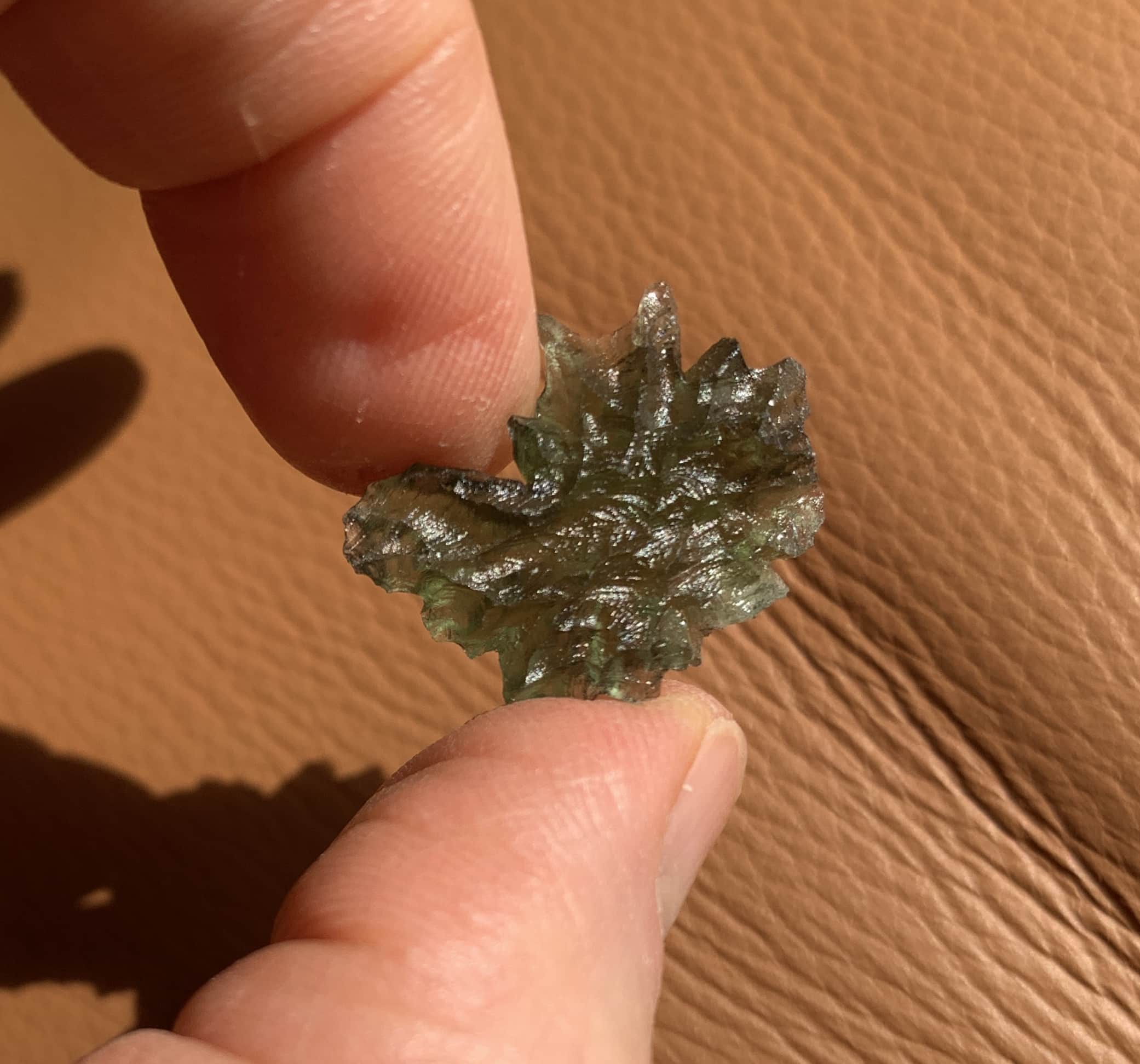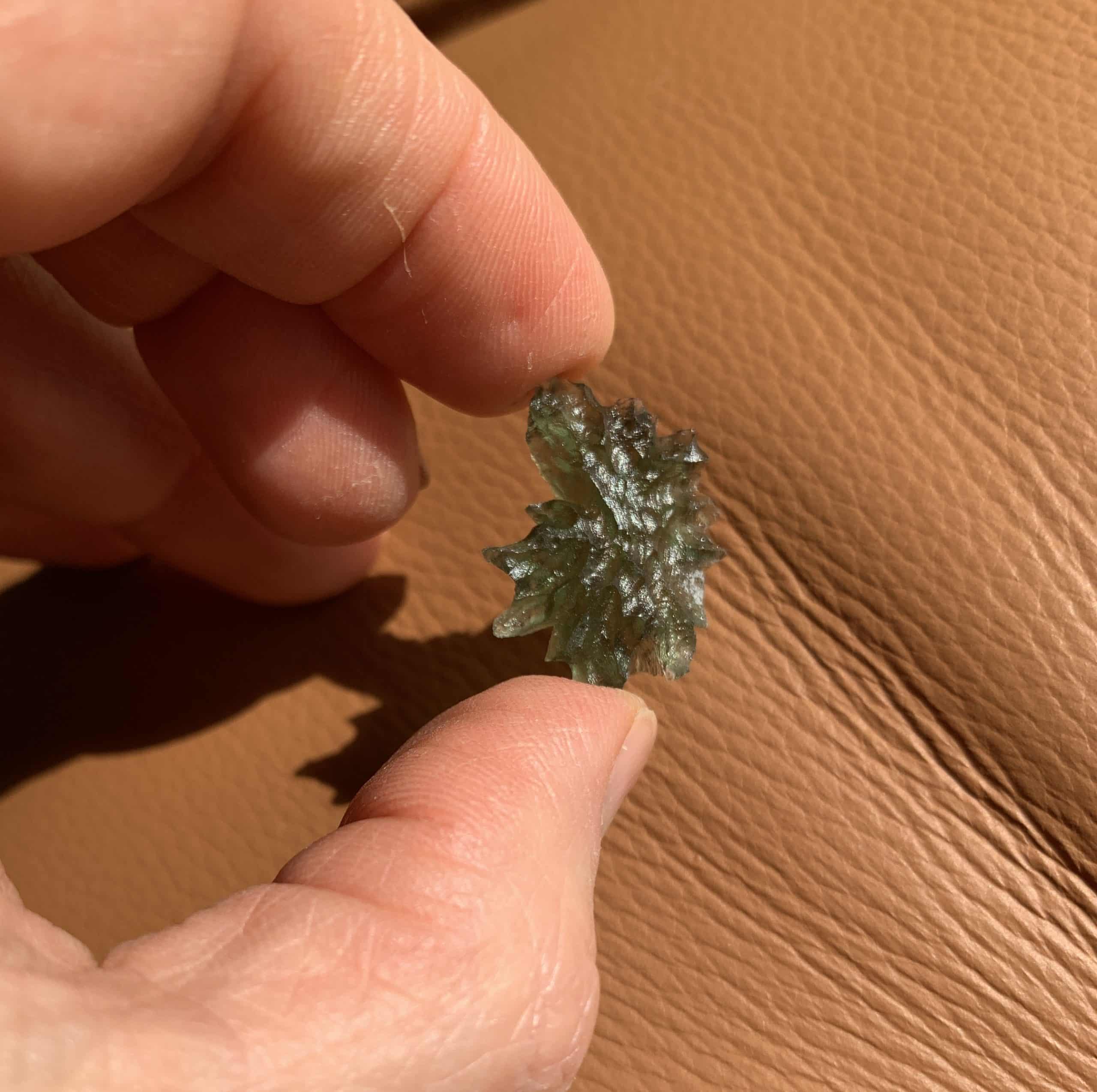 Spiky hedgehog (or Jezkovna)variety of the coveted Besednice (prounounced Besednitza) locality Moldavite. Nicknamed ’cause it looks like a crouching griffin. YOu have to really look to find its few dings. Moldavite is the Alien Messenger Stone – facilitating communications from on high – and may also be called the Cosmic Aura stone, due to it’s highly ascendant energy. It’s the only gem quality – and green – Tektite on the planet, formed from a meteoric impact in the Czech Republic 15 million years ago. All of ours are genuine, and we do mail out a Statements of Authenticity with each purchase (.9″ L by .7″ W by .25″ D). Length: 2.3cm; Width: 1.8cm; Depth: .6cm Weight: 9.5ct Origin: Europe (Czech Republic)