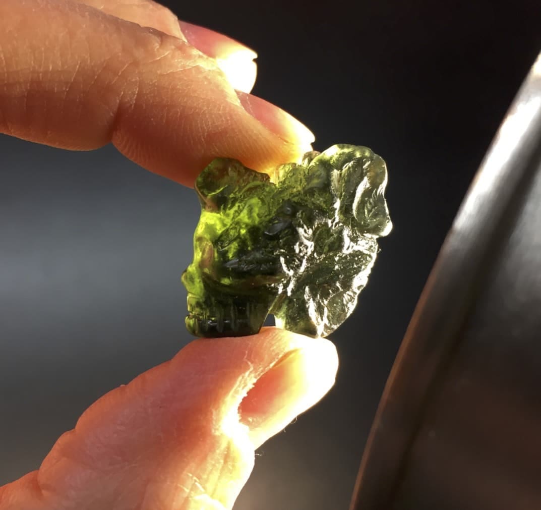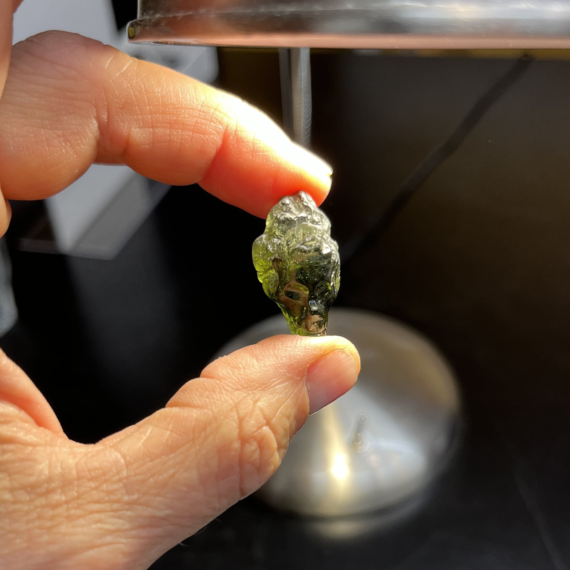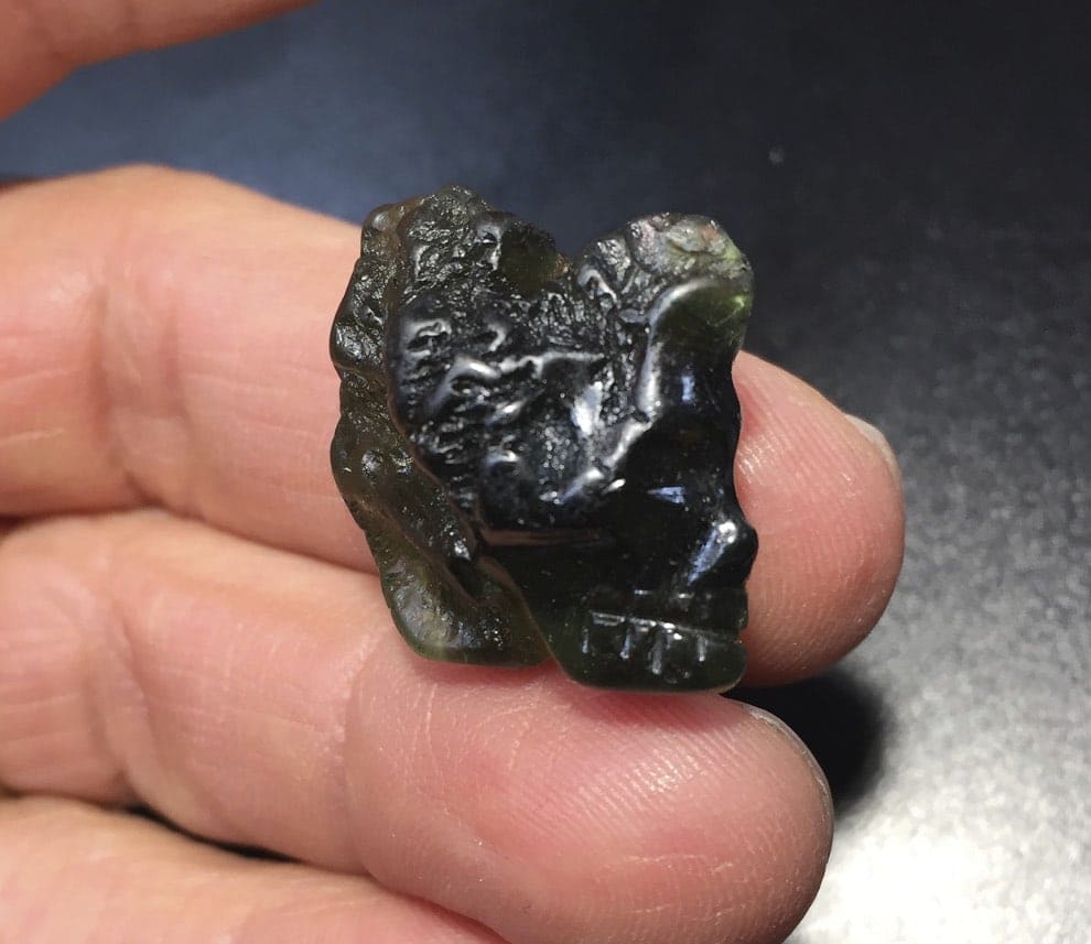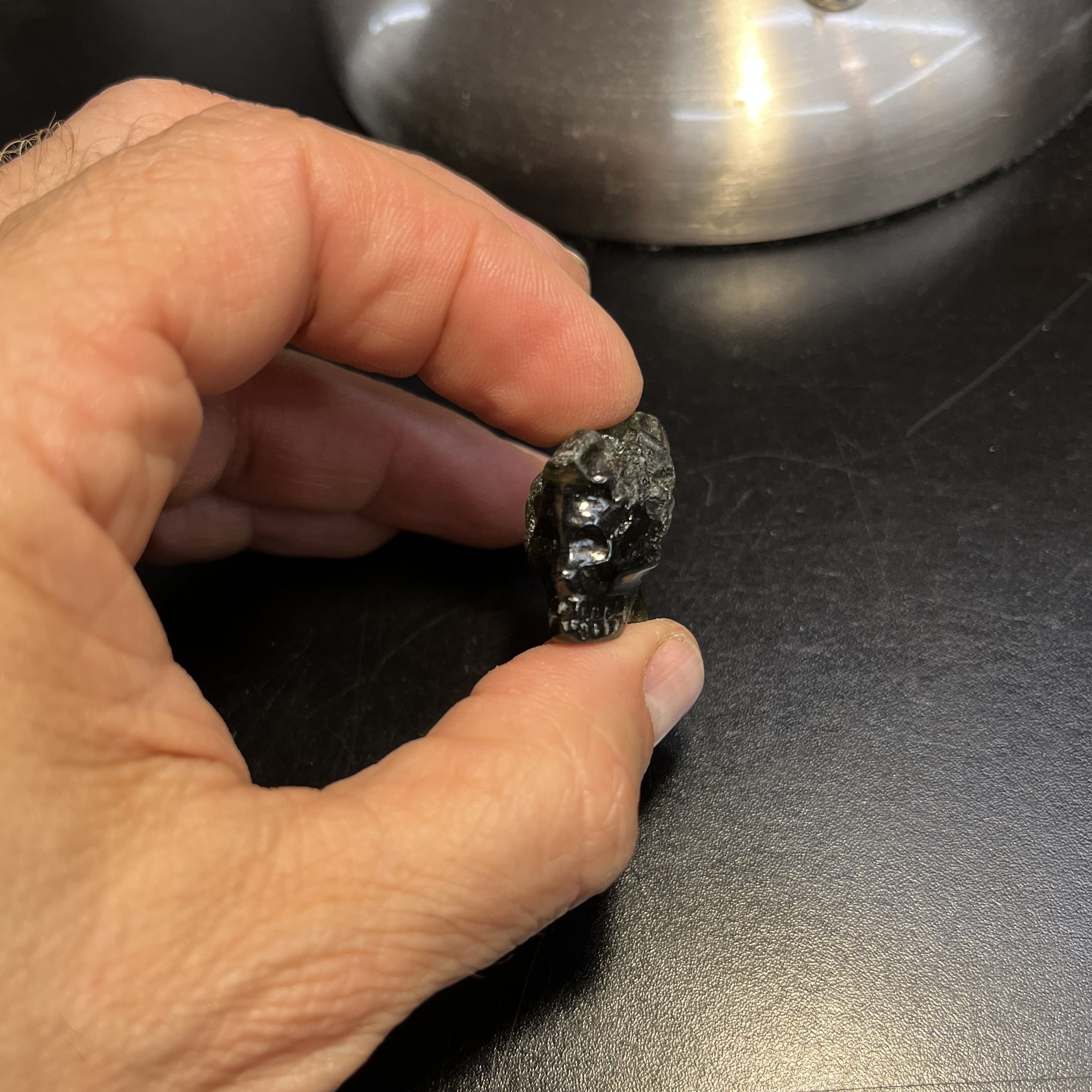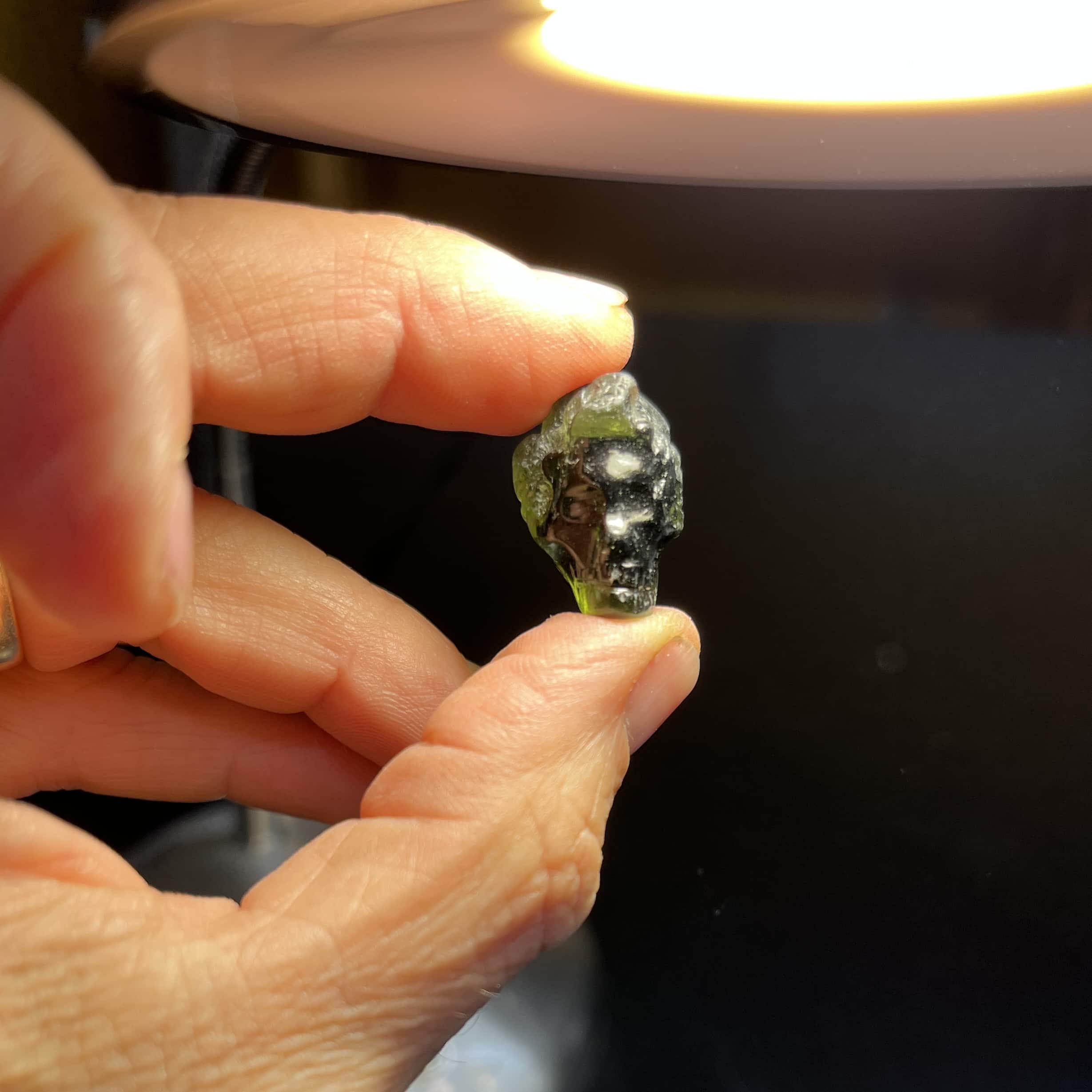 Interesting tall hair do on this mysterious carving work done in Brazil. It’s a great Moldavite in itself, but being a skull gives it a whole different depth of meaning. Rare and hard to find pieces of this distinctive workmanship. Length: 2cm; Width: 1.5cm; Height: 2.2cm Weight: 33ct Origin: Europe (Czech Republic)