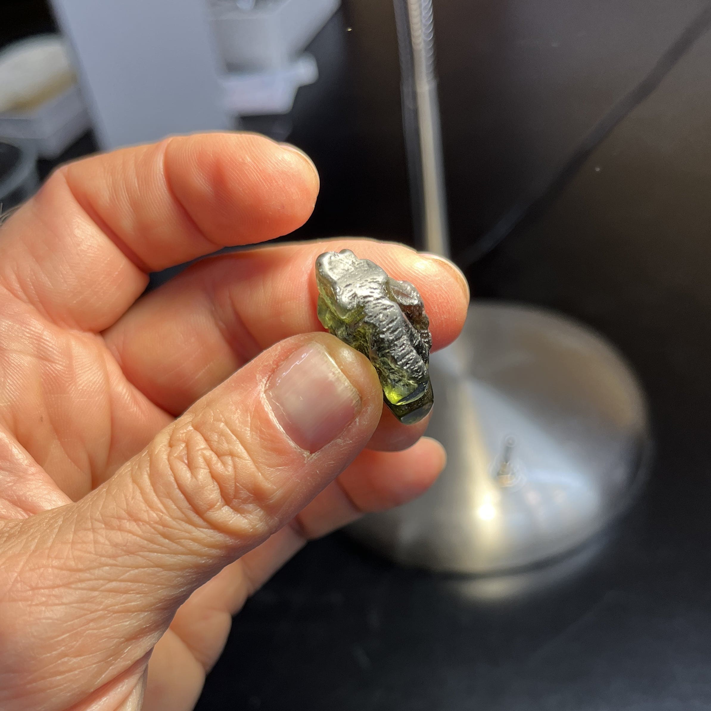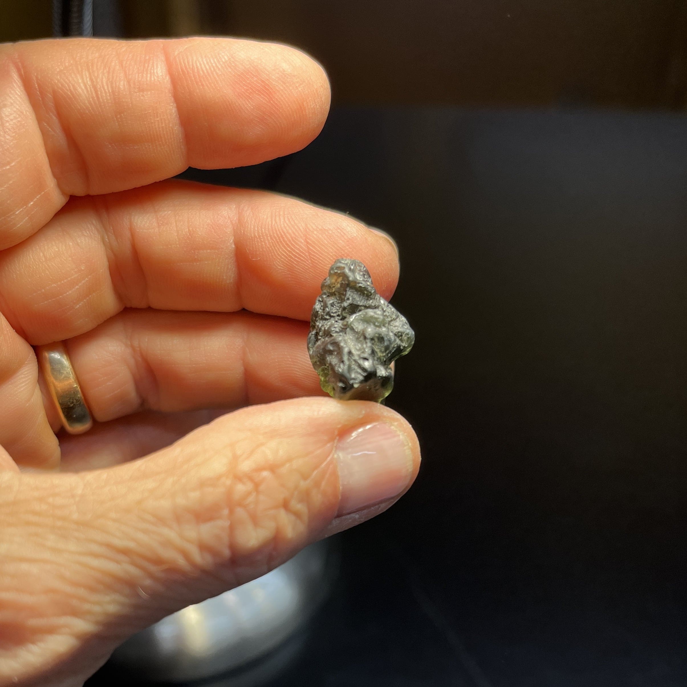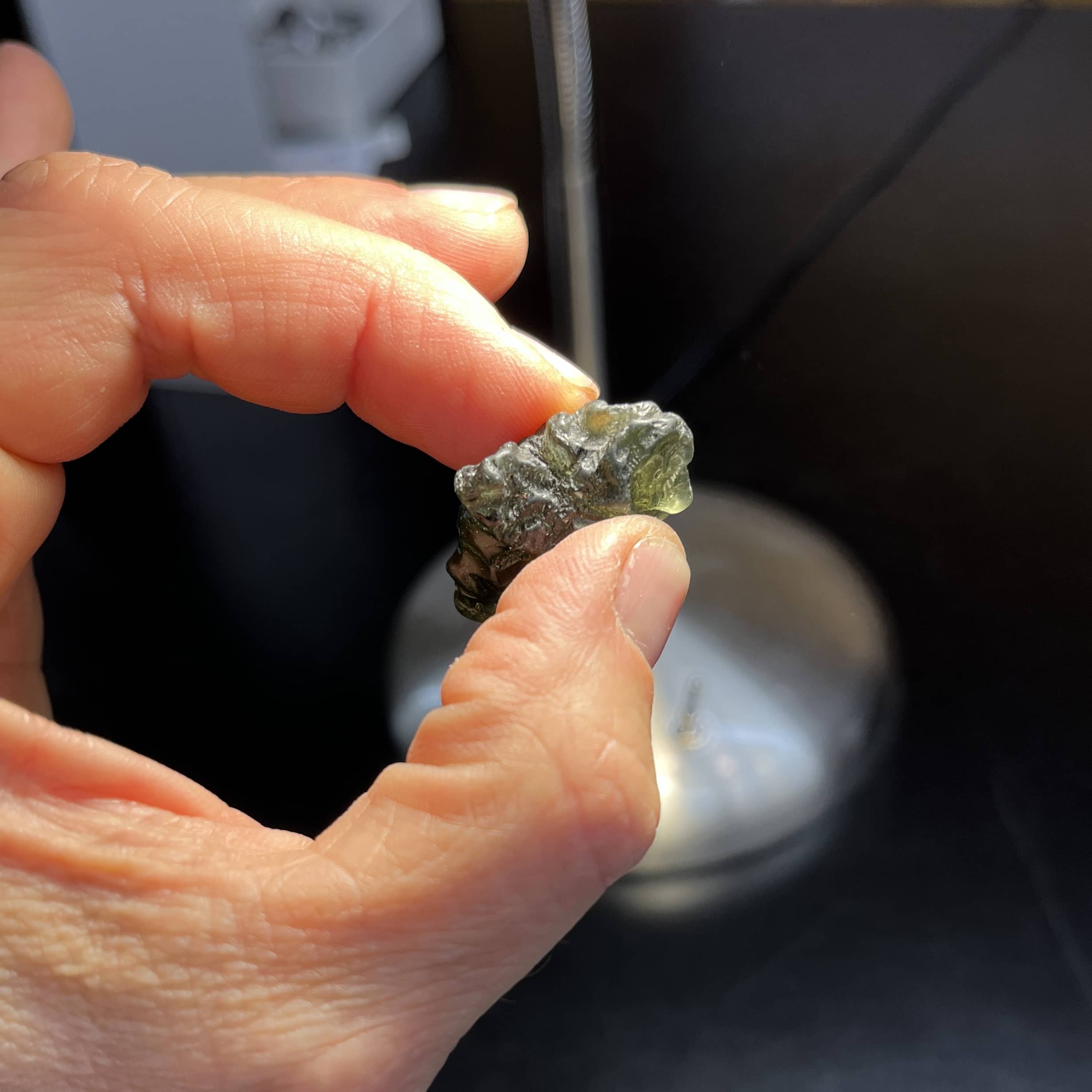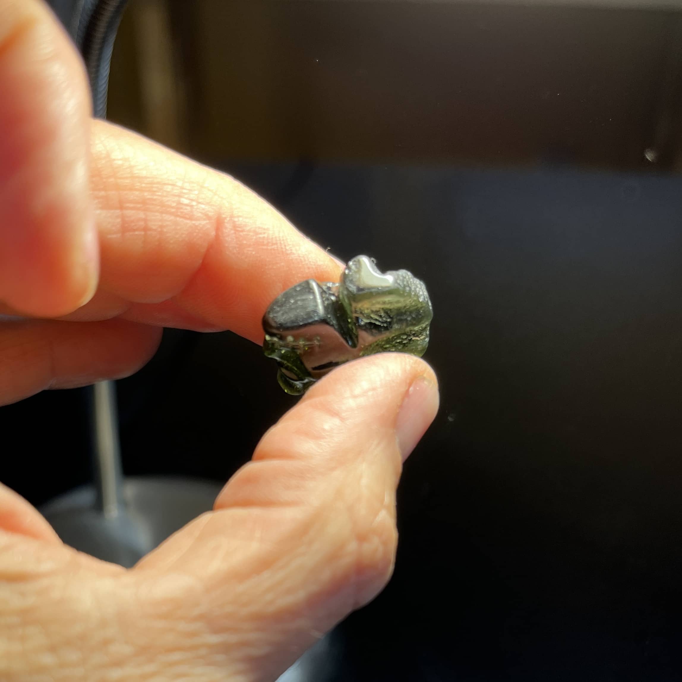 Interesting tall hair do on this mysterious carving work done in Brazil. It’s a great Moldavite in itself, but being a skull gives it a whole different depth of meaning. Rare and hard to find pieces of this distinctive workmanship. Length: 2cm; Width: 1.5cm; Height: 2.2cm Weight: 33ct Origin: Europe (Czech Republic)
