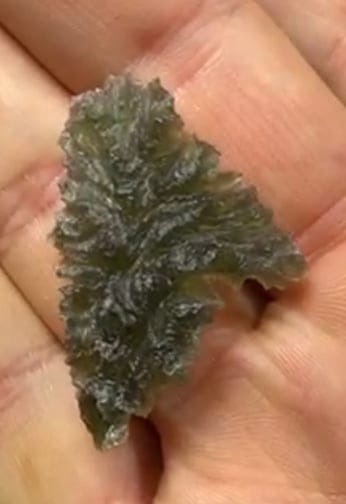 We call it “Star Trek” or “Beam Me Up” – ’cause the shape is just like the emblem of the Starfleet Academy. This exquisite Besednice (prized locality) “hedgehog” variety of Moldavite is wrapped, a particular challenge on these spiky pieces. You’ll also see (from the attached graphic) that it perfectly matches the “beam me up Scotty” breast pin donned by those who’ve gone to the Starfleet academy. Definitely one-of-a-kind! Original (unwrapped) weight was 5.44 grams. (specs in inches: L 2.27″ W 1.3″ D .35″). Moldavite is the Alien Messenger stone, connecting us to On High as an Ascension Stone, opening us up to interdimentional communication. It’s the product of a meteor strike 15 million years ago – melding Earth and Space elements – and landing mostly the Czech Republic. It’s the only Tektite in the world that’s green and facetable gem quality. Length: 5.8cm; Width: 3.3cm; Depth: .9cm Weight: 44ct Origin: Europe (Czech Republic)