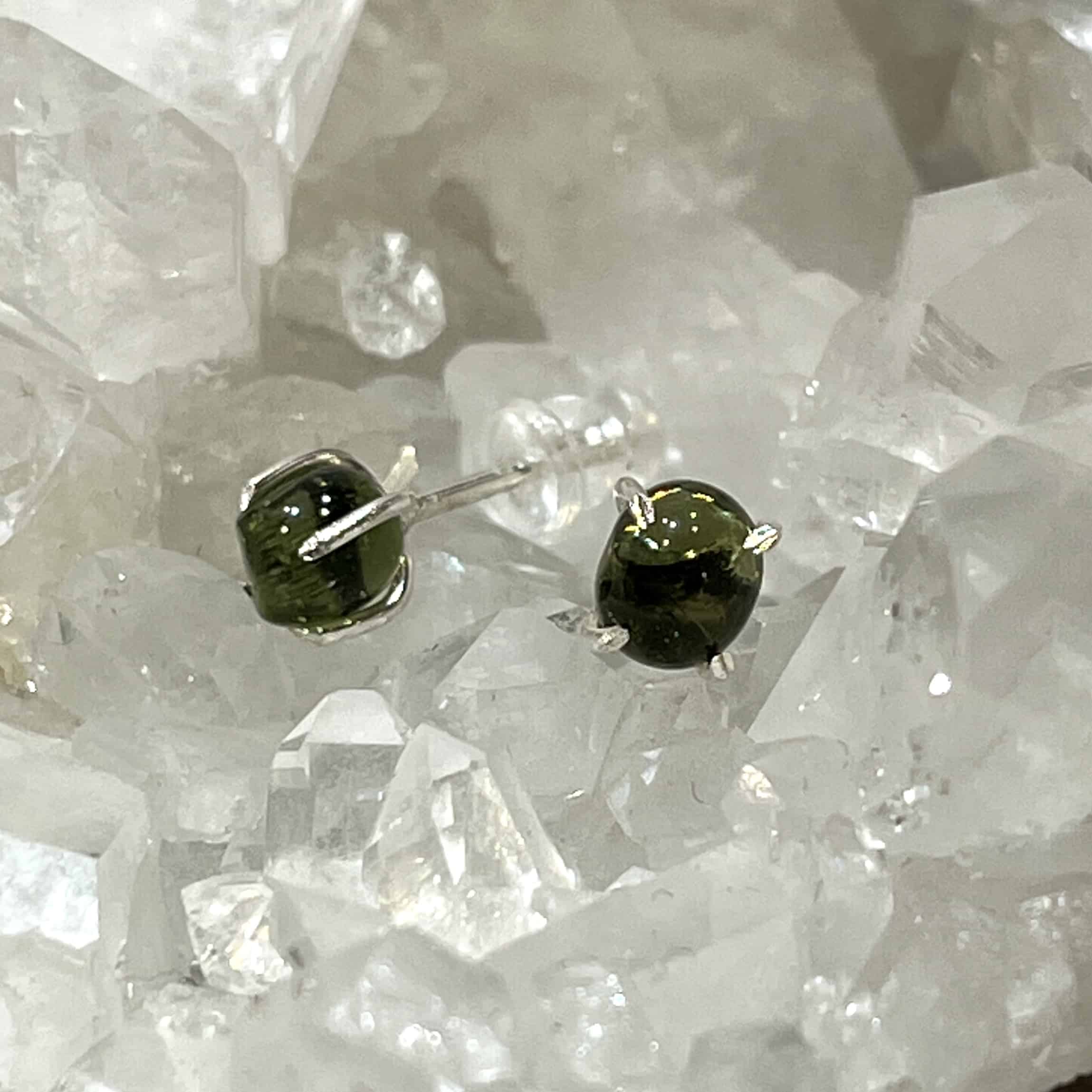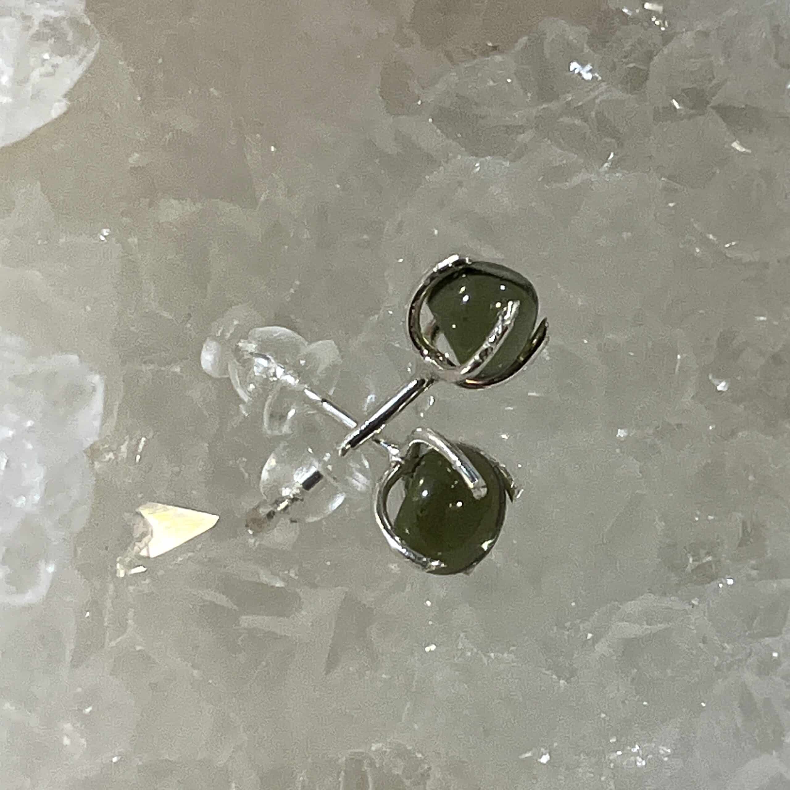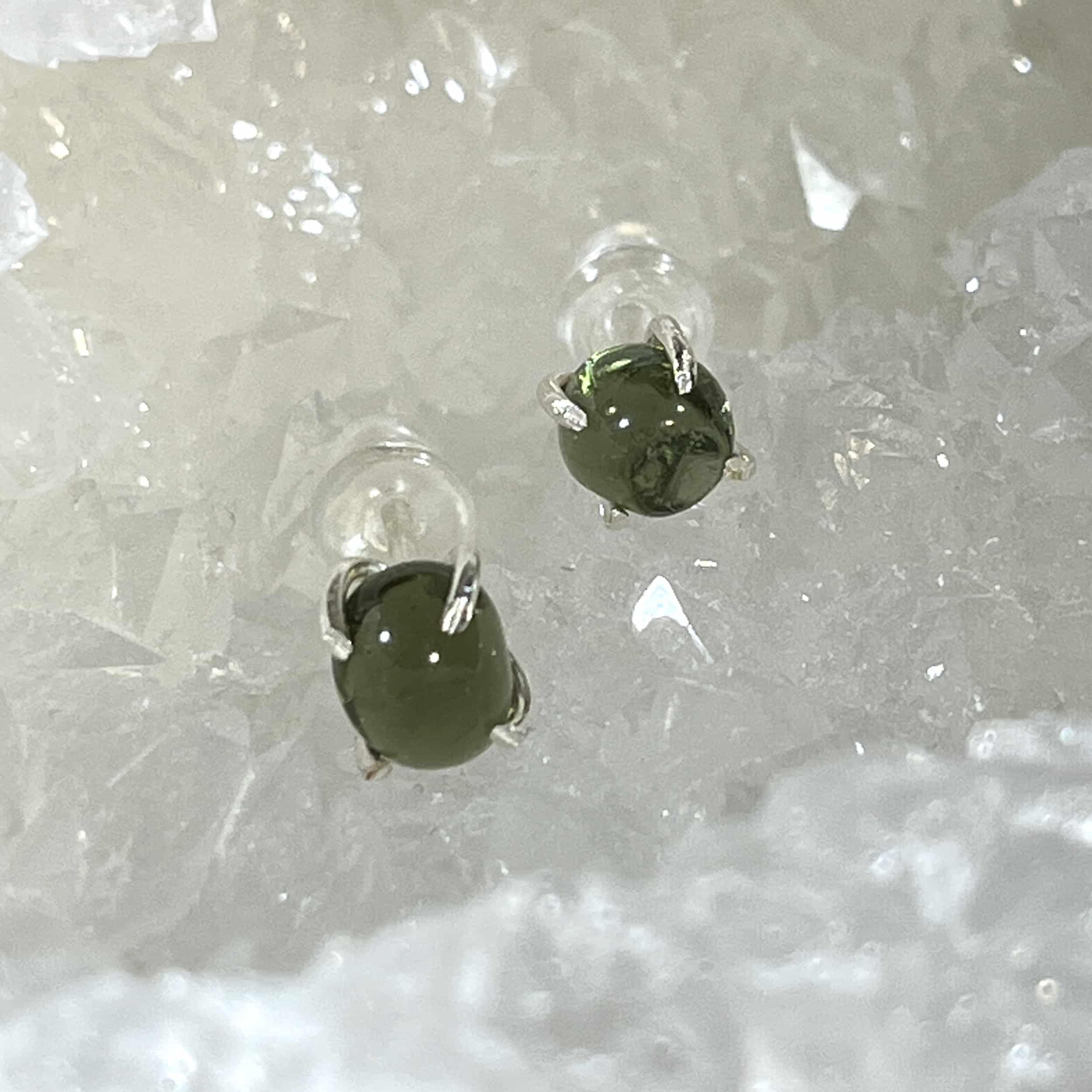 We got a RARE stash of just a FEW top quality small polished (not sure if they were tumbled), amorphous orbs of genuine Moldavite. We picked out the only 2 that matched perfectly, and our custom jeweler set them into studs. Rubber backs are included. Moldavite is the Alien Messenger stone – a result of meteoric impact 15 million years ago – and it’s from Czech Republic, the only place in the world where tektites are green and gem facetable quality. Finding beads or orbs of Moldavite is exceedingly hard, so this is a real find! Once these are gone, there’ll be no replacing them. Length: 1.7cm; Width: .5cm; Depth: .5cm Weight: 4.5ct Origin: Europe (Czech Republic)