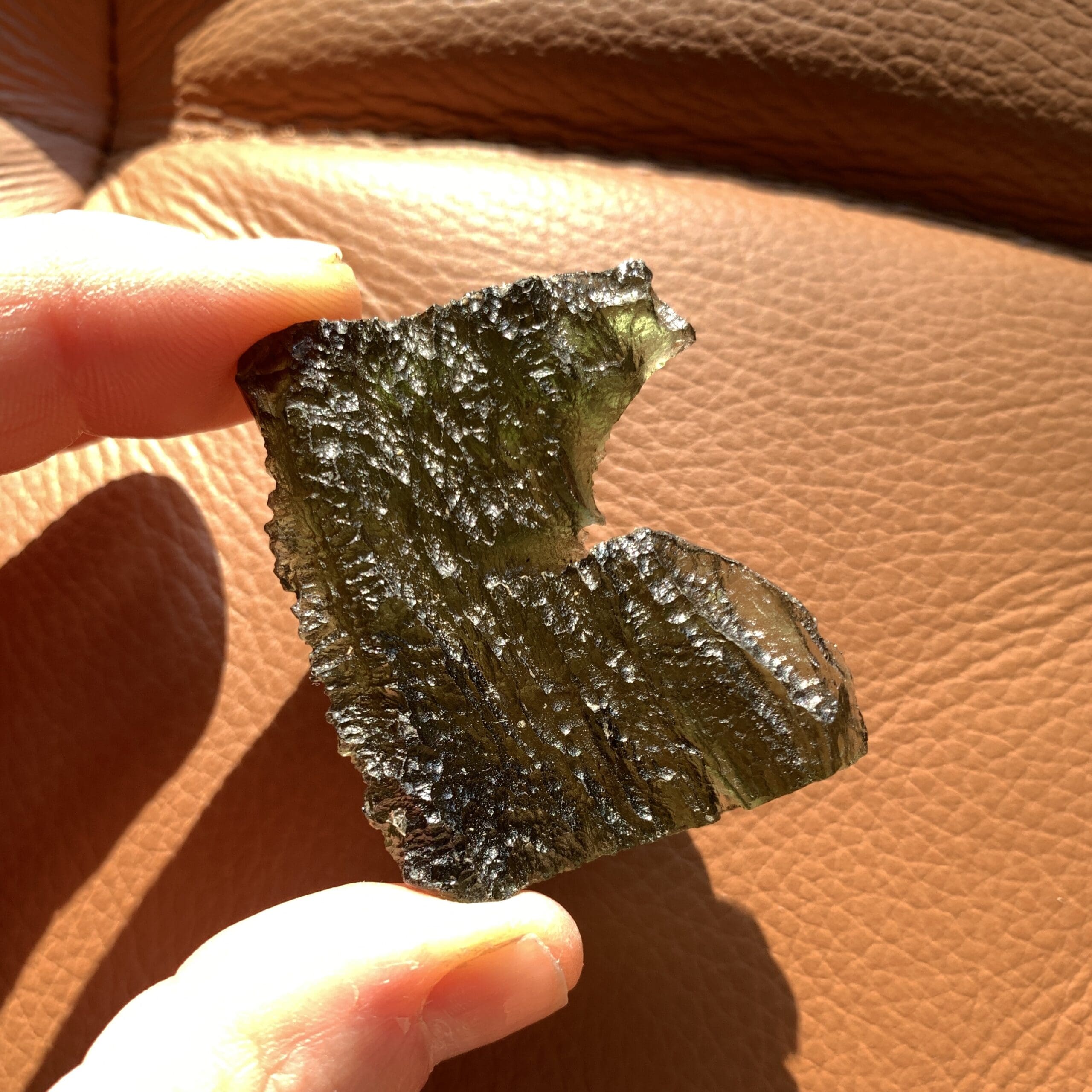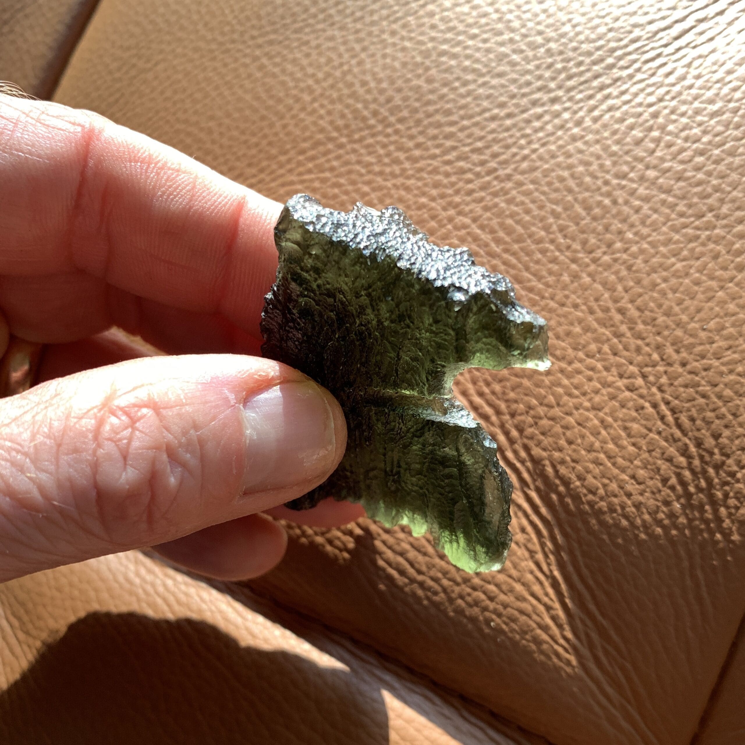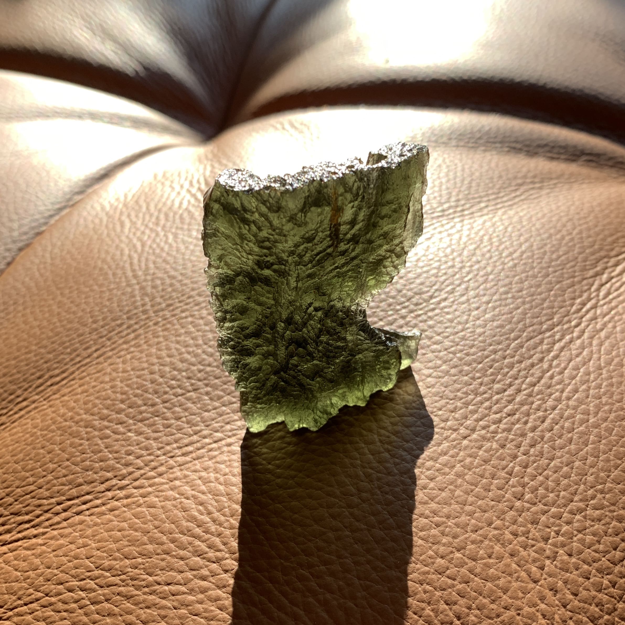 This lovely piece stands in two different ways, resembling a mighty eagle or regal chalice depending on which end is up. Moldavite is the Alien Messenger Stone – facilitating communications from on high – and may also be called the Cosmic Aura stone, due to it’s highly ascendant energy. It’s the only gem quality – and green – Tektite on the planet, formed from a meteoric impact in the Czech Republic 15 million years ago. All of ours are genuine, and we do mail out a Statements of Authenticity with each purchase. Length: 5.6cm; Width: 3.6cm; Height: 4.7cm; Depth: .8cm Weight: 22.22g (.78oz) Origin: Europe (Czech Republic)