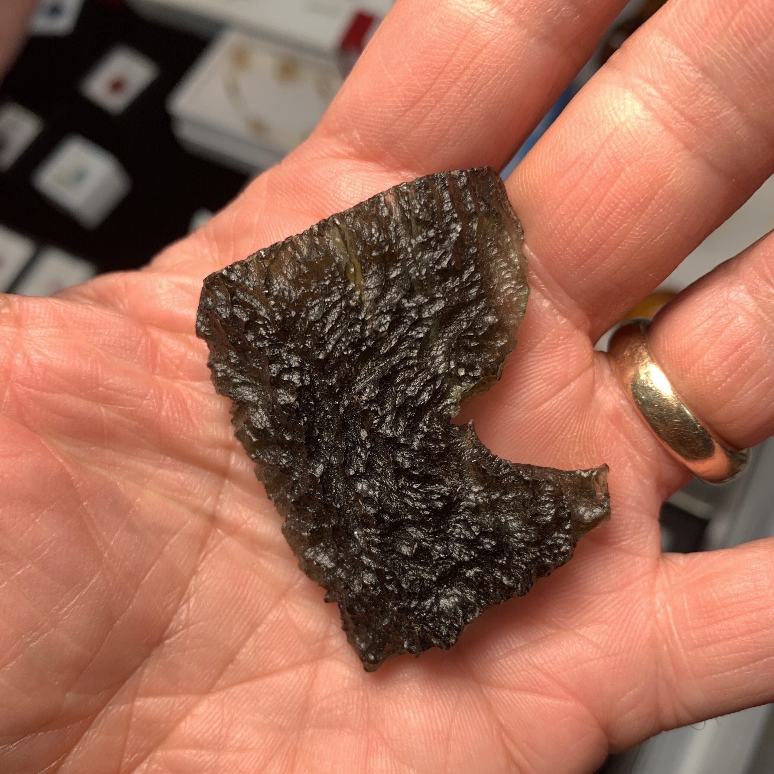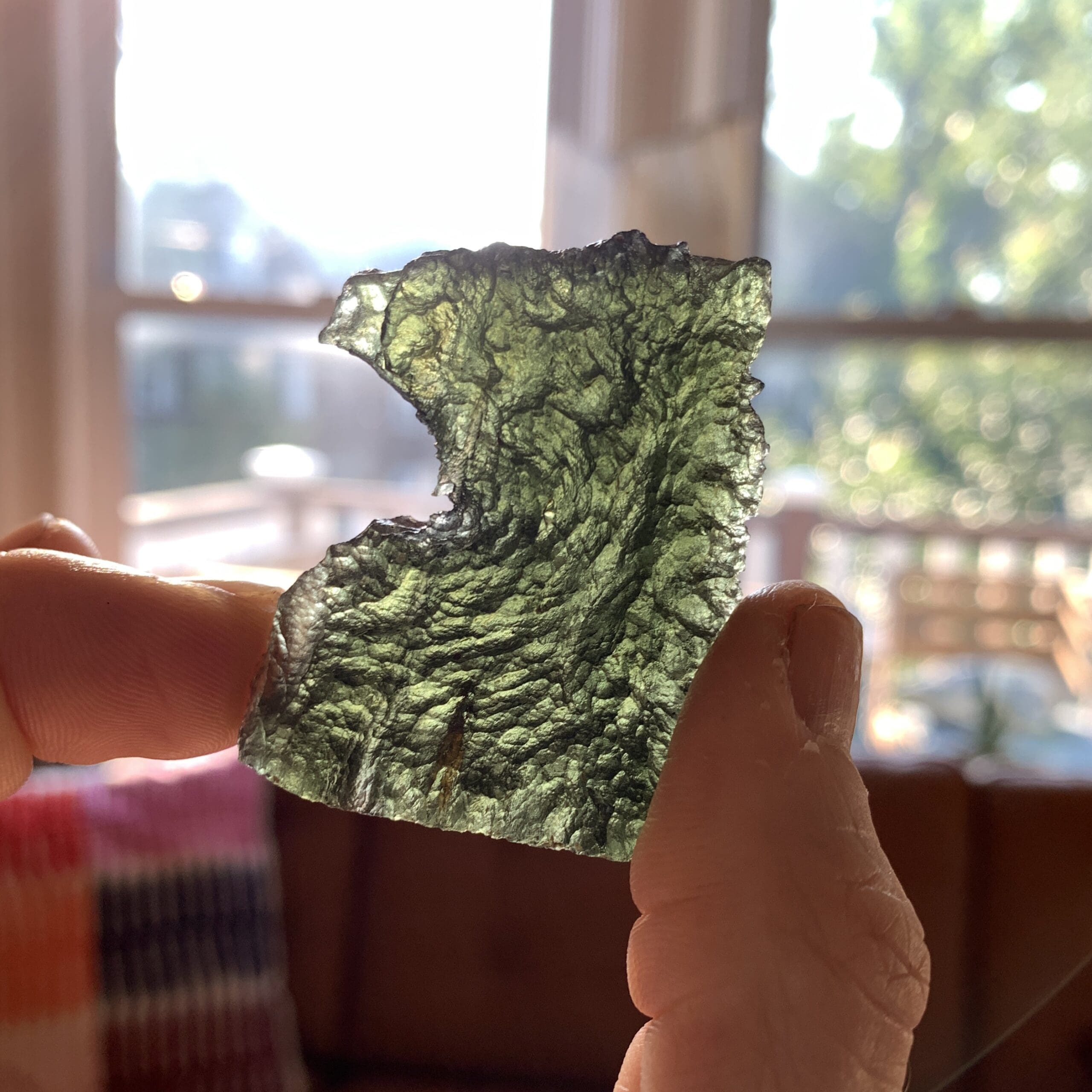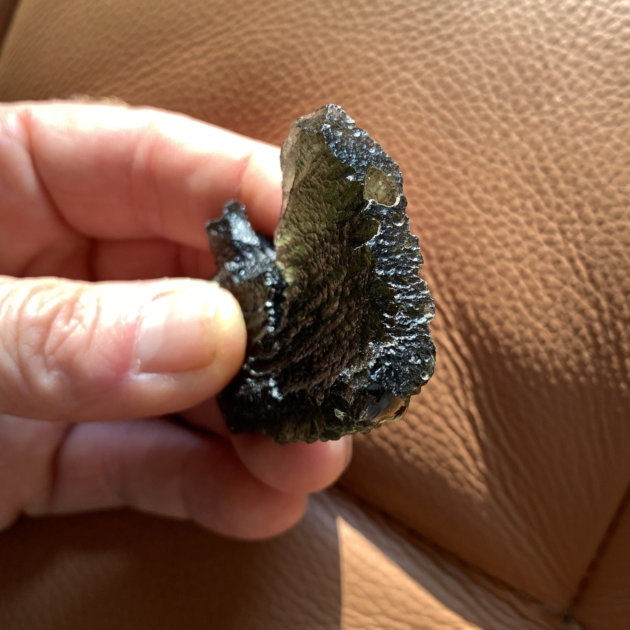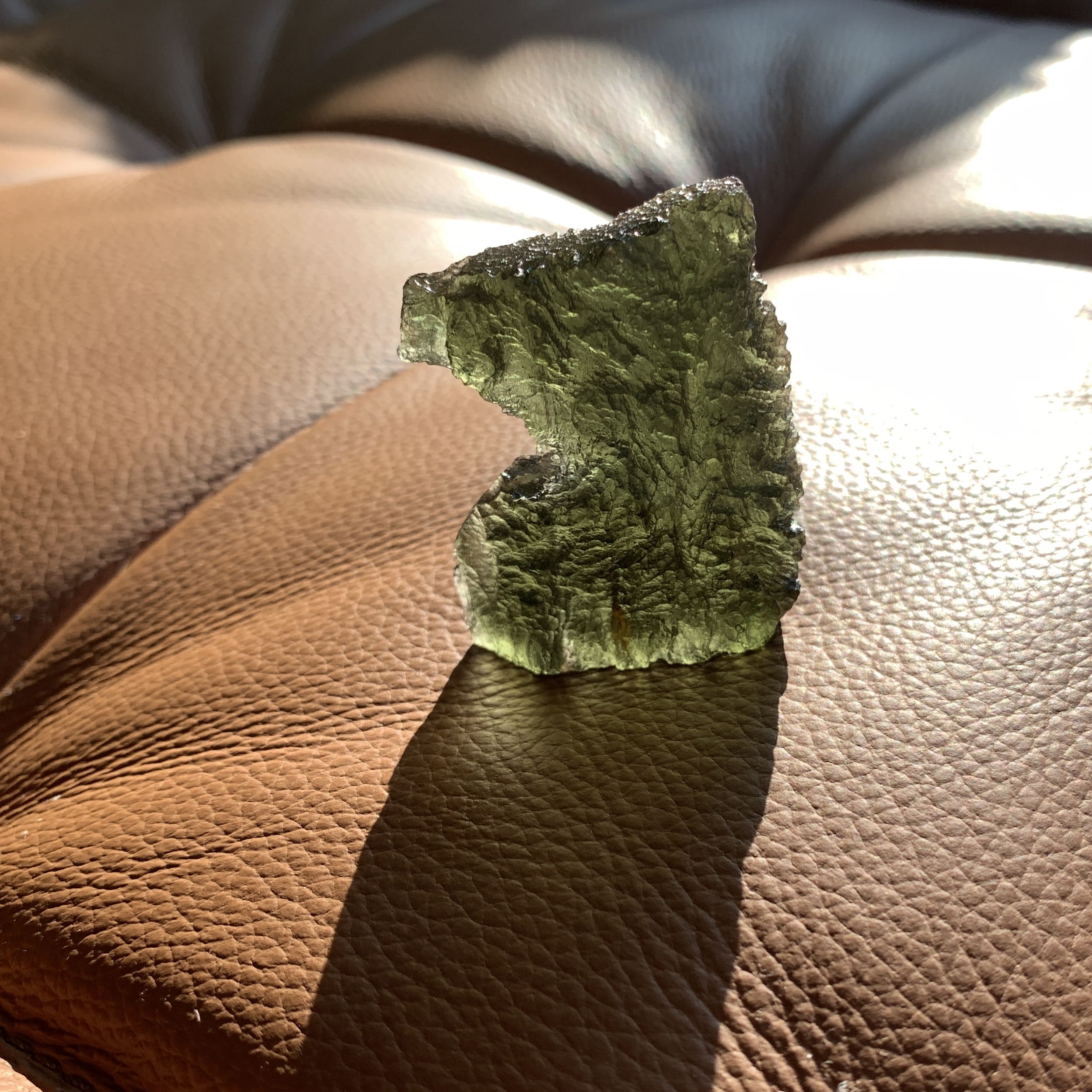 This lovely piece stands in two different ways, resembling a mighty eagle or regal chalice depending on which end is up. Moldavite is the Alien Messenger Stone – facilitating communications from on high – and may also be called the Cosmic Aura stone, due to it’s highly ascendant energy. It’s the only gem quality – and green – Tektite on the planet, formed from a meteoric impact in the Czech Republic 15 million years ago. All of ours are genuine, and we do mail out a Statements of Authenticity with each purchase. Length: 5.6cm; Width: 3.6cm; Height: 4.7cm; Depth: .8cm Weight: 22.22g (.78oz) Origin: Europe (Czech Republic)