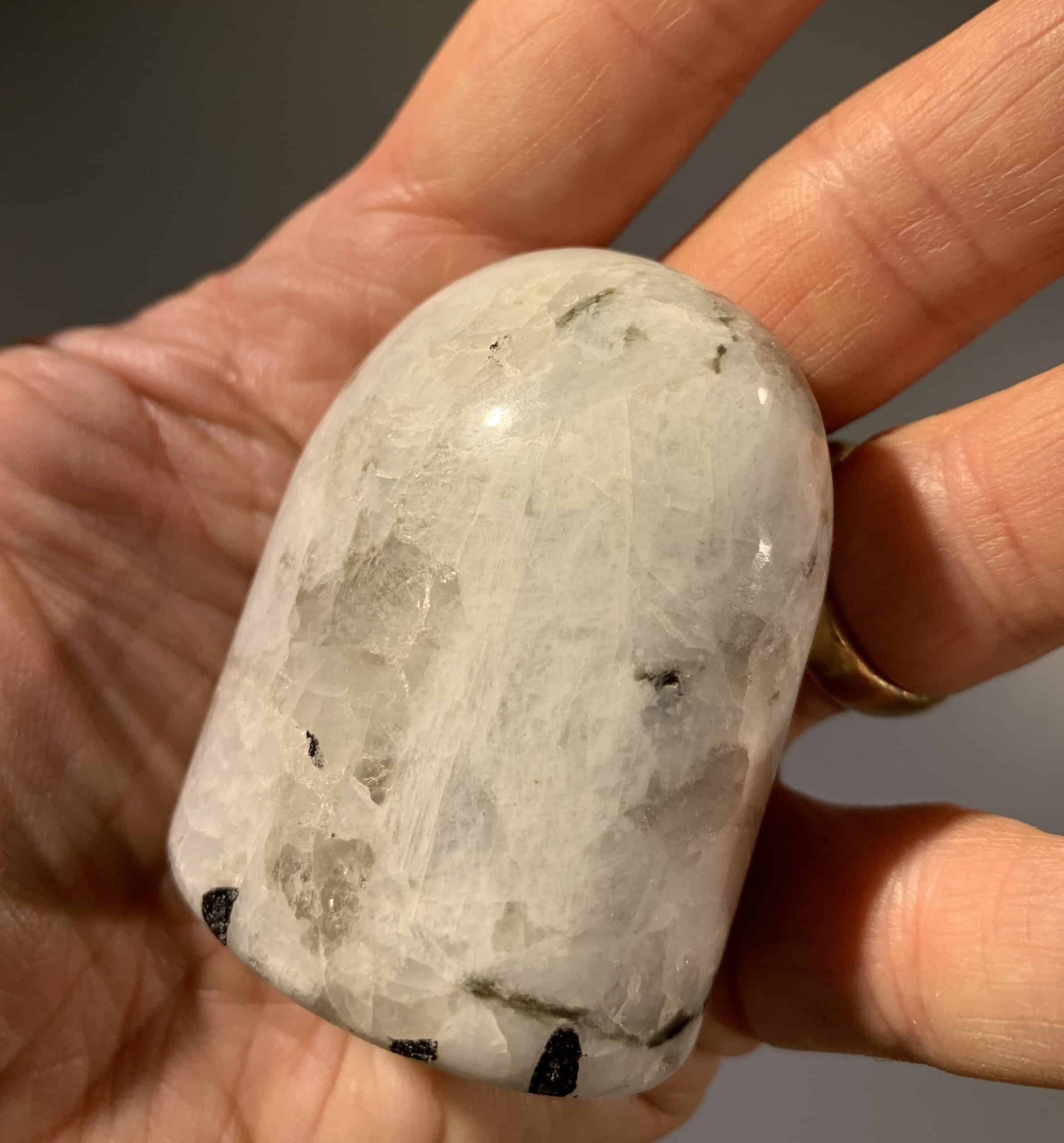 Standing rounded “generator” of rainbow moonstone – not much flash – but black tourmaline embedded in it. Works great also as a palm piece. Attributed to 3 energy zones: Healing, Vision, and Harmonic (multi-chakra). Width: 4.2cm; Height: 5.1cm; Depth: 2.9cm Weight: 116.6g (4.11oz) Origin: Central Asia, India