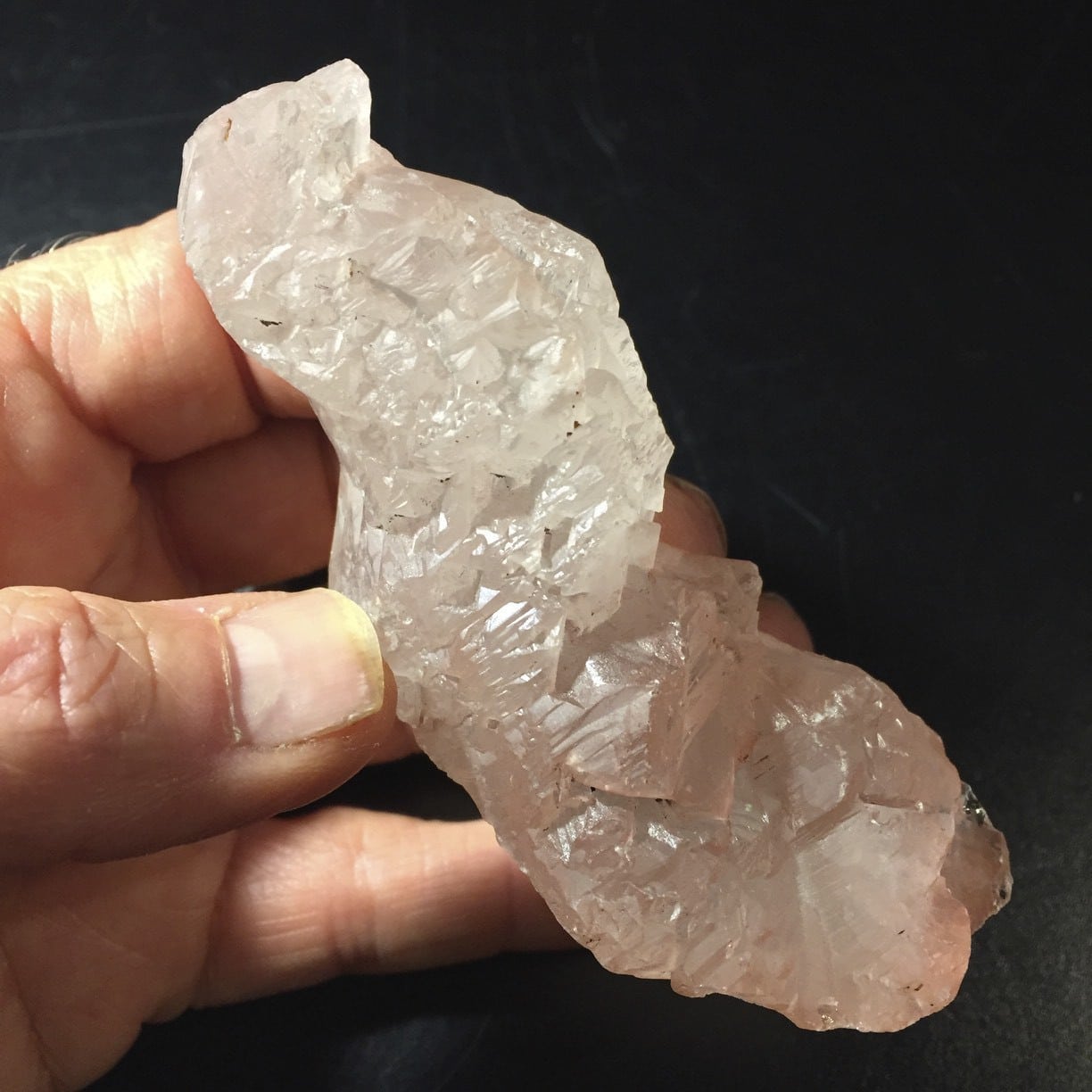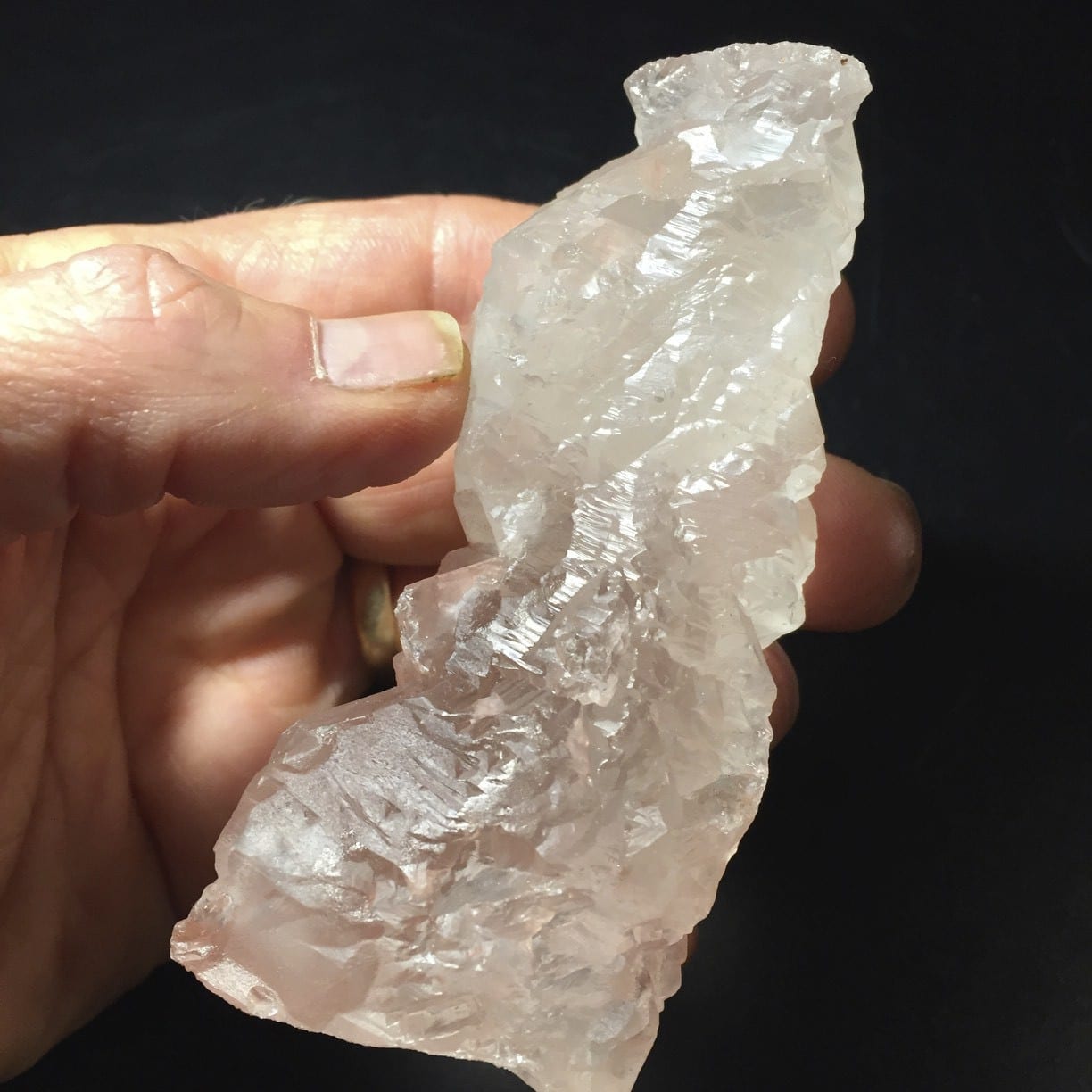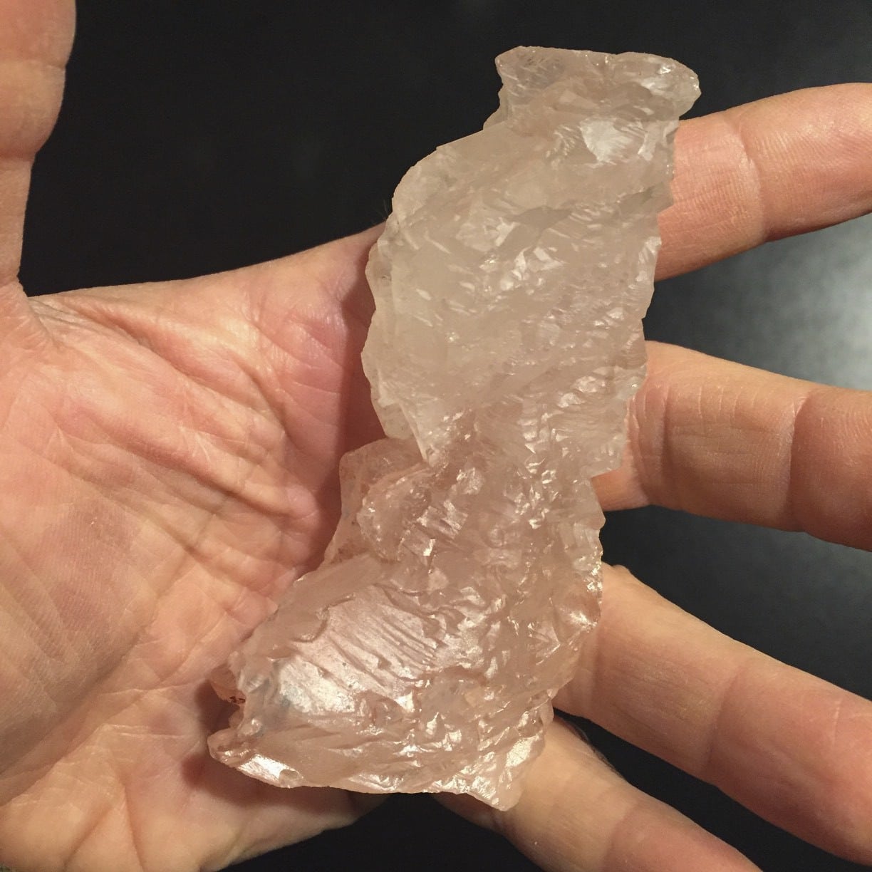 Extraordinary, large Himalayan pink Kulu Quartz, with clear/milky section, looks like a fish diving. Length: 9.1cm; Width: 3.8cm; Depth: 3cm Weight: 118.3g (4.17oz) Origin: Central Asia, Himalayas
