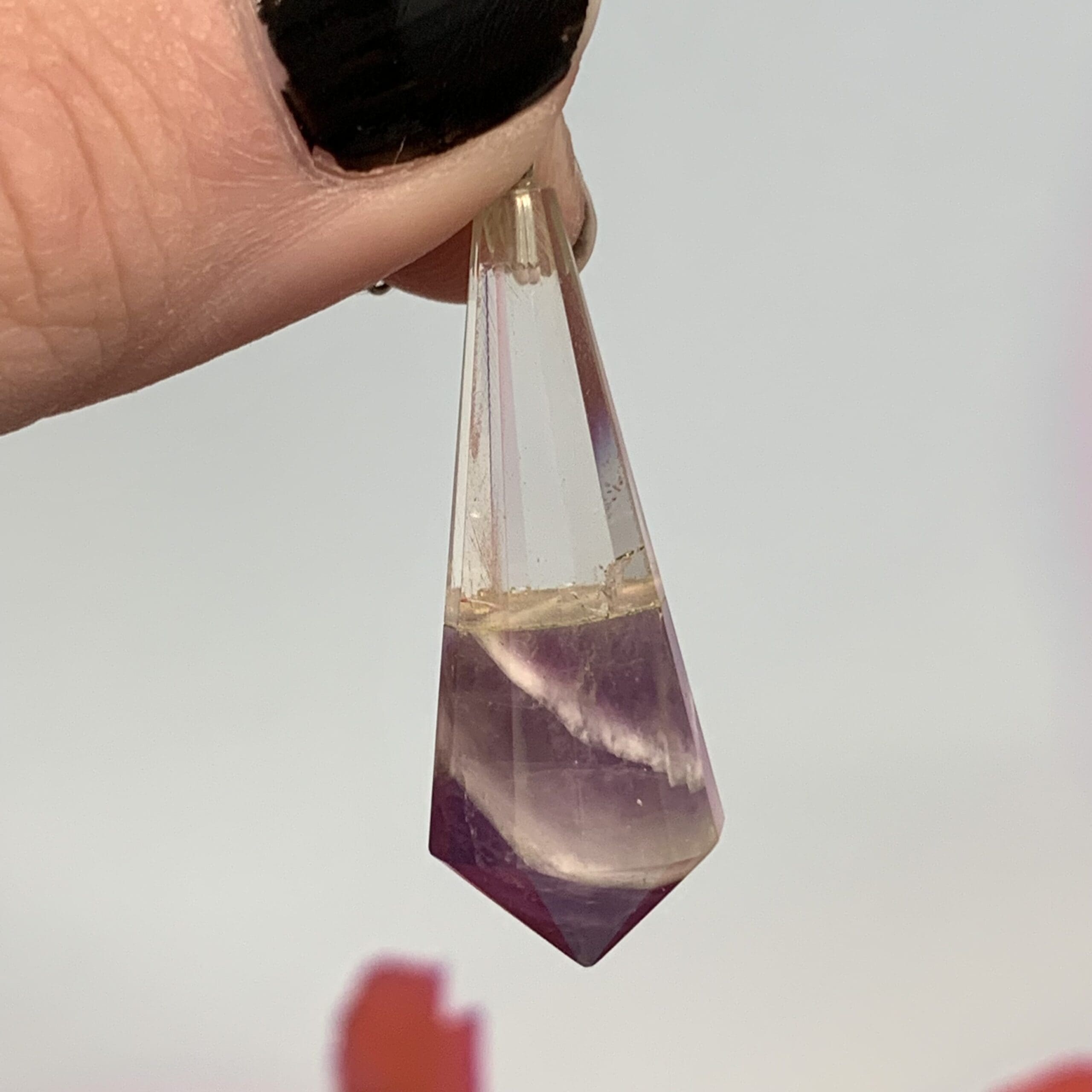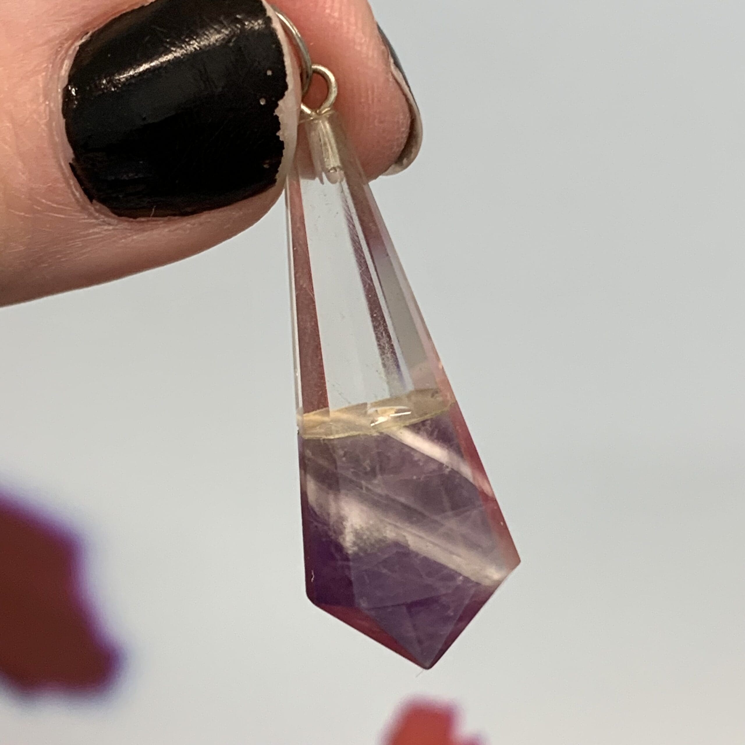 Clear Quartz (about Clarity & Focus) and Chevron Amethyst (about Charity) two-stone pendulum. Very unique combination and style. Has a 6 inch chain. Length: 4.6cm; Width: 1.5cm; Depth: 1.5cm Weight: 36.5ct Origin: Asia, India