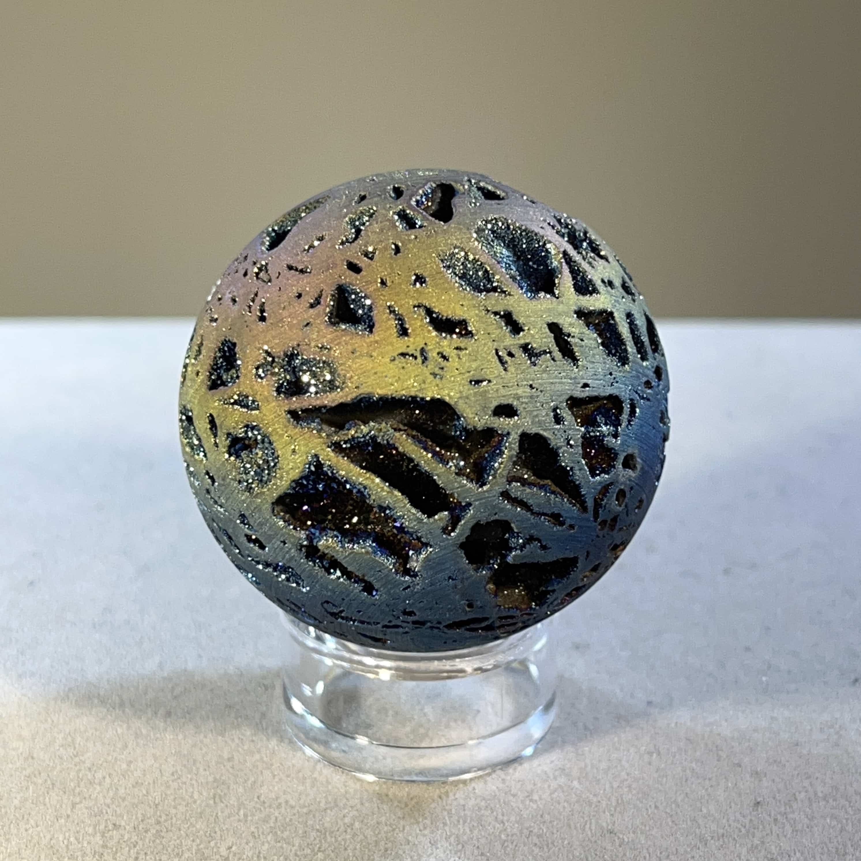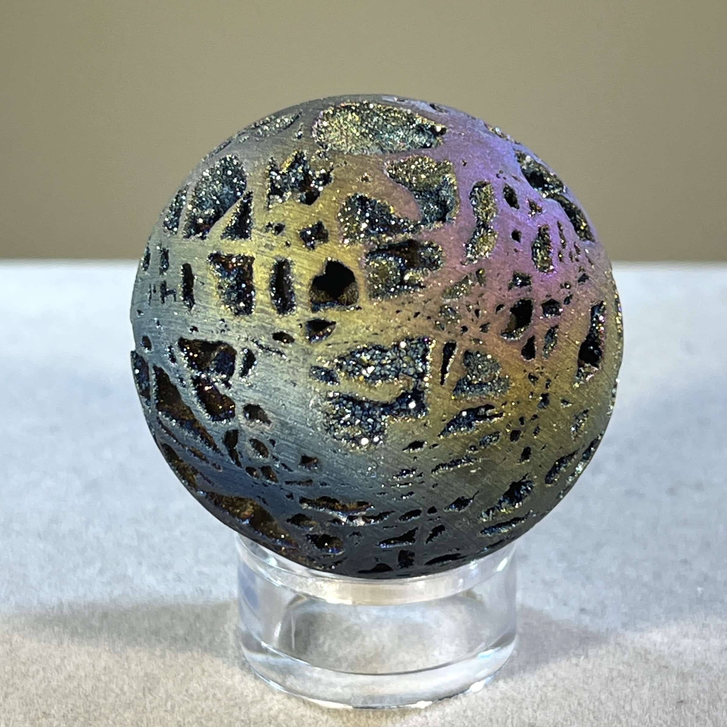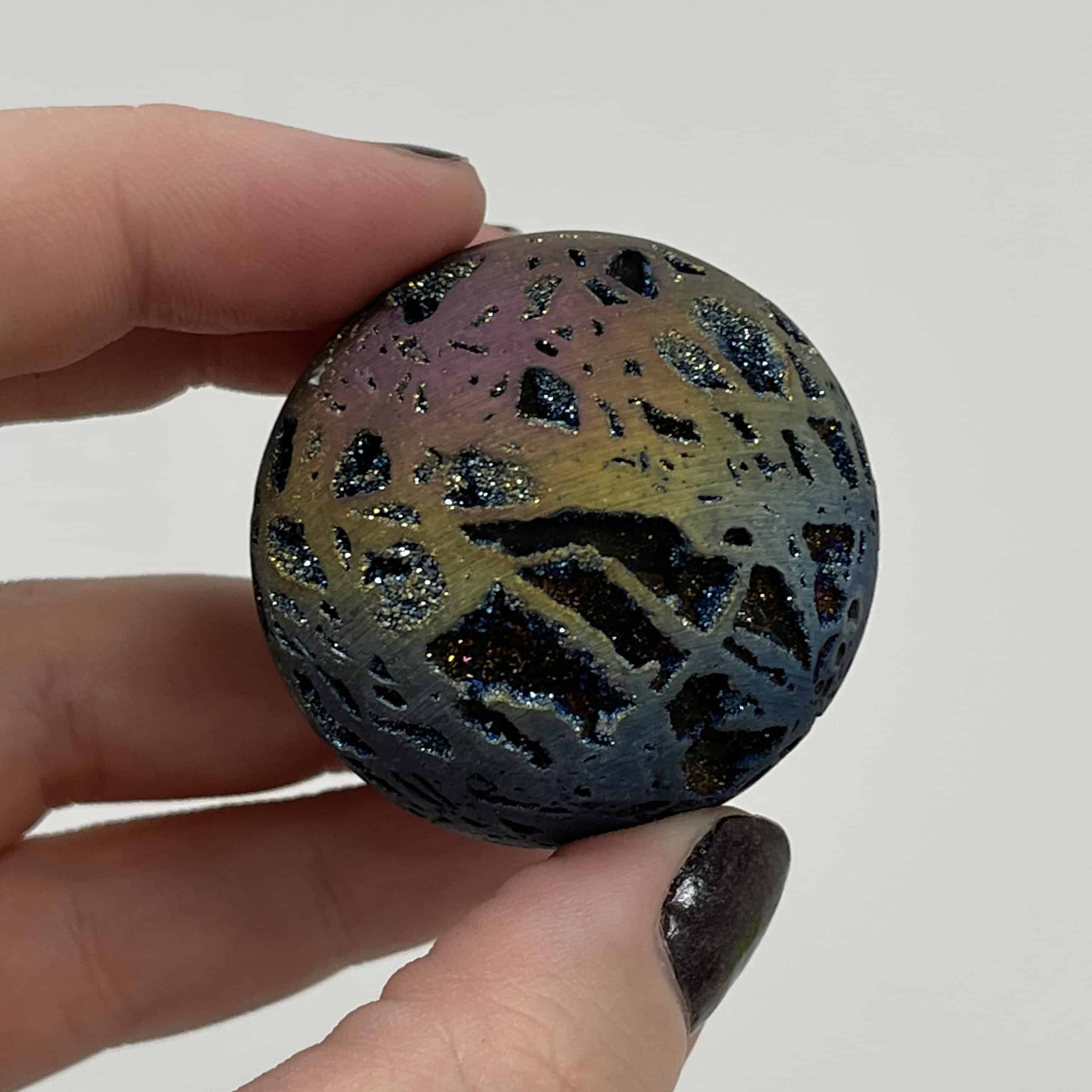 All our in-store globes of this kind sold out, so we’re confident you’ll love this one, with colors from dark blue indigo to purple, pink, orange, and yellow, lighter blue. It’s all there on this galactic journey. Aura treated (plated with precious metals, in this case Titanium) Quartz is usually quite ghostly and spacy, but this material is exceptionally well grounded (for being like a floating planet)! Length: 4.2cm; Width: 4.2cm; Depth: 4.2cm Weight: 77.1g (2.72oz) Origin: Asia, China