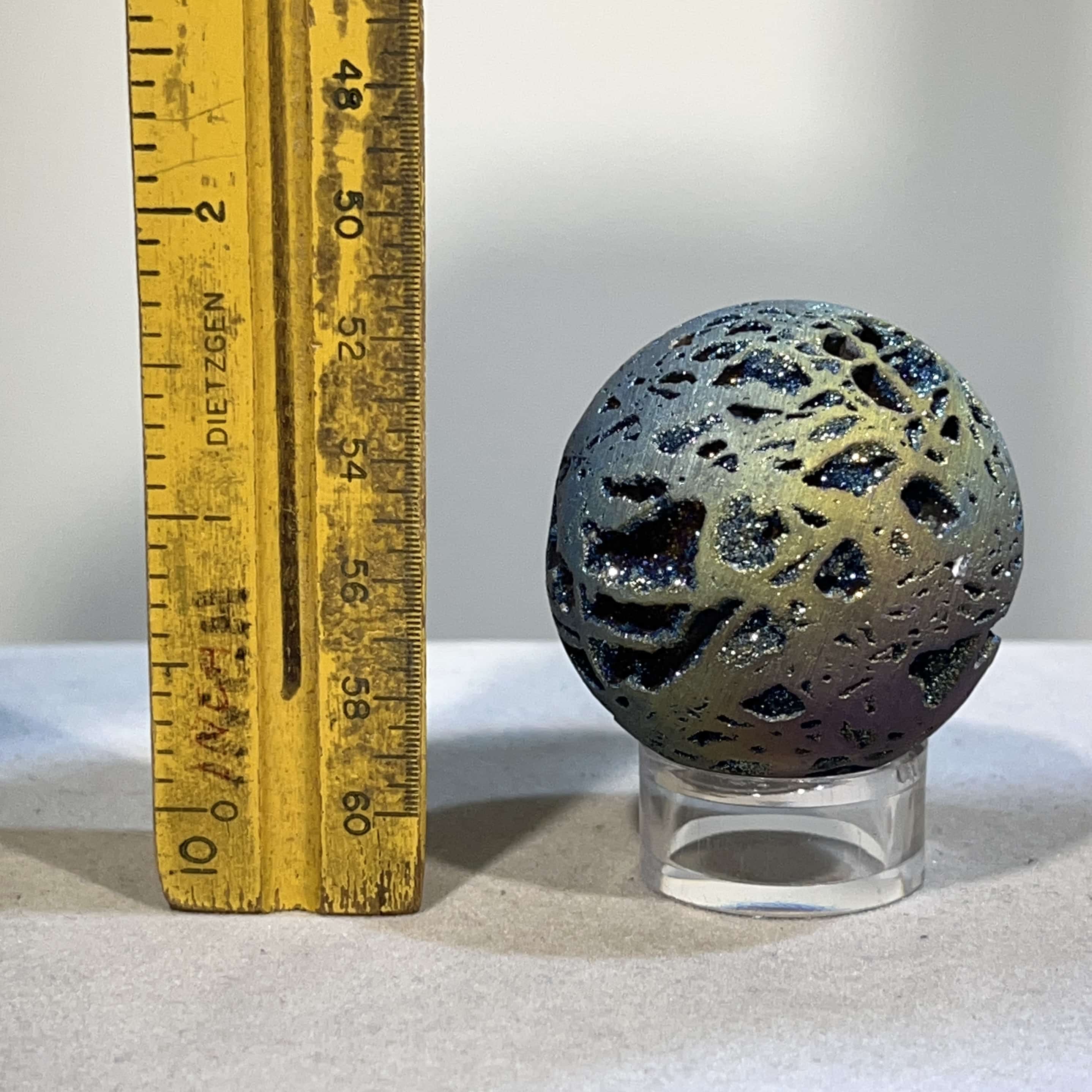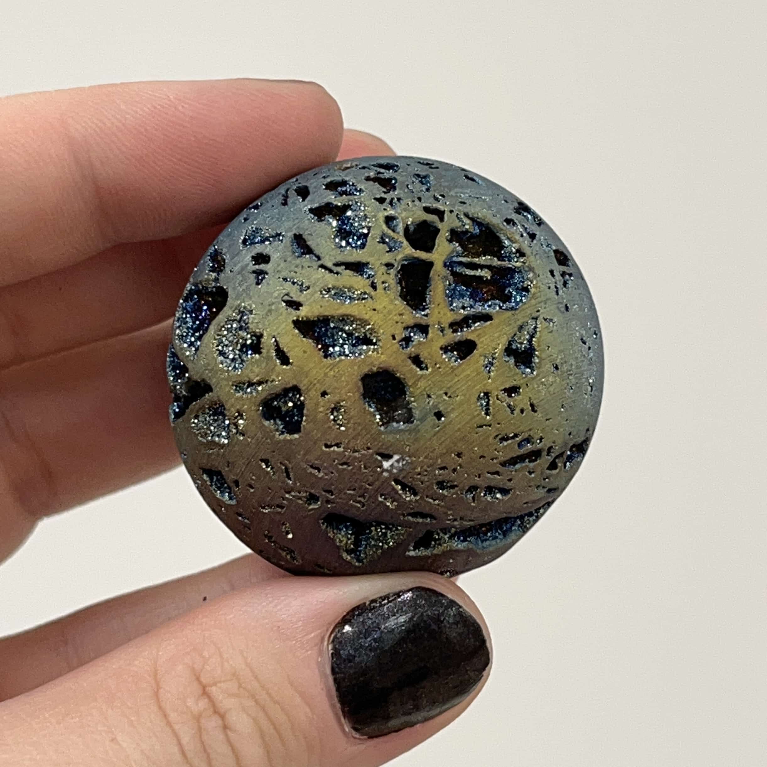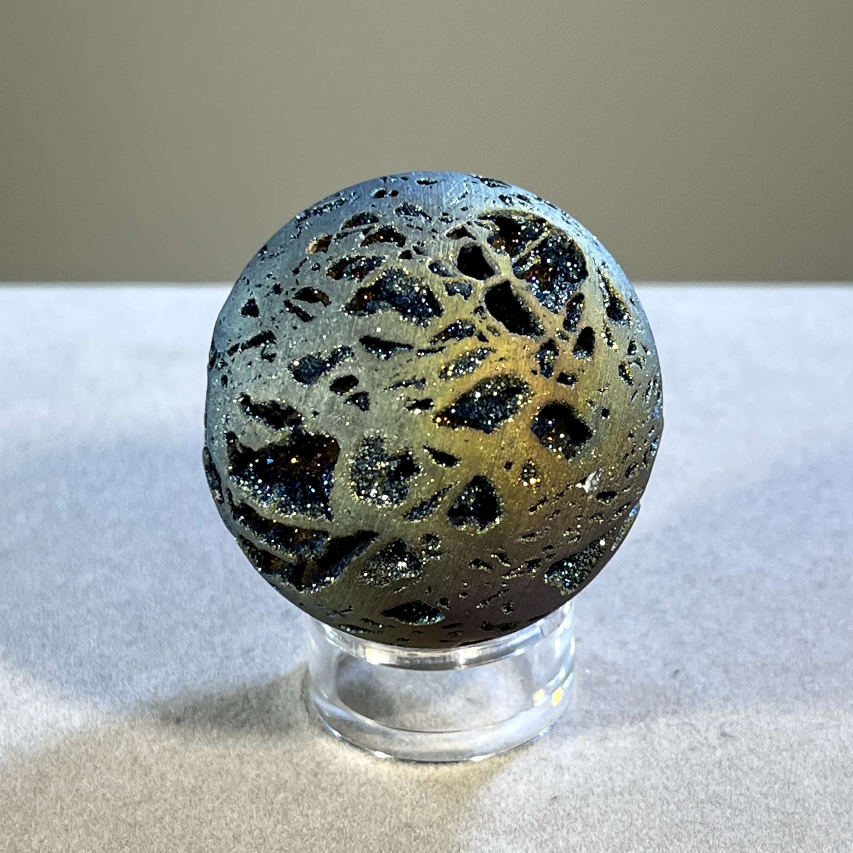 All our in-store globes of this kind sold out, so we’re confident you’ll love this one, with colors from dark blue indigo to purple, pink, orange, and yellow, lighter blue. It’s all there on this galactic journey. Aura treated (plated with precious metals, in this case Titanium) Quartz is usually quite ghostly and spacy, but this material is exceptionally well grounded (for being like a floating planet)! Length: 4.2cm; Width: 4.2cm; Depth: 4.2cm Weight: 77.1g (2.72oz) Origin: Asia, China