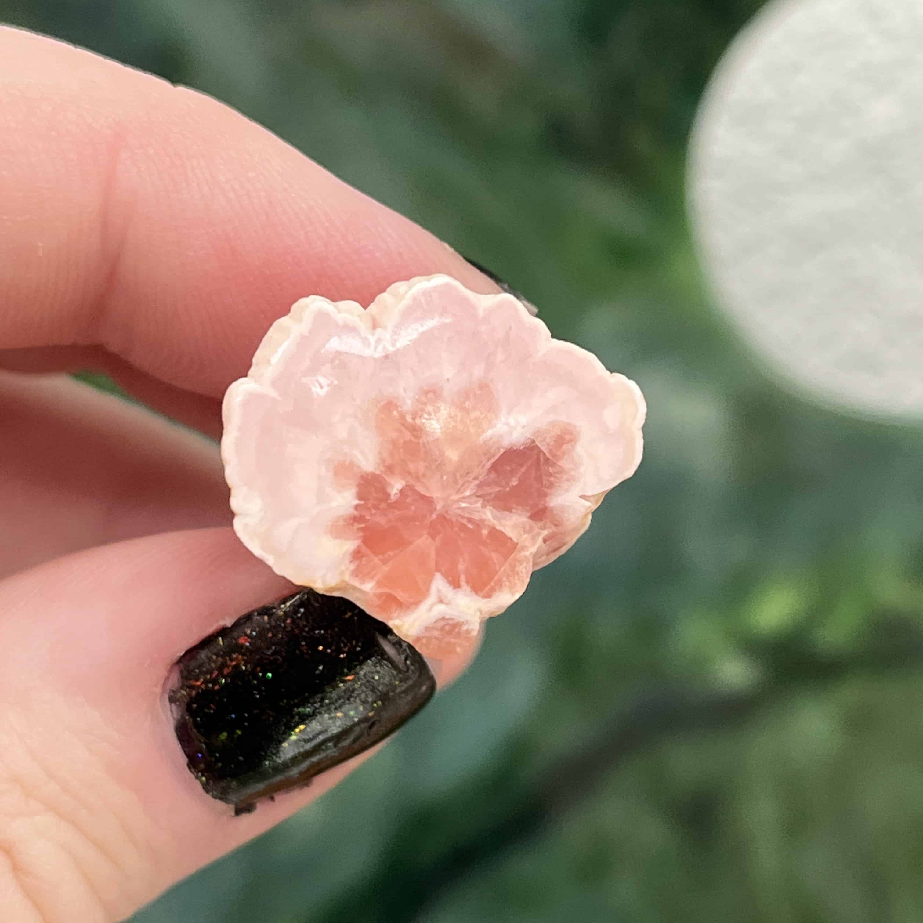 This extraordinary specimen has a rich red core, and softer pink exterior, that it totally terminated (and naturally standing, with its polished bottom). We believe Rhodochrosite is one of the key Root Energy Zone stones, connected to regeneration and cellular vitality. Rare to find a good, complete, AND polished specimen. Length: 3.3cm; Width: 2.2cm; Height: 3.3cm; Depth: 1.9cm Weight: 54.5ct Origin: Latin America, Argentina