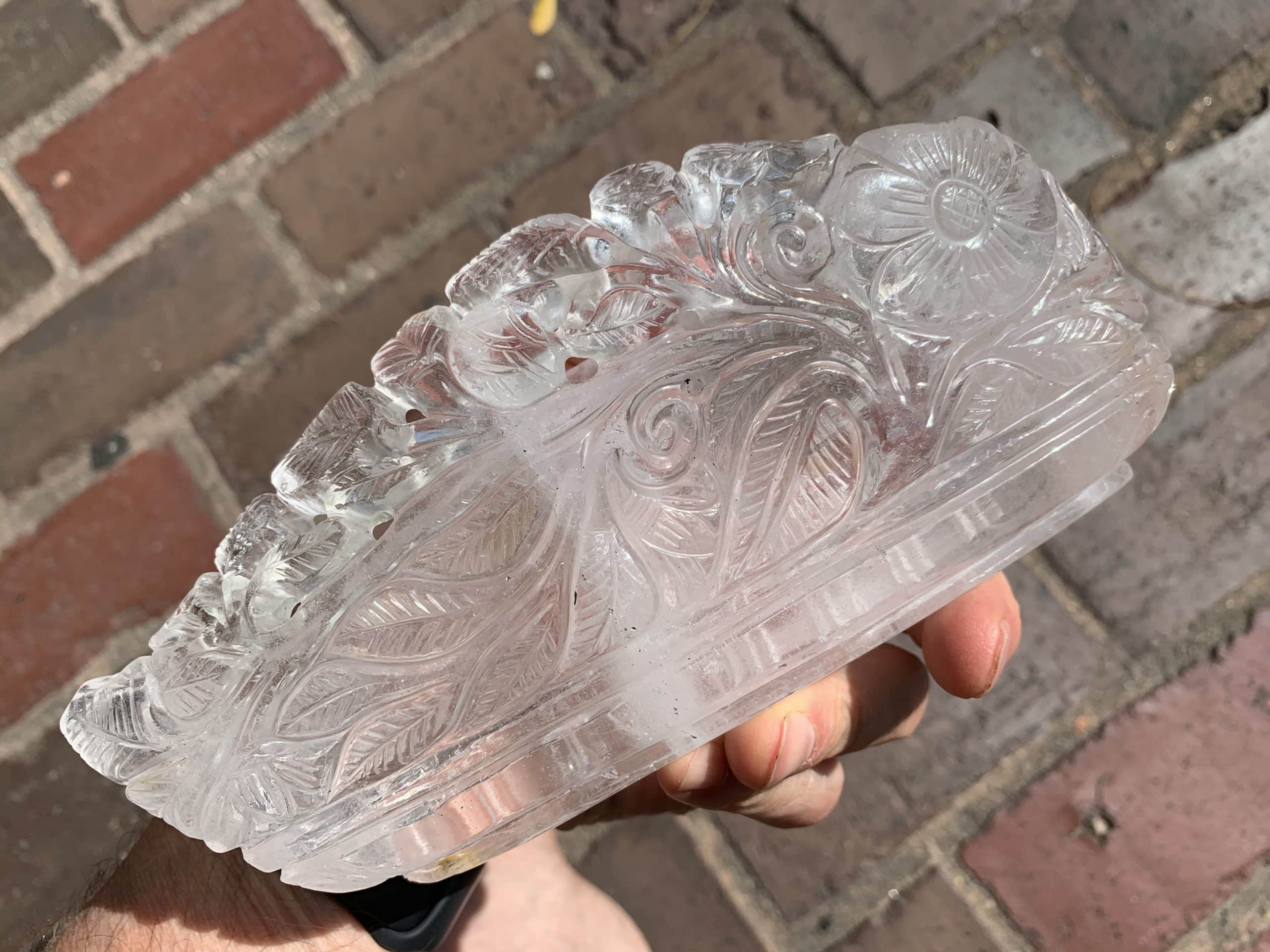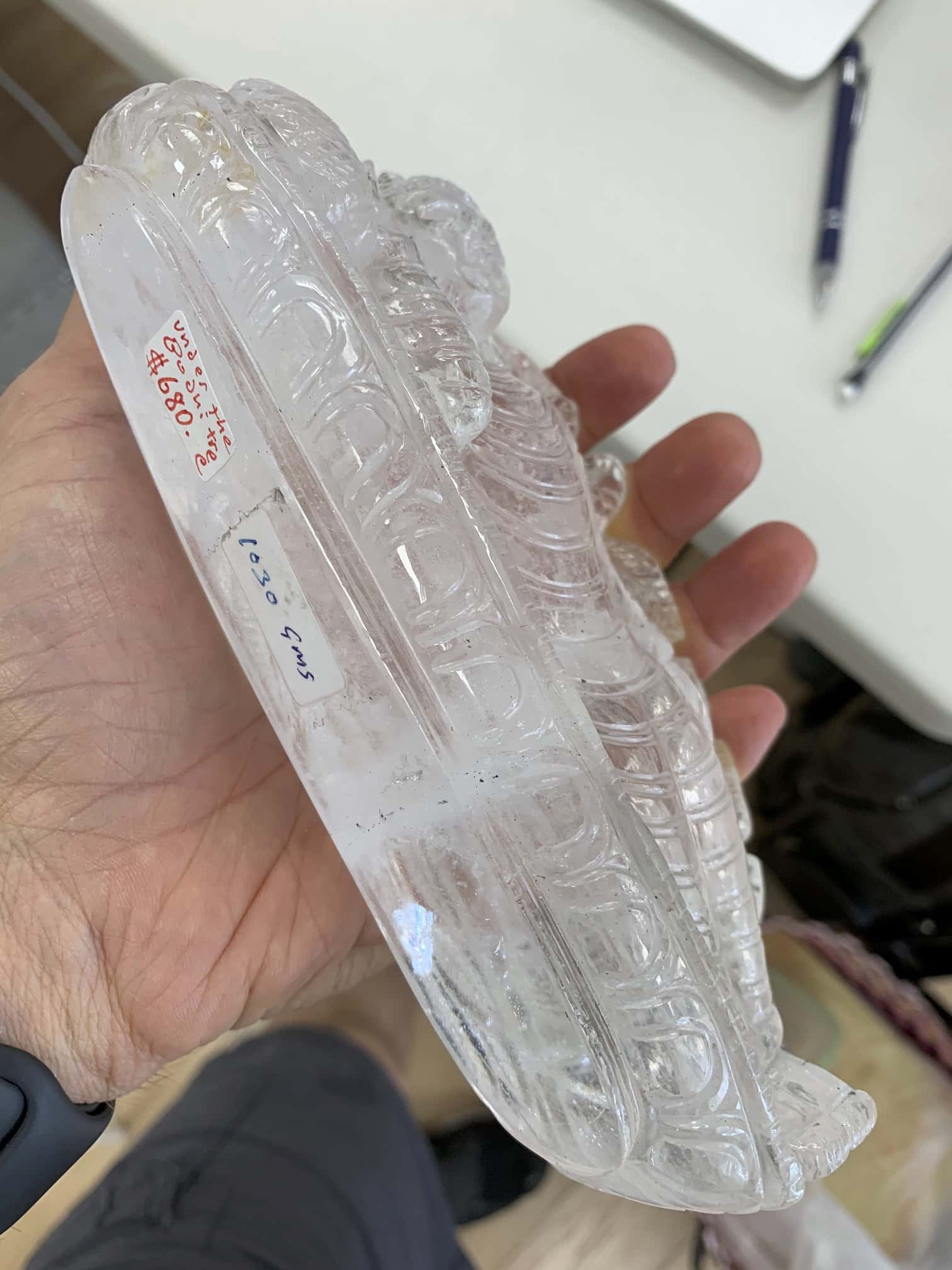 A large, single piece (two and a quarter pounds) of beautifully carved (single-piece) Quartz. This Buddha is lying down under the Bodhi tree, with lots of great arboreal detail on the back. Ask for more photos or a video of it, to get the full wonder of this piece. Length: 19.3cm; Height: 8.9cm; Depth: 4.2cm Weight: 1030g (36.33oz) Origin: Central Asia, India