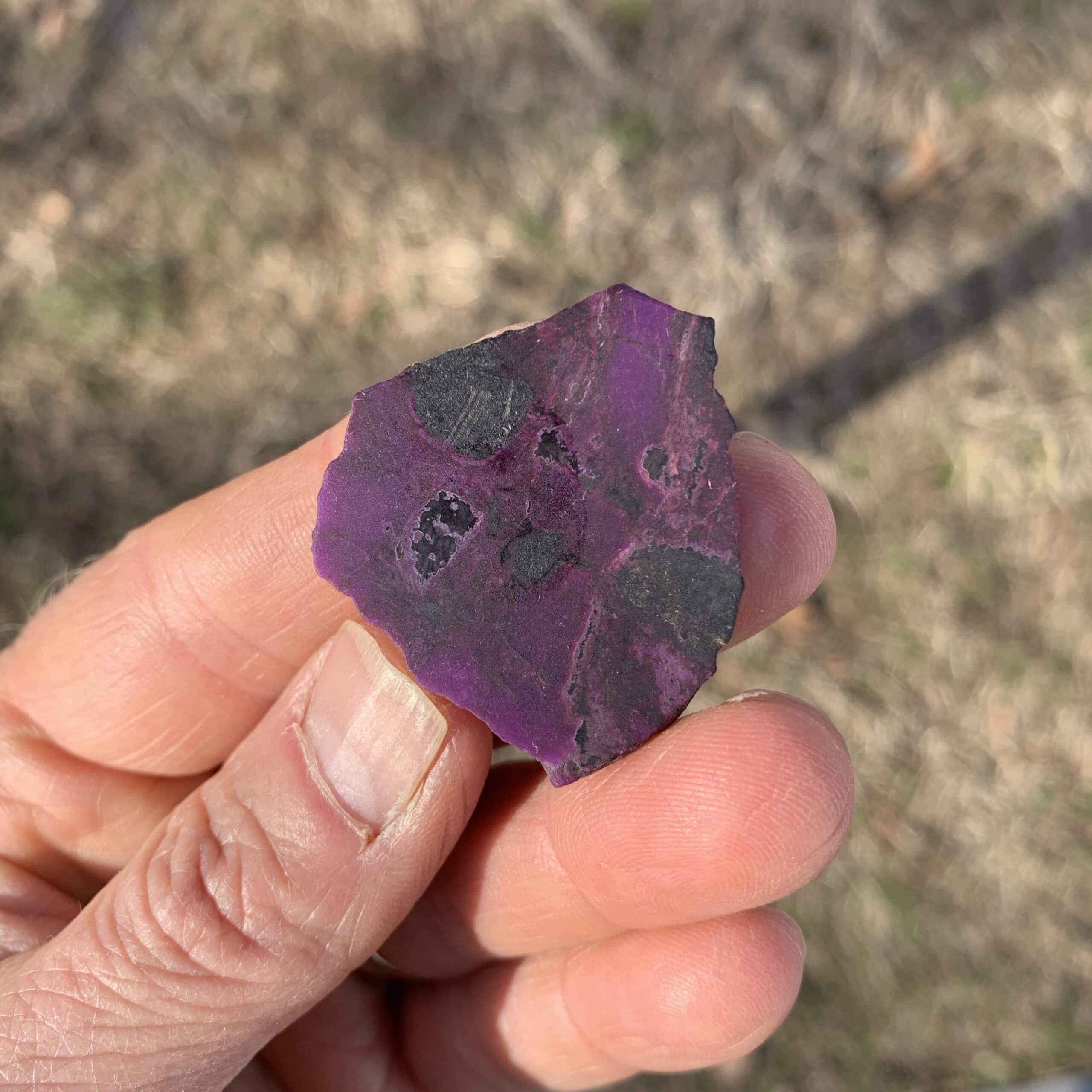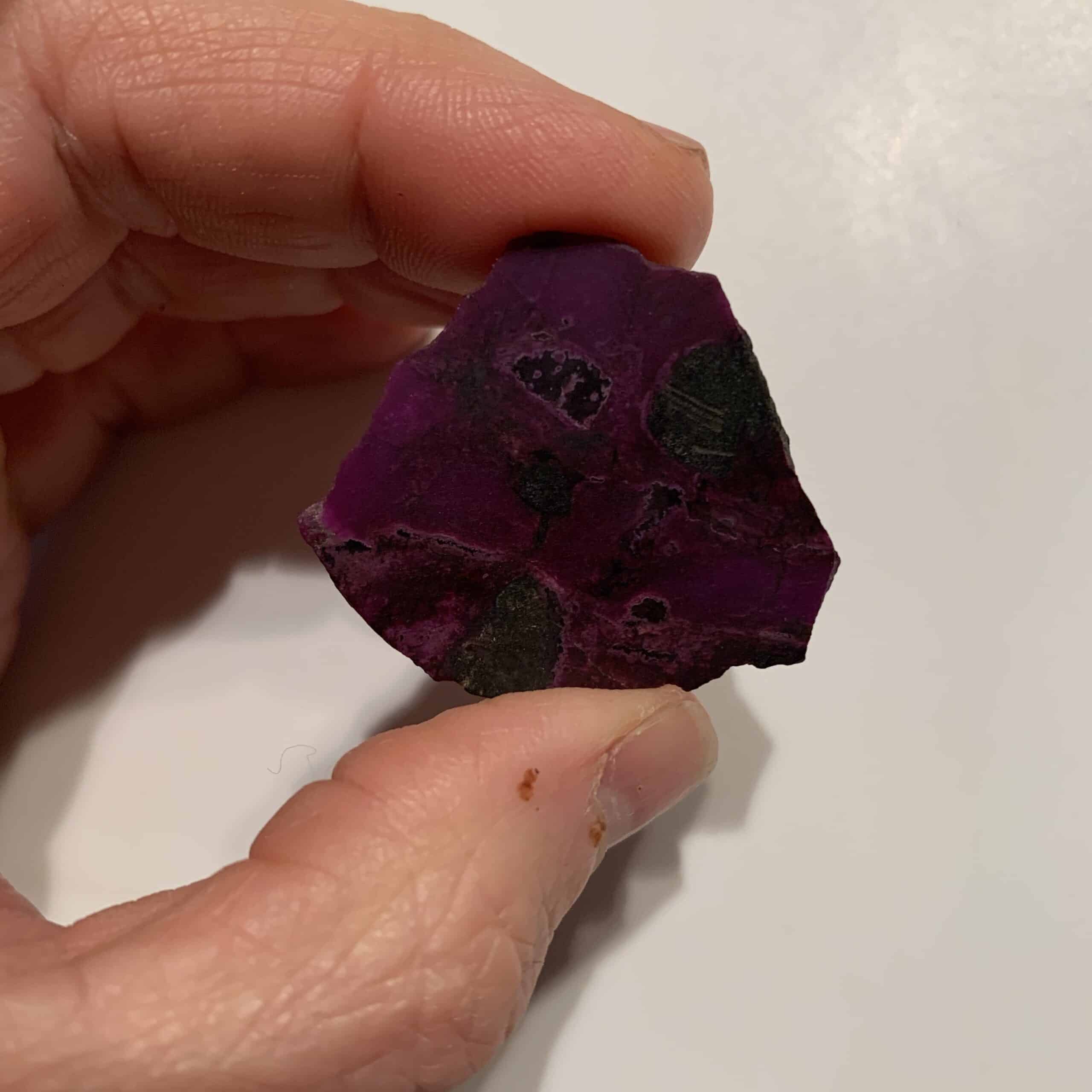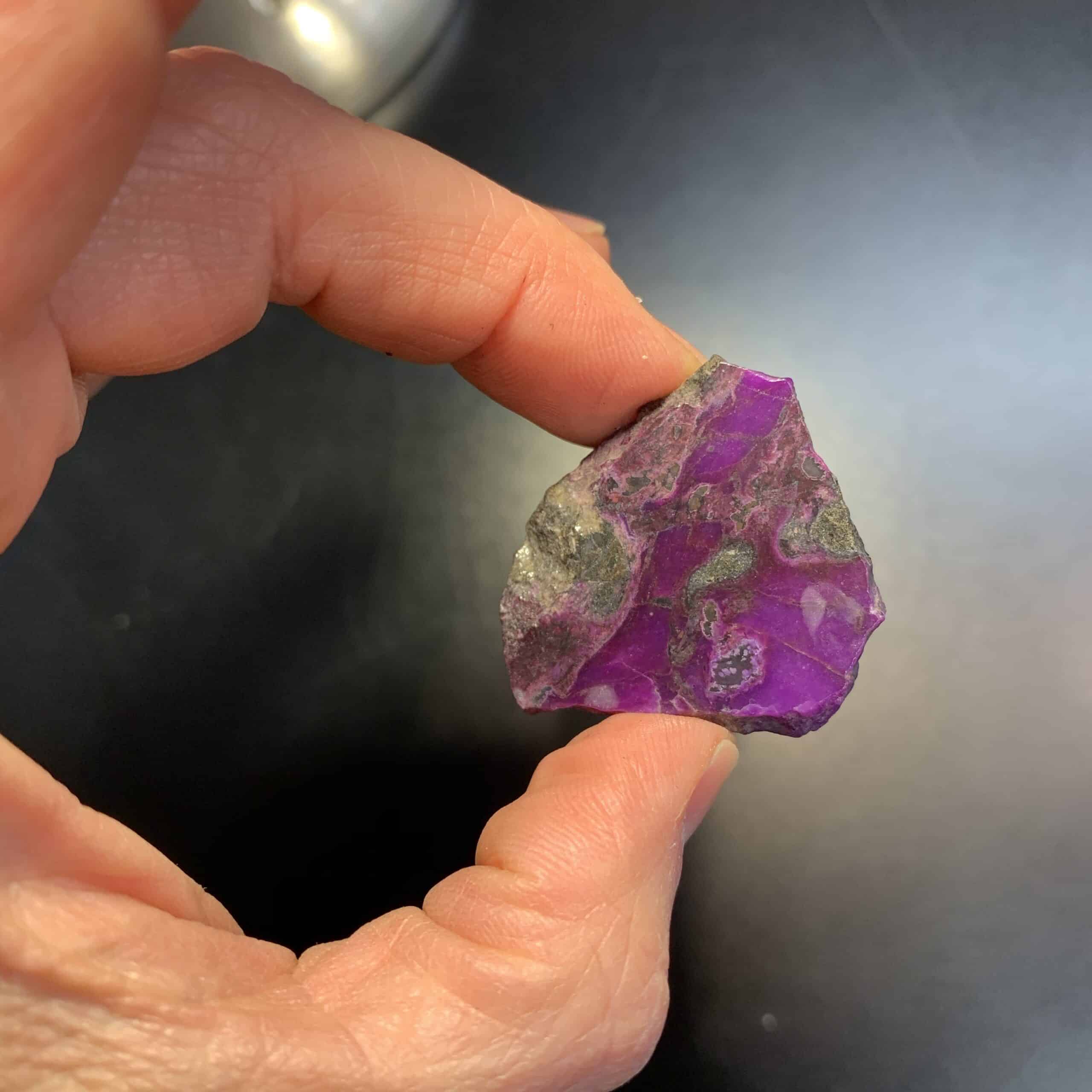 In the Crystal Concentrics paradigm, Sugilite is the ultimate Manifestation Stone, acting by celestial osmosis to bring into being what you hope and seek for. Sugilite comes from South Africa, was mined out in the 70’s and 80’s, and most of what’s available on the market today is disappointingly impure and low grade. Also, most vendors portray it with poor color reproduction and wet, so it looks like it might if it were cut and polished. You can see water on Kyle’s hand on the pieces shown wet. We like to show you what they look like dry too (as possible), ’cause that’s the truest test of the stone’s quality. The color is more vibrant when seen wet (or if polished). Sugilite is one of our favorite types of stones, and we’re hoping to set a new standard in grading and presentation quality for this extraordinary variety. Feel free to contact us with interest, as much of our merchandise is off line. We can post more pieces depending on your interest. Our prices on this material are not so flexible, because we’ve put a lot of energy into seeking, grading and marking these appropriately, relative to one another. The more a piece is, the more rare and deserving it is of having that price tag applied to it. Once you familiarize yourself with our inventory, you’ll understand how we’ve arrived at each unique price. Feel free to contact us with any questions. Oh, and in closing, you’ll notice that we also prefer natural pieces, uncut or polished (unless in or for jewelry), with harmoniously pleasing shapes and uniformity of color wherever possible. Length: 3.8cm; Width: 3.3cm; Depth: .3cm Weight: 39ct Origin: Africa, South Africa