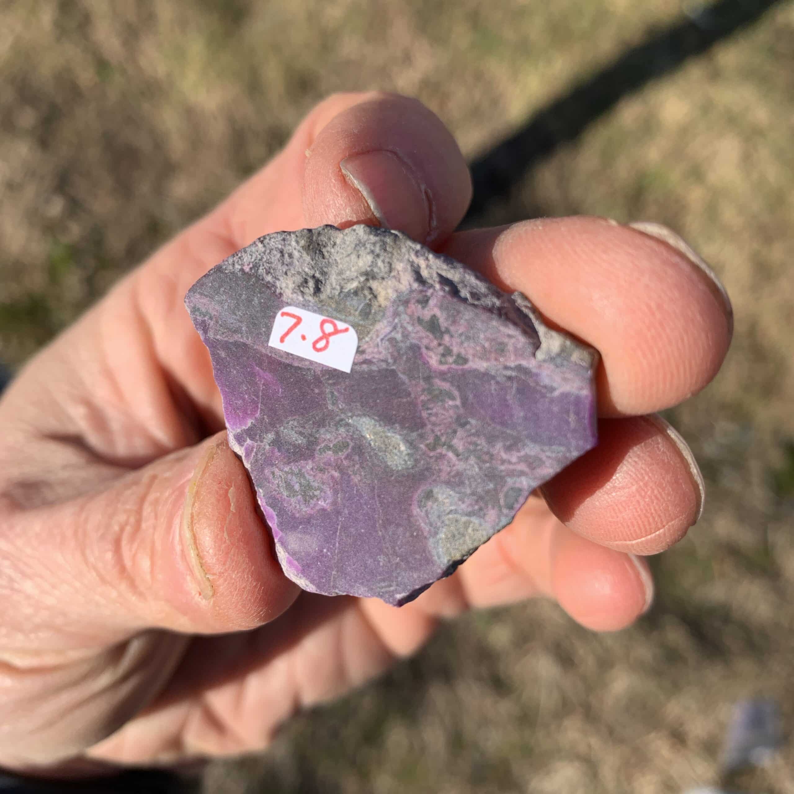 “Pink n Blue Pyramid” – this exquisitely fine nugget stands 3 ways – and has a pinker side (and a more purple sector), with a baby blue dot and veins, all enhanced when pictured wet. Note (in case it’s not obvious) the photos alternate wet, dry, wet, etc.