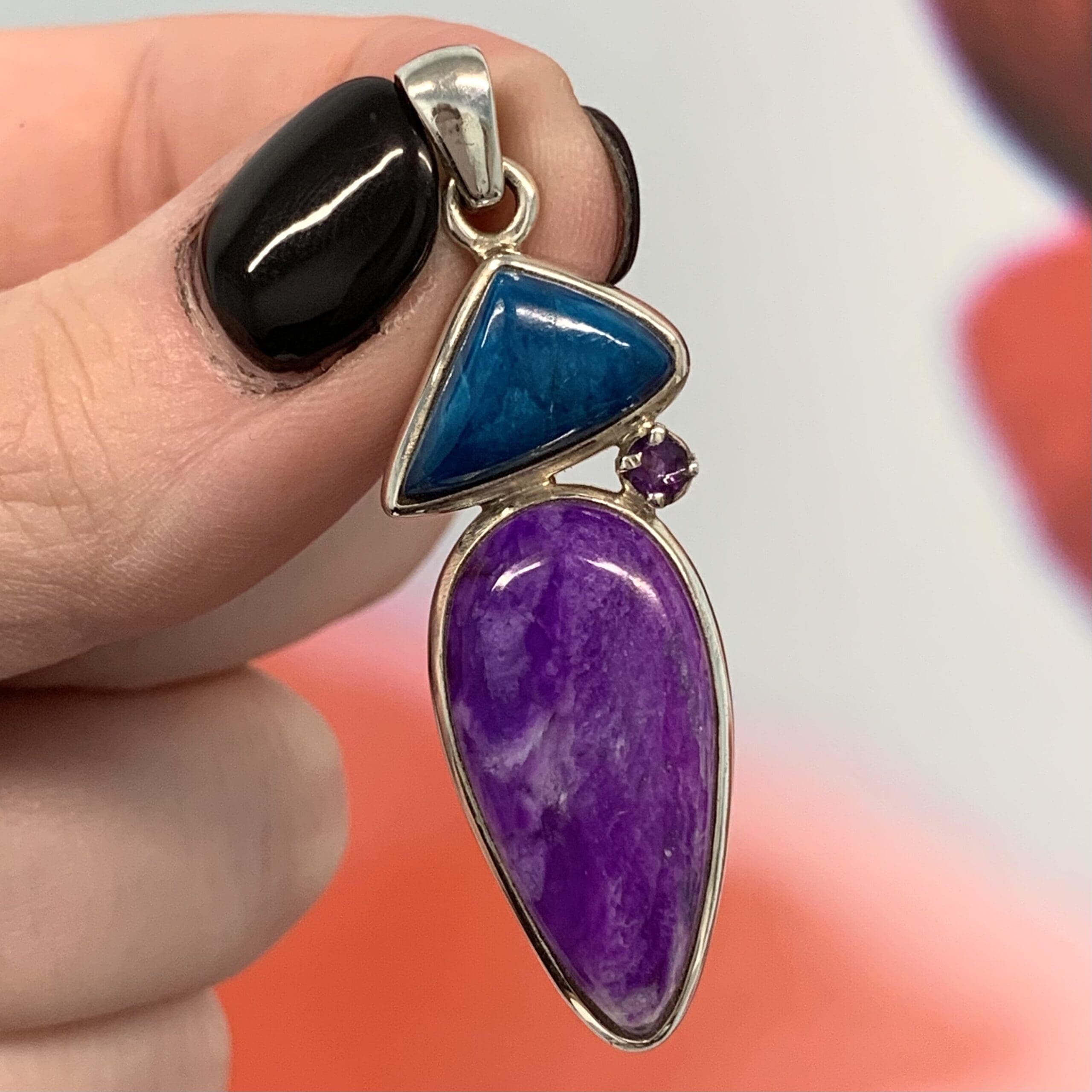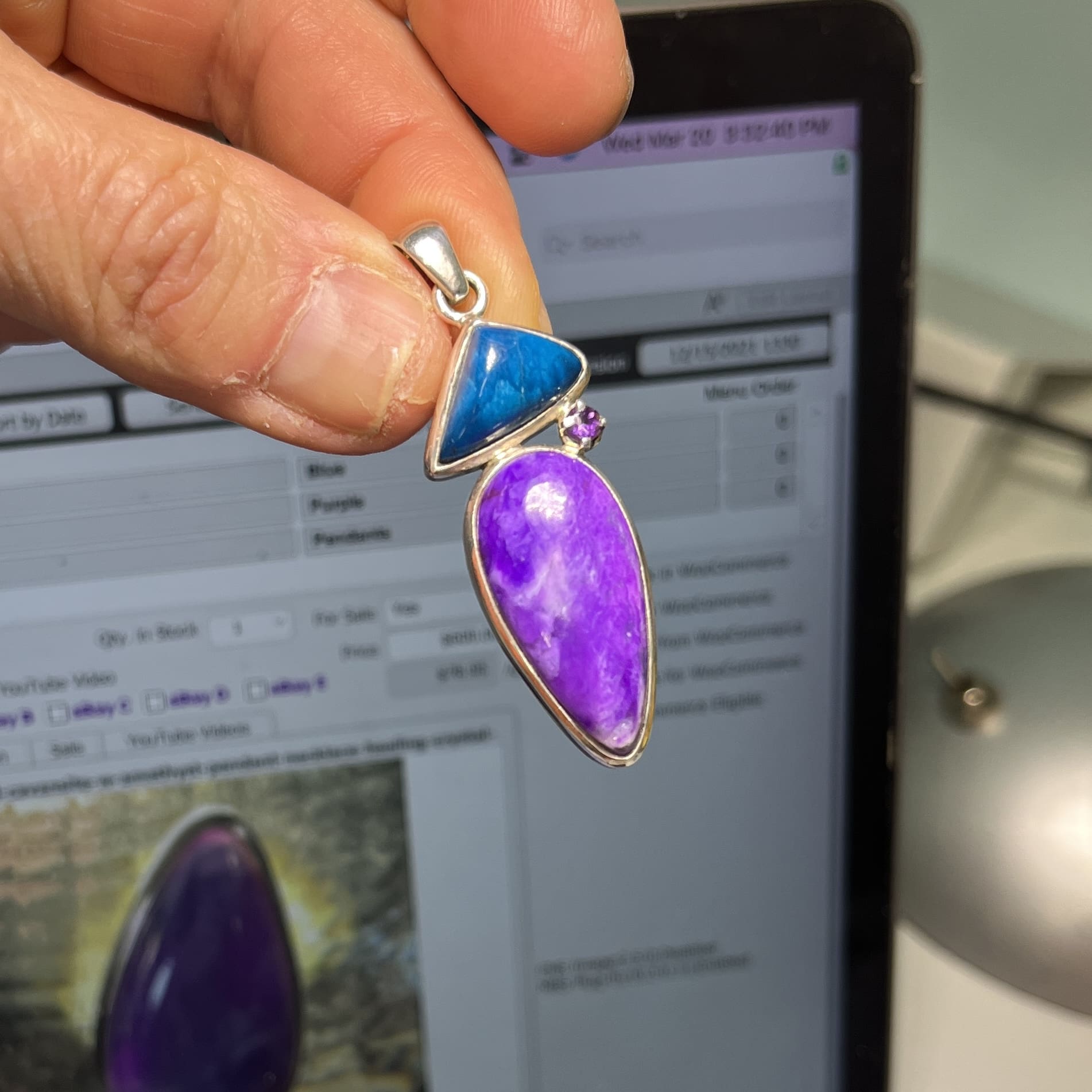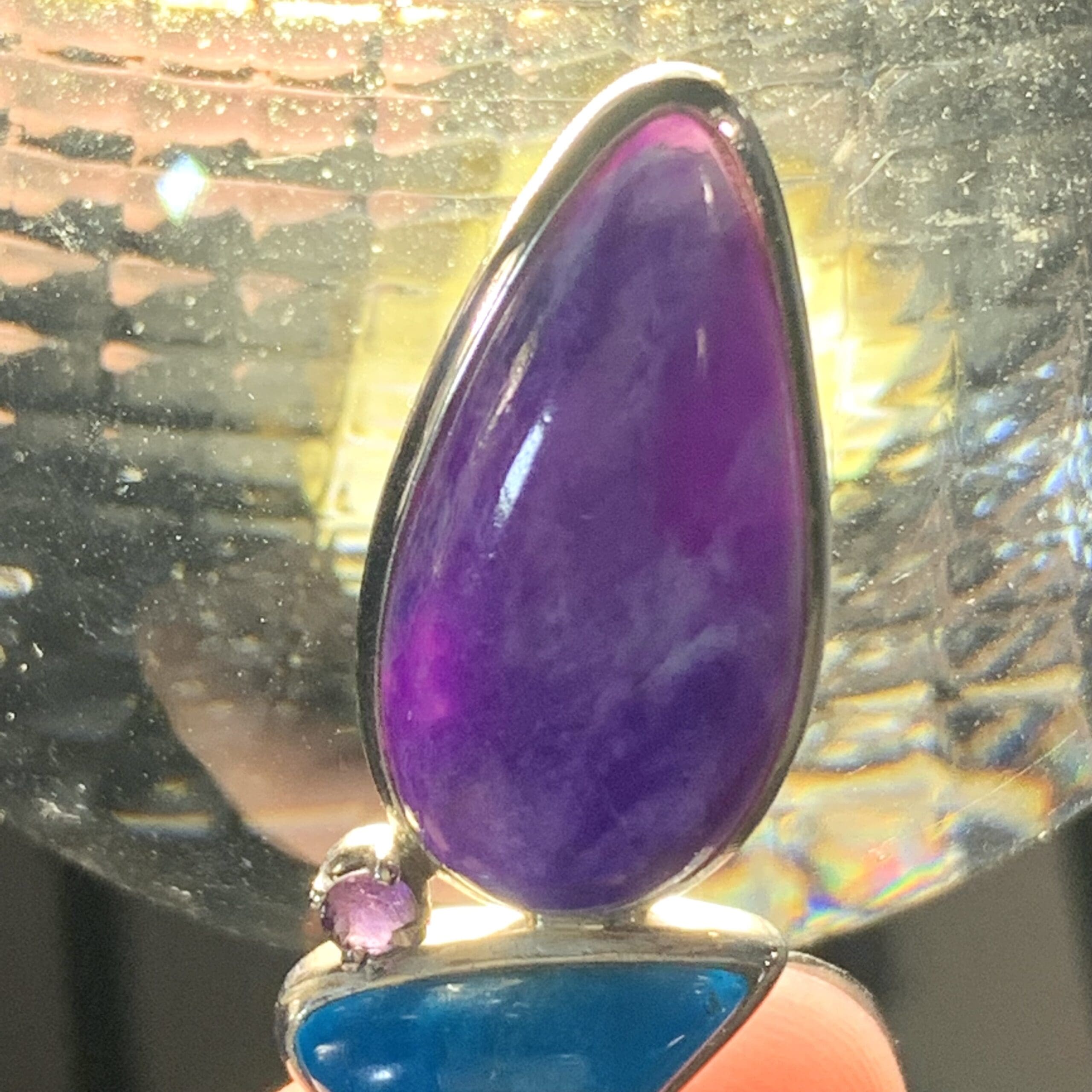 Stellar piece, might have been made in the 90’s or early 200’s, with the composite construction of a tiny Amethyst and a bigger, sail-shaped polished blue Cavansite (from India, where it was crafted). Of course Sugilite is the rare (mined out in the 70’s & 80’s) Manifestation Stone that is one of our favorite materials, particularly with the translucent pink gel that everyone loves. And you can see how “photosynergistic” it is, brightening up, the more light you put on it. Width: 1.5cm; Height: 5.1cm; Depth: .5cm Weight: 38ct Origin: Africa, South Africa