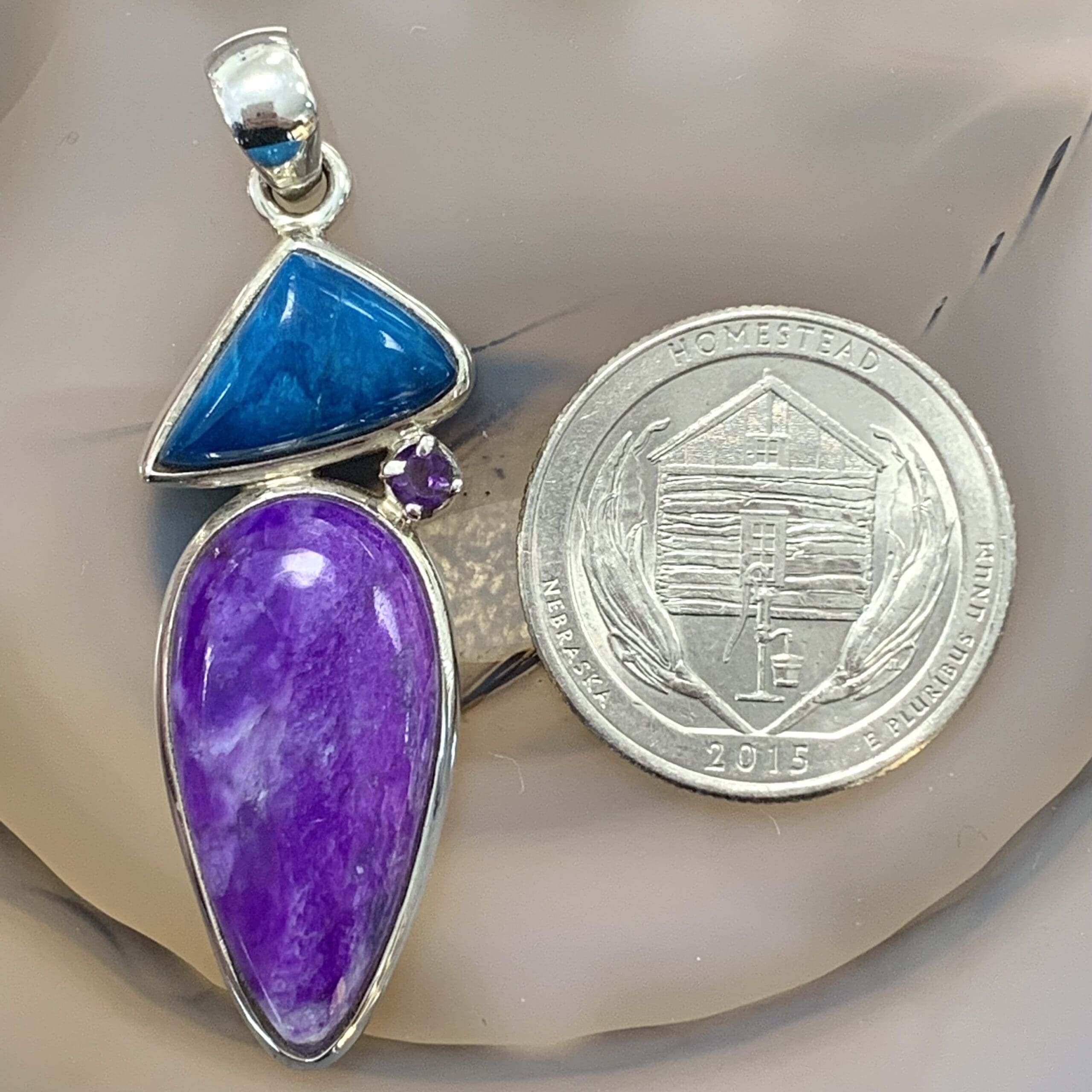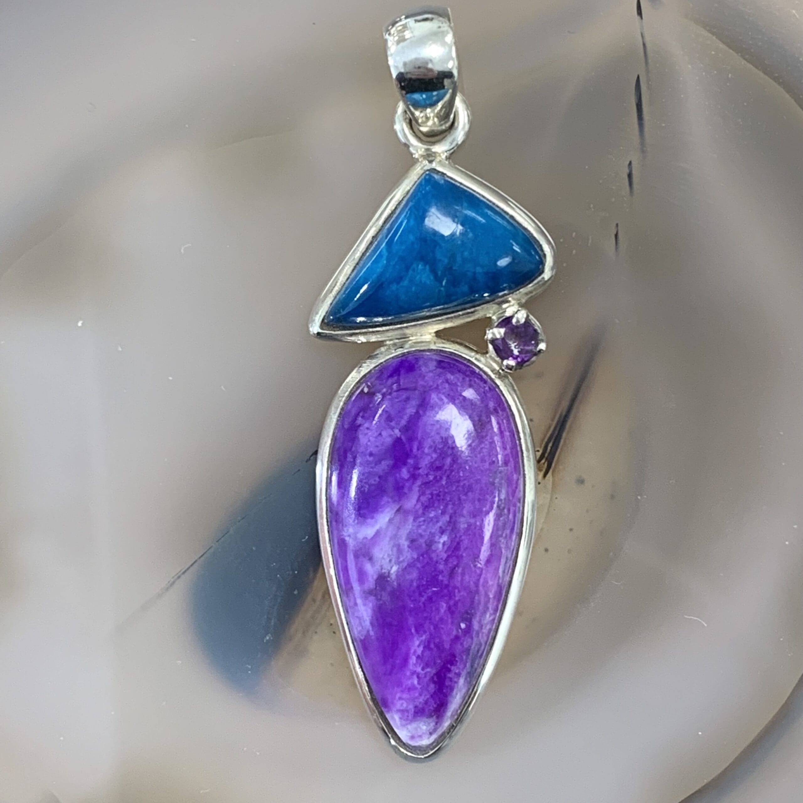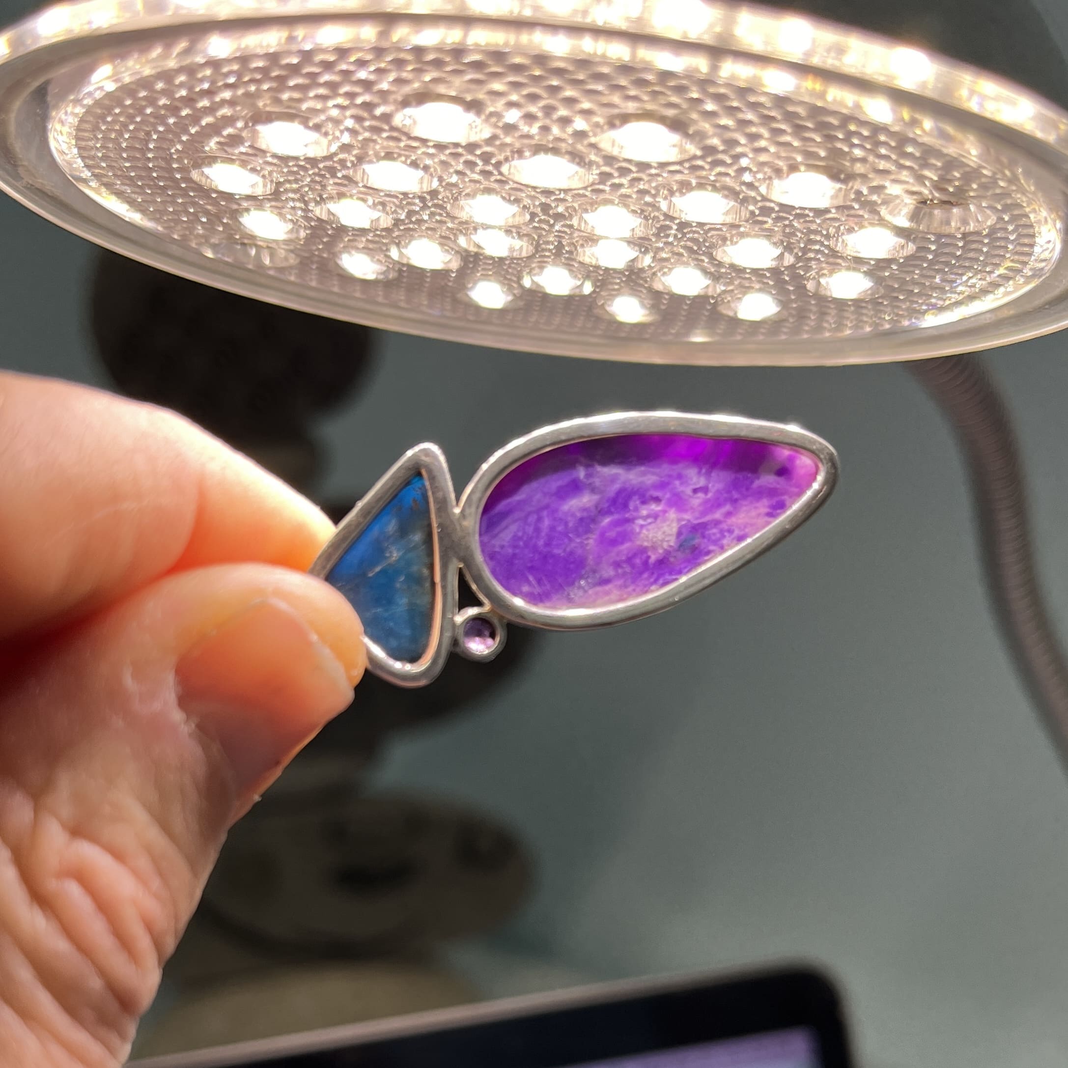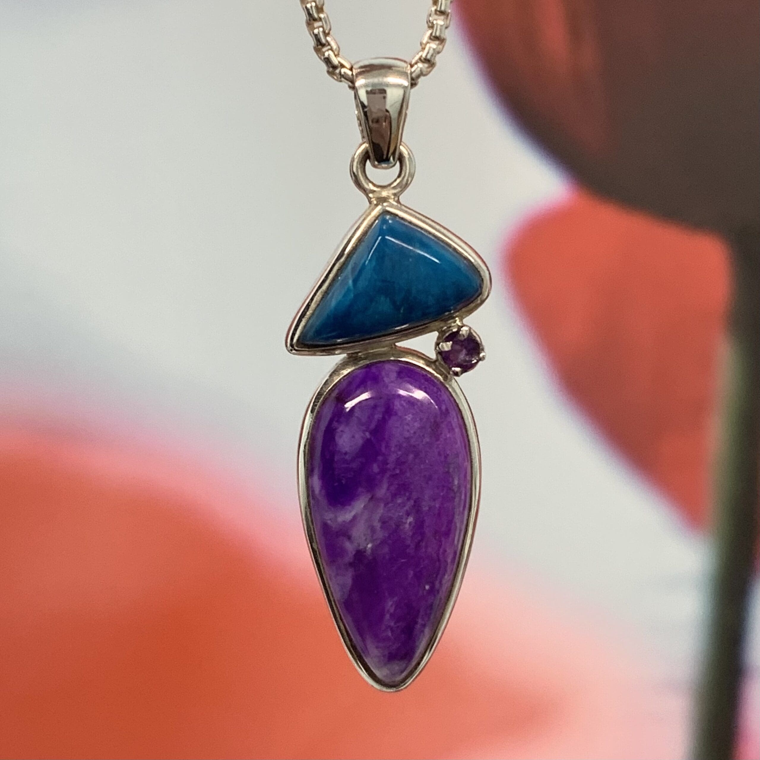 Stellar piece, might have been made in the 90’s or early 200’s, with the composite construction of a tiny Amethyst and a bigger, sail-shaped polished blue Cavansite (from India, where it was crafted). Of course Sugilite is the rare (mined out in the 70’s & 80’s) Manifestation Stone that is one of our favorite materials, particularly with the translucent pink gel that everyone loves. And you can see how “photosynergistic” it is, brightening up, the more light you put on it. Width: 1.5cm; Height: 5.1cm; Depth: .5cm Weight: 38ct Origin: Africa, South Africa