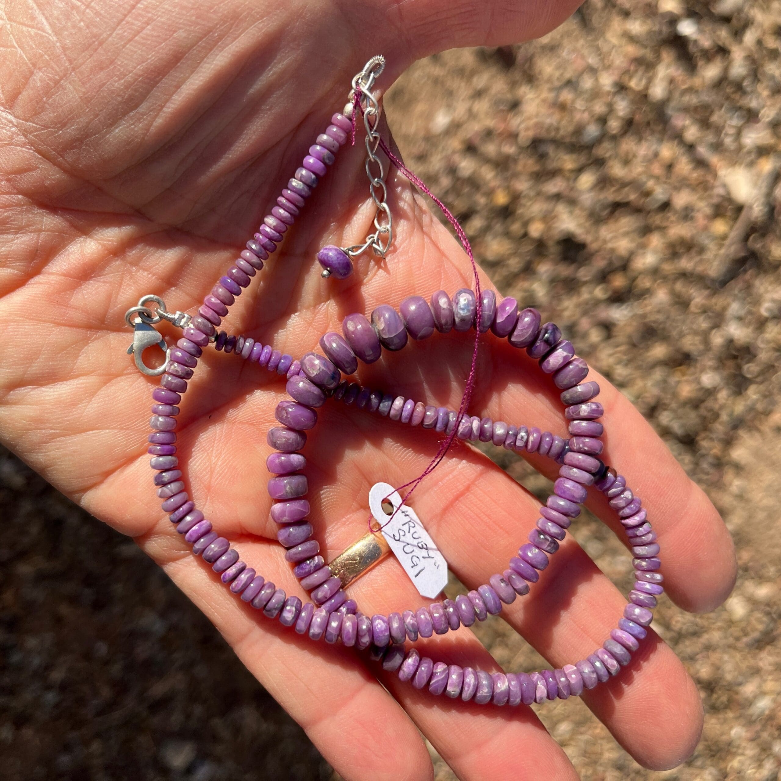 Pink Purple, mostly pink gel. Bead diameter ranges from 3.72mm to 8.86mm. Length: 47.6cm Weight: 99.5ct Origin: Africa, South Africa