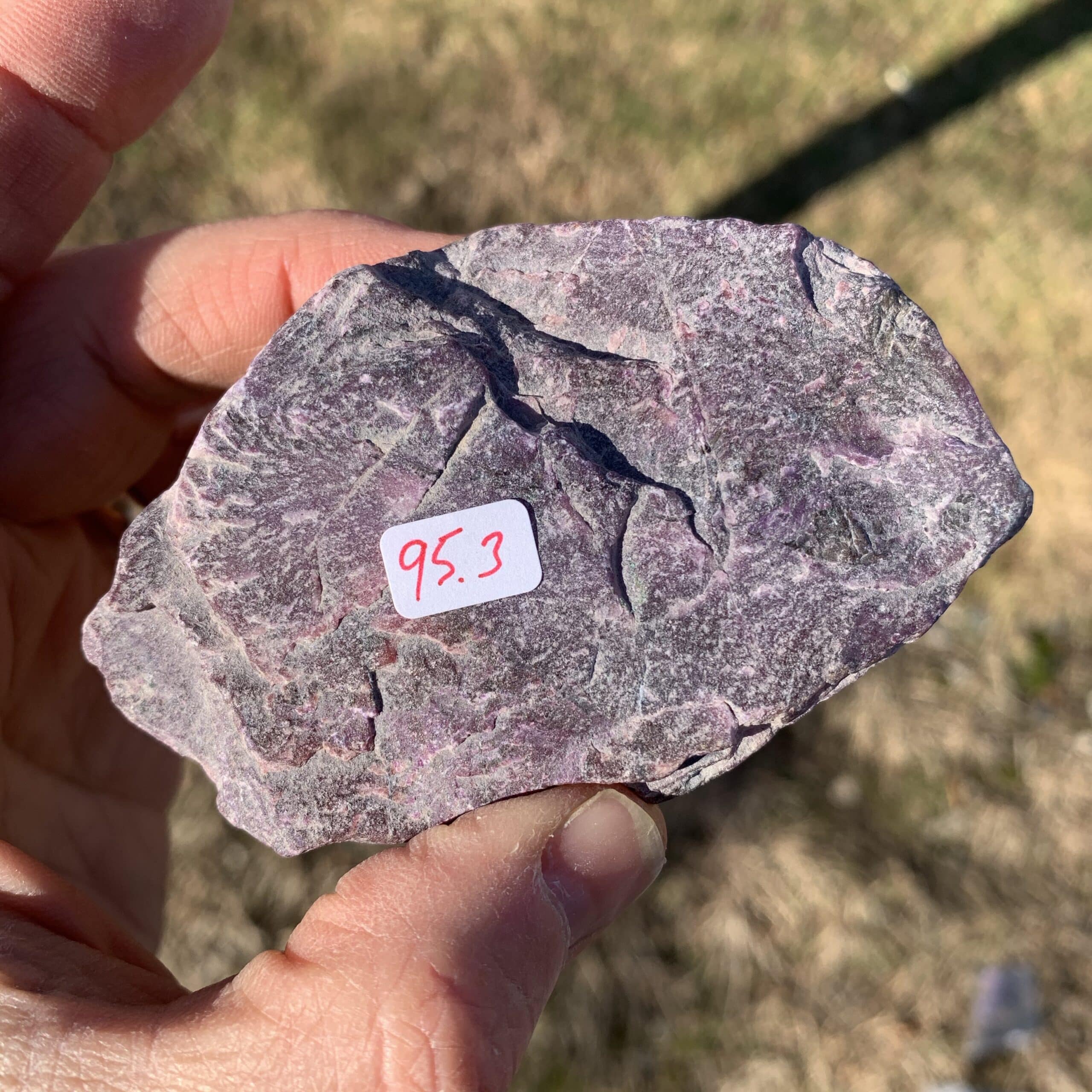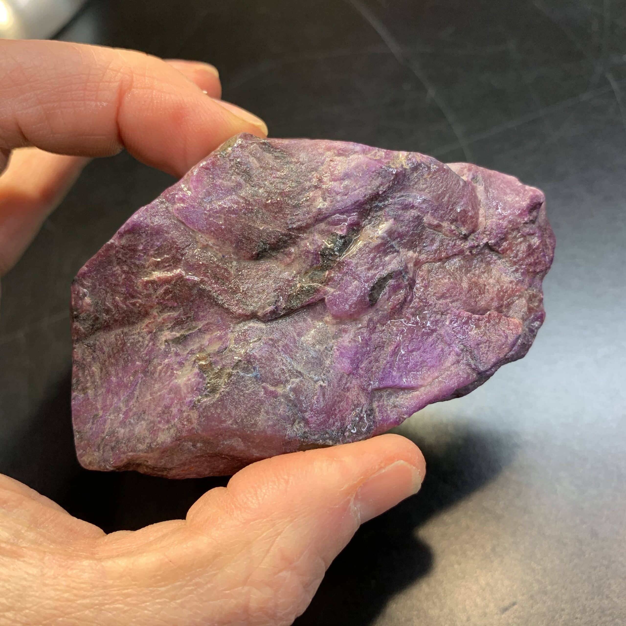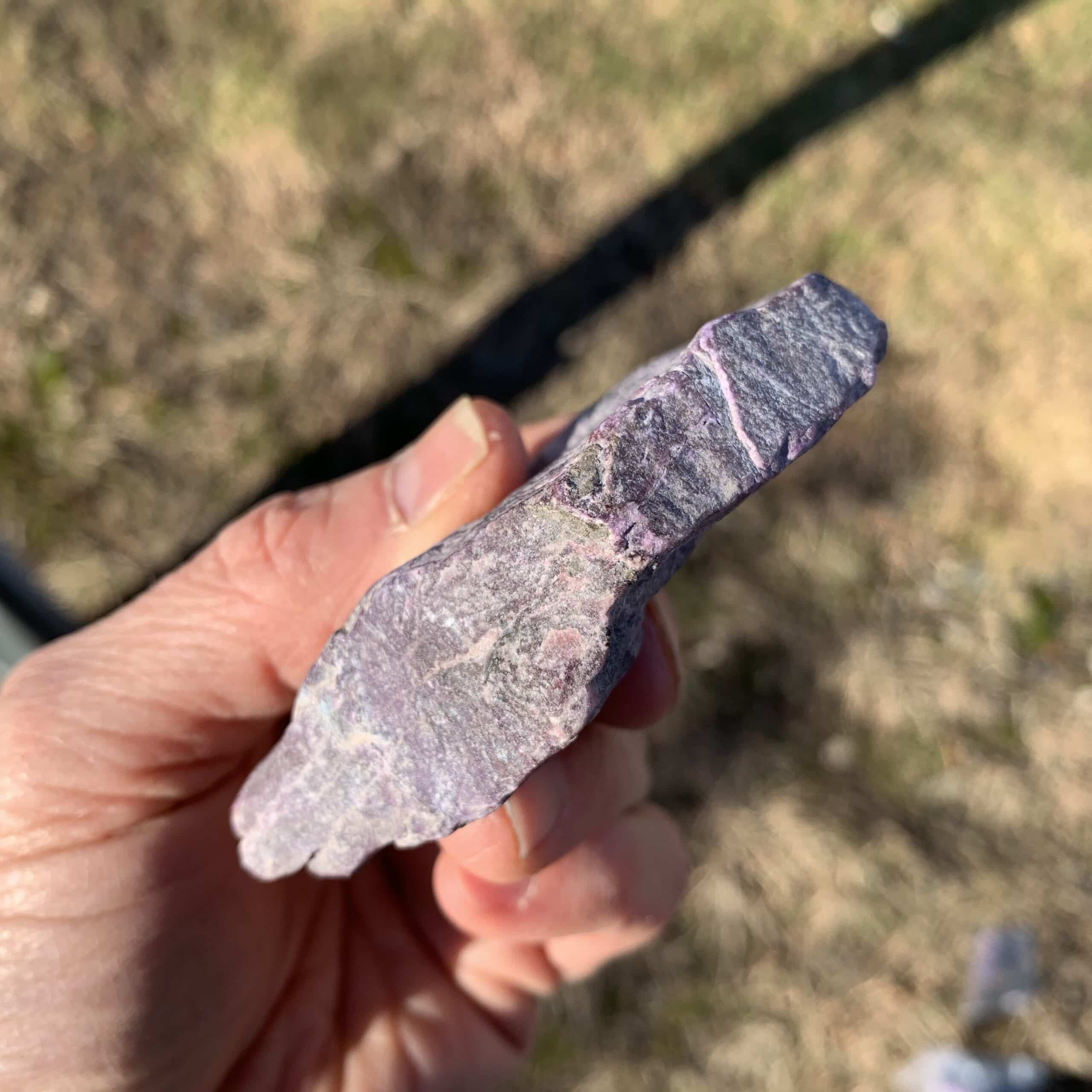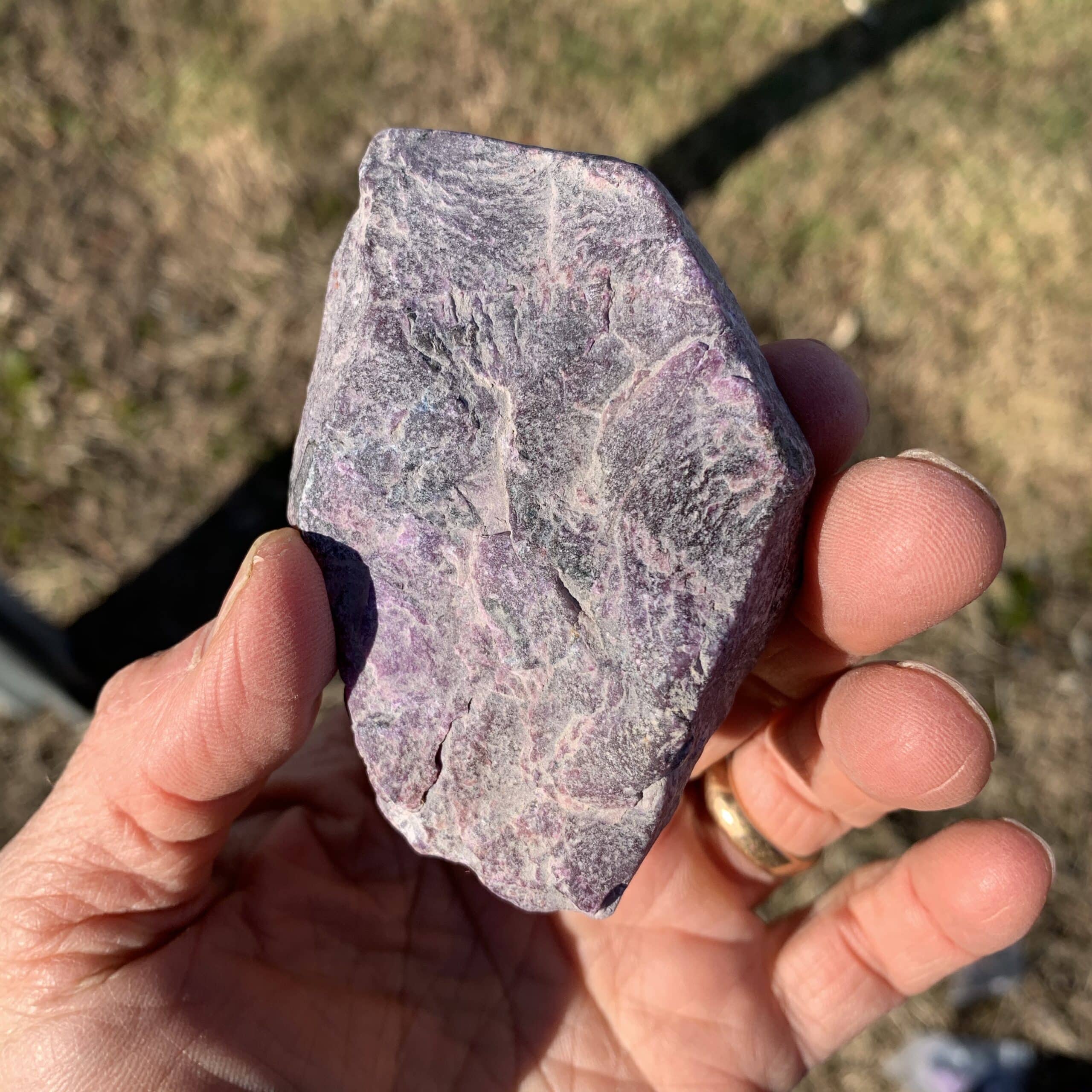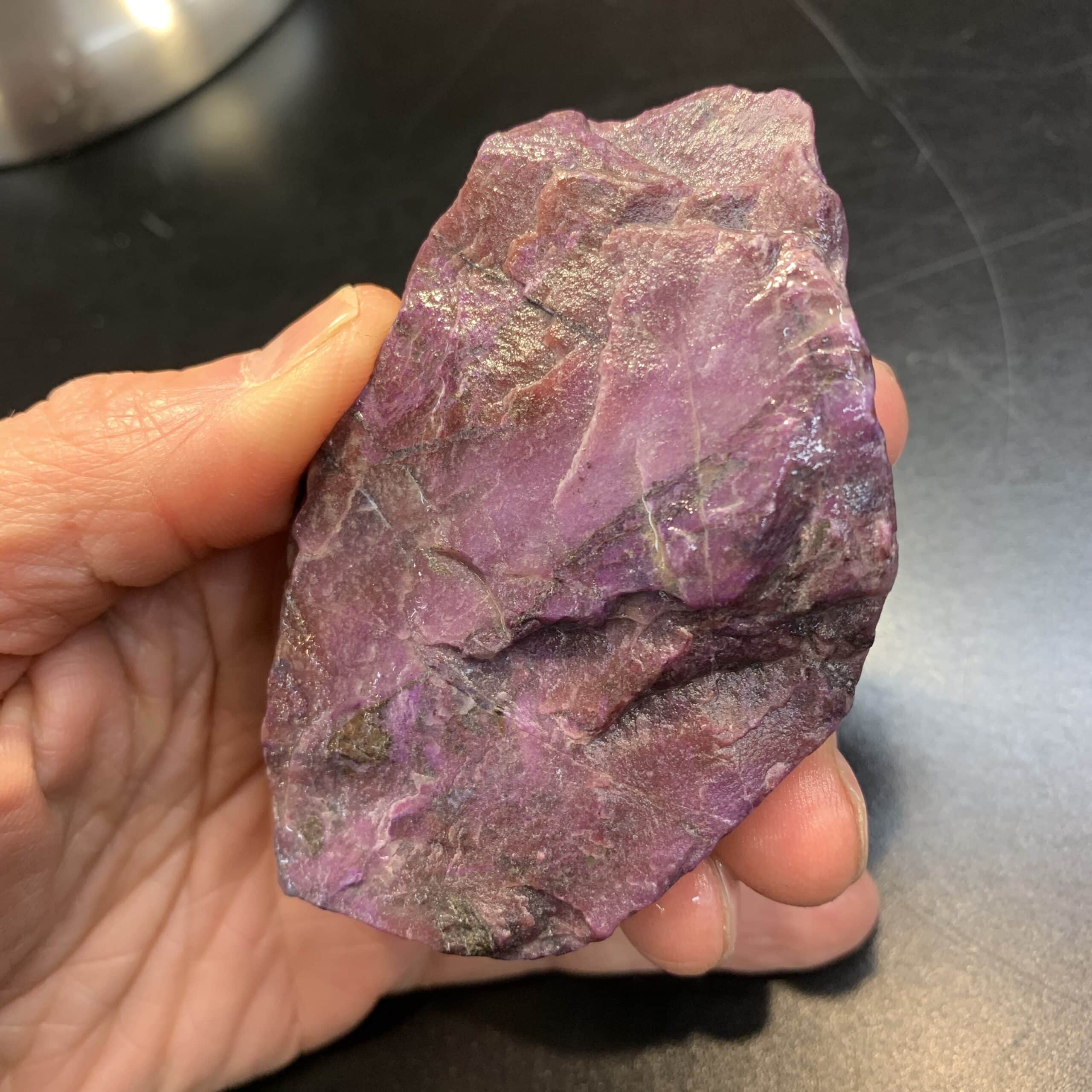 Photo note: this piece is pictured wet (without oil) in the first photo (one side) indoors; outdoor photos follow, and are dry (also without oil). It’s waxy to the touch and shows gel on the edges that aren’t too thick for the light to penetrate. In our Crystal Concentrics paradigm, Sugilite is the ultimate Manifestation Stone, acting by celestial osmosis to bring into being what you hope and seek for. Sugilite comes from South Africa, was mined out in the 70’s and 80’s, and most of what’s available on the market today is disappointingly impure and low grade. Also, most vendors portray it with poor color reproduction and wet, so it looks like it might if it were cut and polished. You can see water on Kyle’s hand on the pieces shown wet. We like to show you what they look like dry too (as possible), ’cause that’s the truest test of the stone’s quality. The color is more vibrant when seen wet (or if polished). Sugilite is one of our favorite types of stones, and we’re hoping to set a new standard in grading and presentation quality for this extraordinary variety. Feel free to contact us with interest, as much of our merchandise is off line. We can post more pieces depending on your interest. Our prices on this material are not so flexible, because we’ve put a lot of energy into seeking, grading and marking these appropriately, relative to one another. The more a piece is, the more rare and deserving it is of having that price tag applied to it. Once you familiarize yourself with our inventory, you’ll understand how we’ve arrived at each unique price. Feel free to contact us with any questions. Oh, and in closing, you’ll notice that we also prefer natural pieces, uncut or polished (unless in or for jewelry), with harmoniously pleasing shapes and uniformity of color wherever possible. Length: 8.4cm; Width: 5.3cm; Depth: 2cm Weight: 95.3g (3.36oz) Origin: Africa, South Africa
