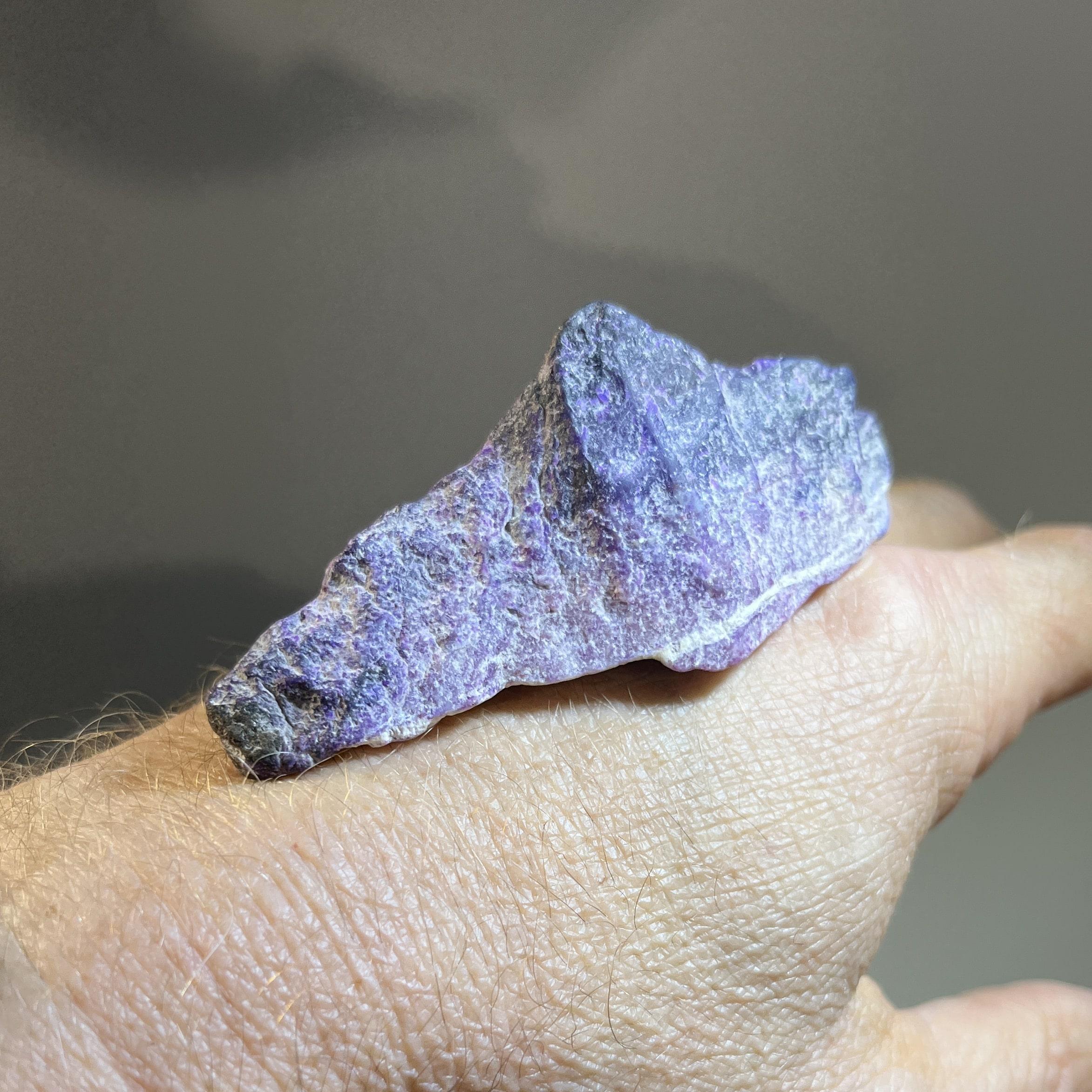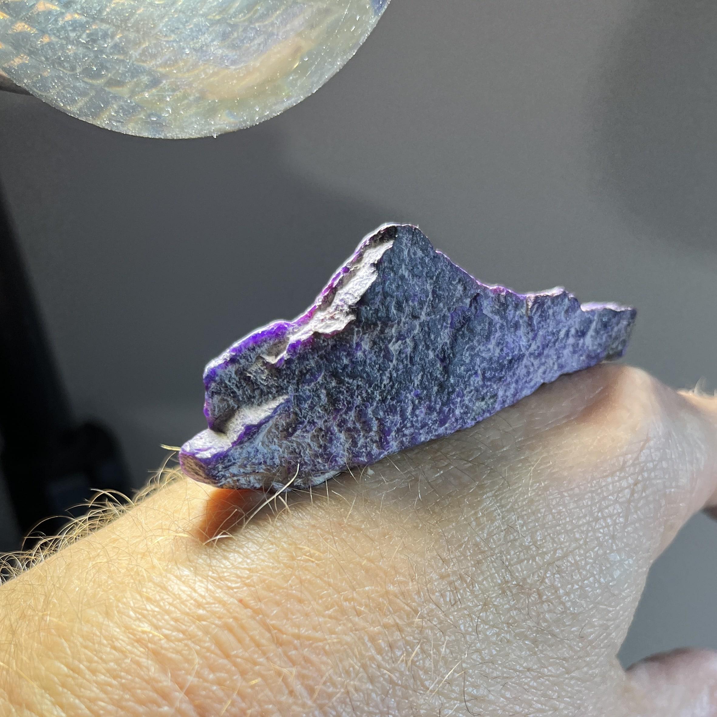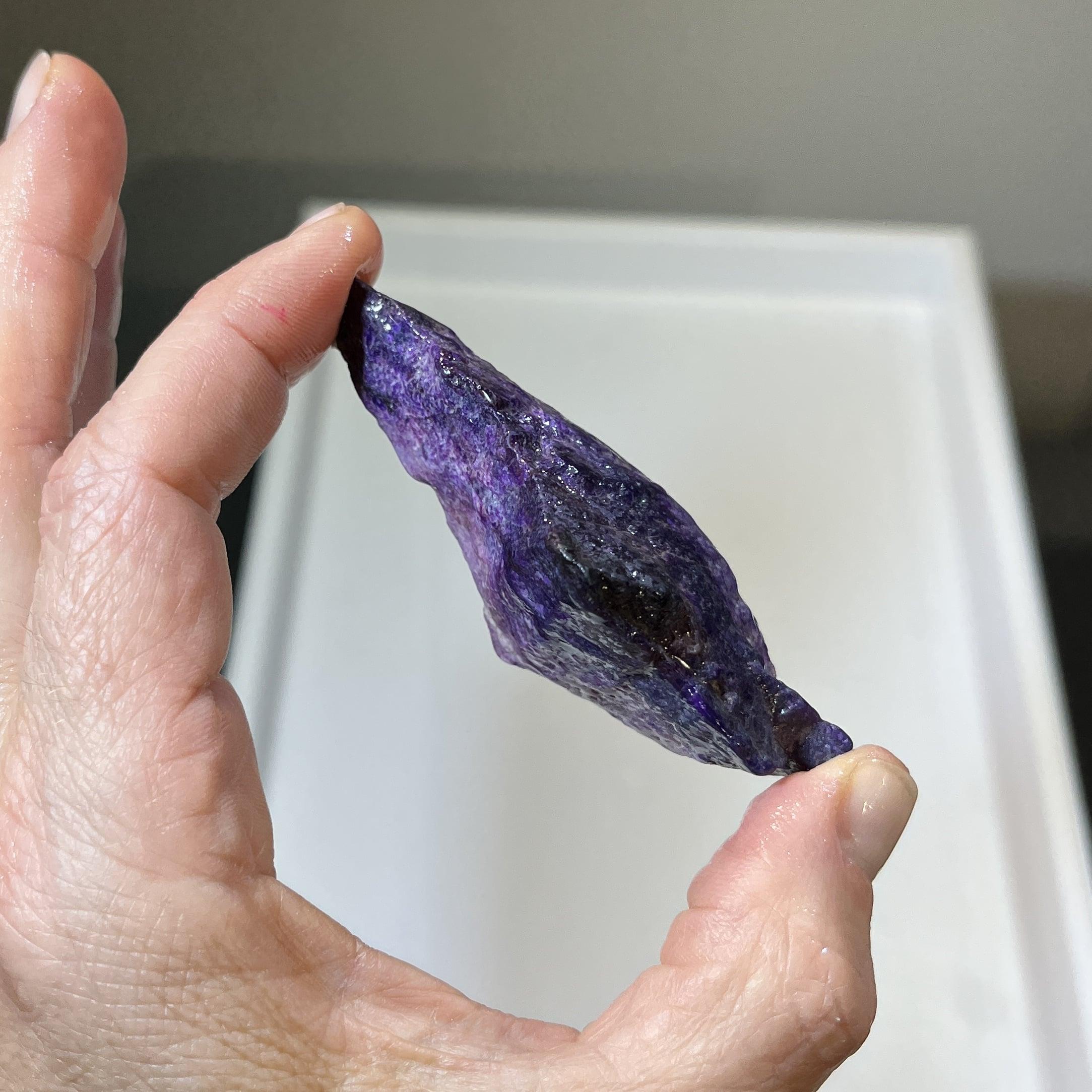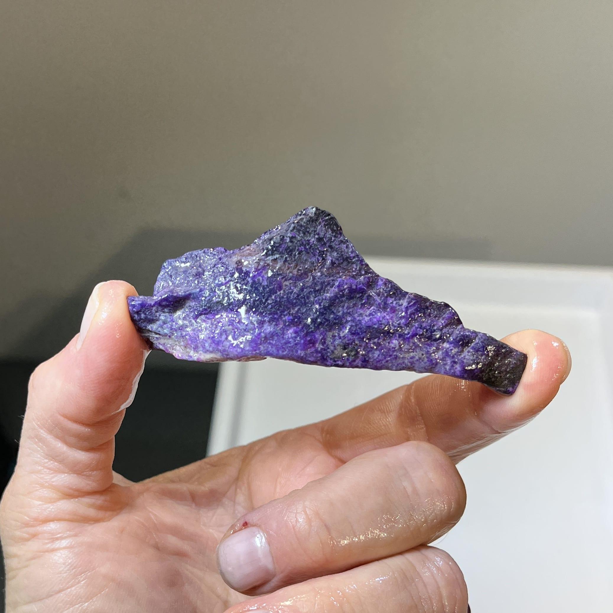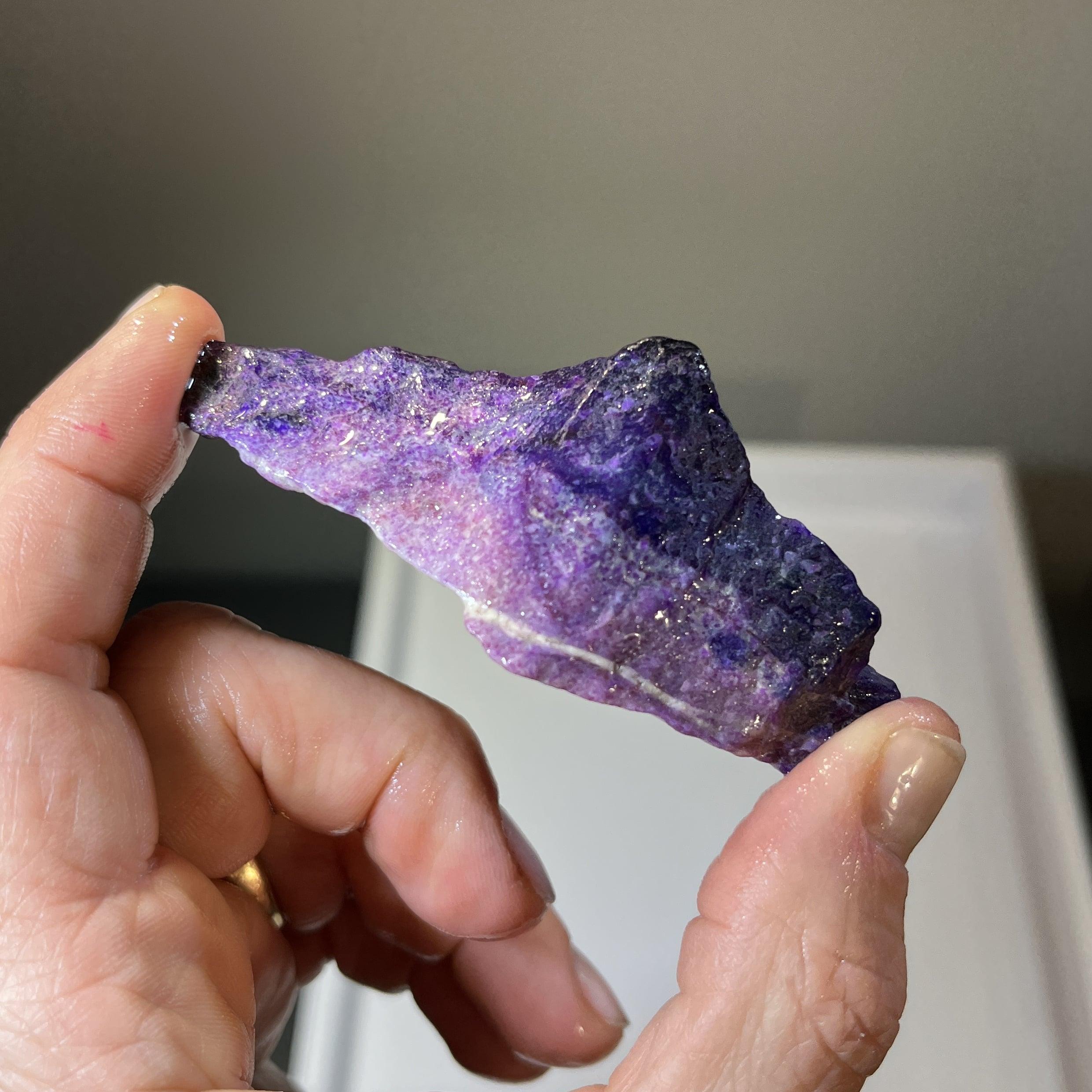 Quite a nice example of what we call Rainbow Sugilite – because of the variety of colors (including pink, but importantly, not black) – and notice the ridge of gel when it’s backlit. The peak is dark, and this might be a good candidate for oiling (not something we would do). Please notice that about half our photos of each piece are wet, and half are dry, to show you what they look like in both circumstances (not just one, as others often do). We sell our larger pieces un-oiled as a rule (and tell you if ever it’s otherwise), but you may wish to oil, to see the color more consistently (ie. so it’s shinier even when it’s not wet). Just know that for resale, buyers often like the piece unadulterated. In our Crystal Concentrics paradigm, Sugilite is the ultimate Manifestation Stone, acting by “celestial osmosis” to bring into being what you hope and seek for. Sugilite comes from South Africa, was mined out in the 70’s and 80’s, and most of what’s available on the market today is disappointingly impure and low grade. Also, most vendors portray it with poor color reproduction and only in the most complementary lighting. You can see water on Kyle’s hand on the pieces shown wet. We like to show you what they look like dry too (as possible), ’cause that’s the truest test of the stone’s quality. The color is more vibrant when seen wet (or if polished). Sugilite is one of our favorite types of stones, and we’re hoping to set a new standard in grading and presentation quality for this extraordinary stone variety. Feel free to contact us with interest, as much of our merchandise is off line. We can post more pieces depending on your interest. Our prices on this material are not so flexible, because we’ve put a lot of energy into seeking, grading and marking these appropriately, relative to one another. The more a piece is, the more rare and deserving it is of having that price tag applied to it. Once you familiarize yourself with our inventory, you’ll understand how we’ve arrived at each unique price. Also know that the prices go up with time, so you’ll want to avail yourself of our current pricing. Feel free to contact us with any questions. Oh, and in closing, you’ll notice that we also prefer natural pieces, uncut or polished (unless in or for jewelry) – with harmoniously pleasing shapes and uniformity of color – whenever possible. Length: 7.6cm; Height: 3.3cm; Depth: 2.8cm Weight: 47.2g (1.66oz) Origin: Africa, South Africa